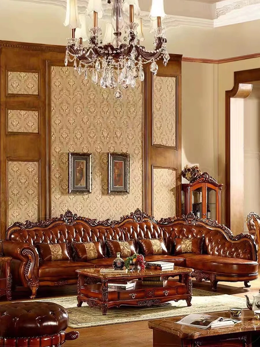 エレガントな欧州スタイルの本革ソファ、リビングルーム用L字型コンビネーション。美しい木彫りデザインと高品質なトップグレード牛革を使用した、大小どんなお部屋にもフィットする完璧な家具。