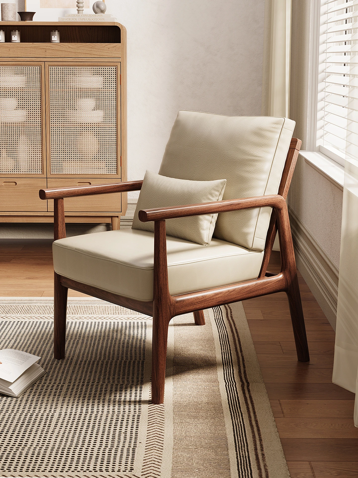 高級感あふれる無垢材シングルソファチェア - シンプルでレトロなデザイン、モダンなリビングにぴったり!本革の背もたれとアームレスト付きで、バルコニーでもくつろげるリラックスチェア。