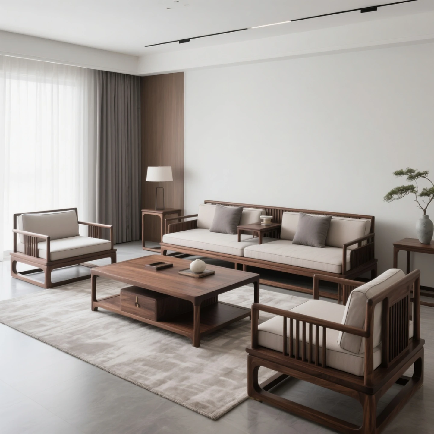 Elegant New Chinese Style Black Walnut Wood Sofa Set – Zen-Inspired Solid Wood and Fabric Sofa for Small Apartments and Villas – Minimalist Furniture for Modern Living Spaces