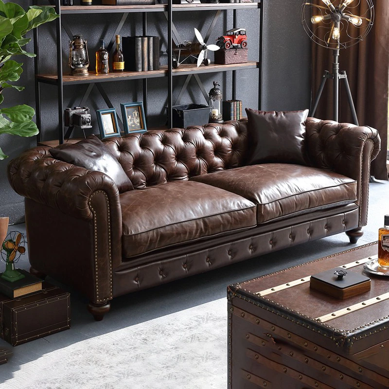 Classic American Leather Three-Seater Sofa - Vintage Style with Pull Tabs, Perfect for Your Cigar Room or Villa Living Room, Crafted from Durable Oiled Wax Leather