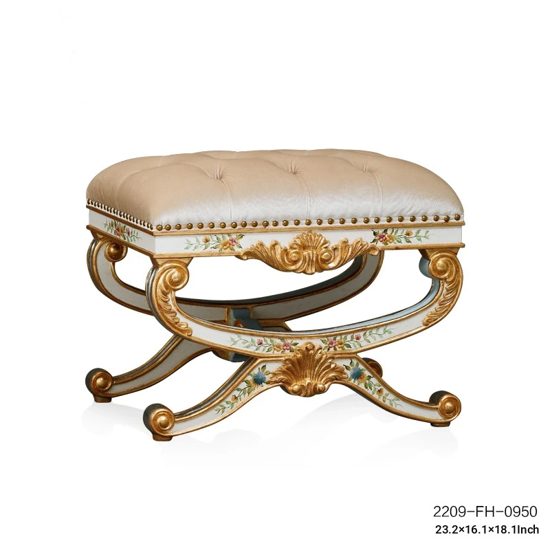 Julianne French Romantic Solid Wood Carved Gold Foil Accent Stool - Perfect for Villa Bedrooms, Dressing Areas, and Living Room Shoe Changes!