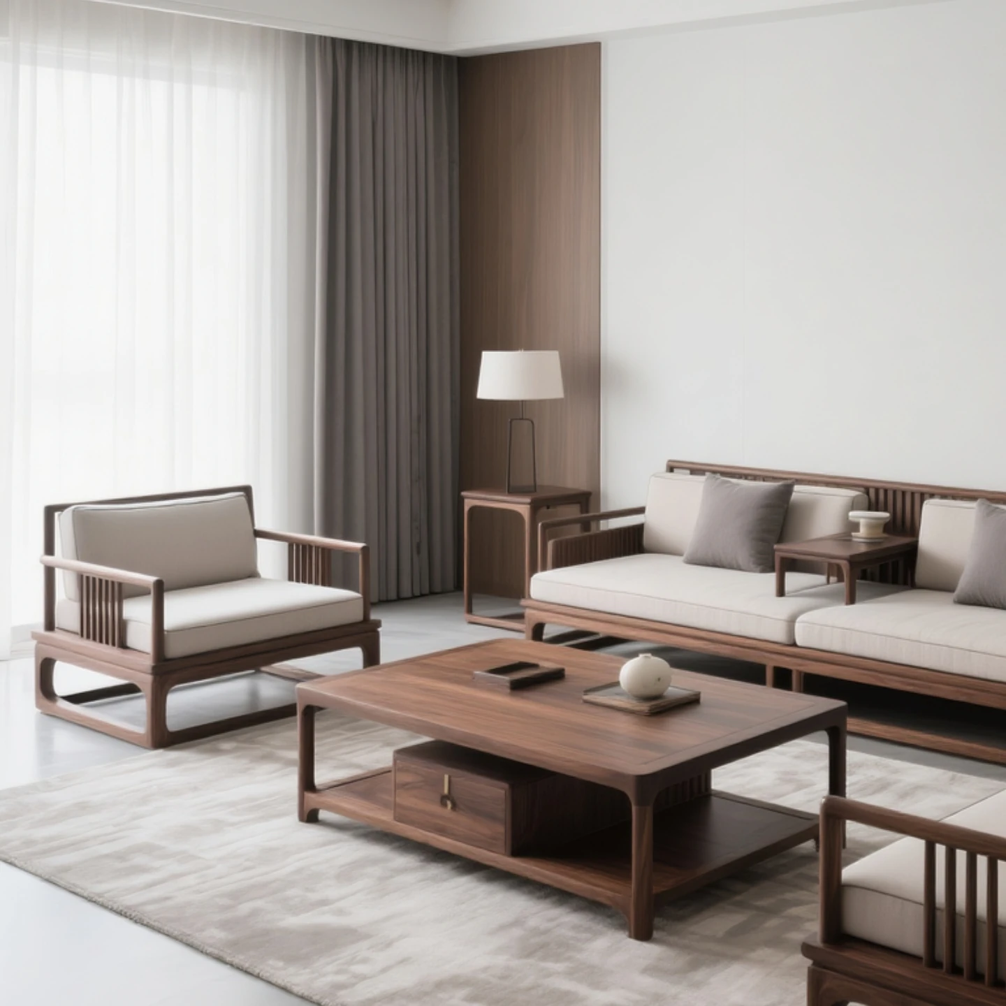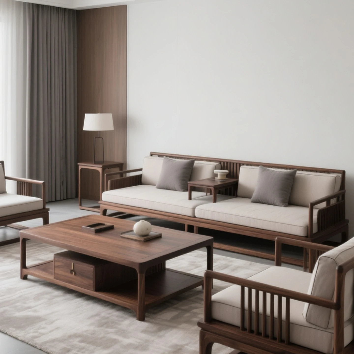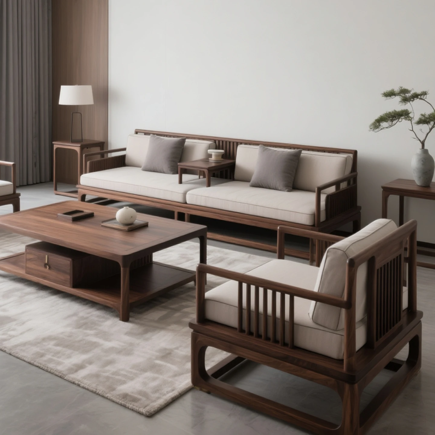 Elegant New Chinese Style Black Walnut Wood Sofa Set – Zen-Inspired Solid Wood and Fabric Sofa for Small Apartments and Villas – Minimalist Furniture for Modern Living Spaces