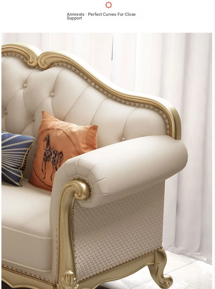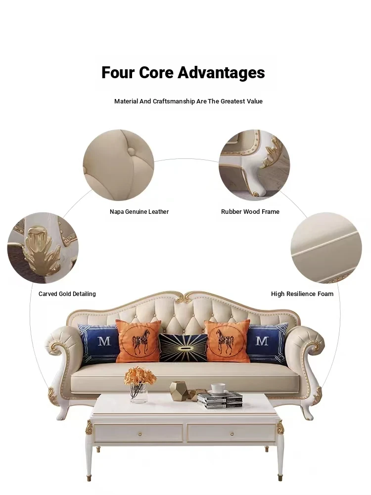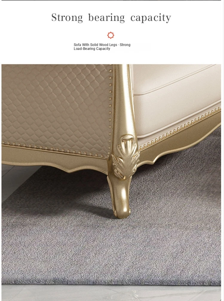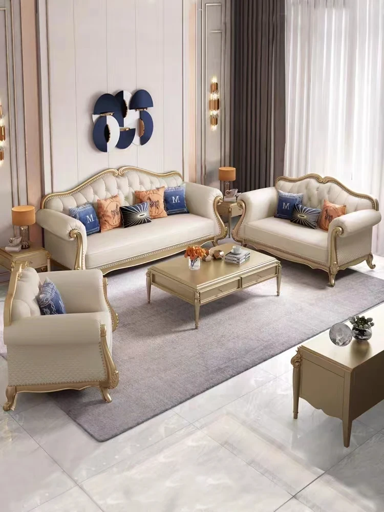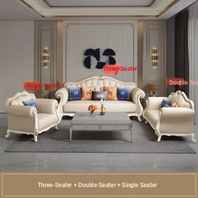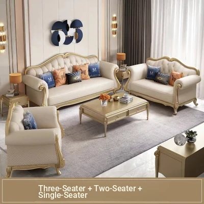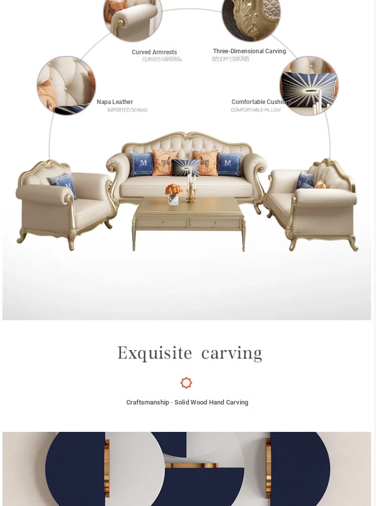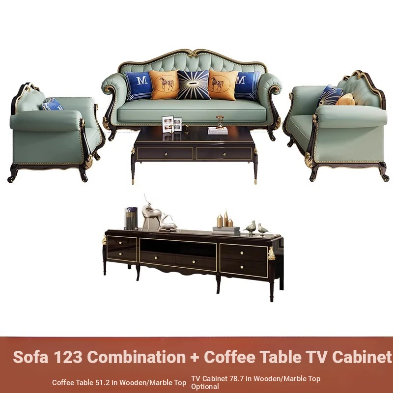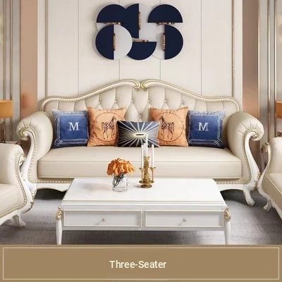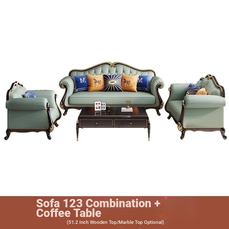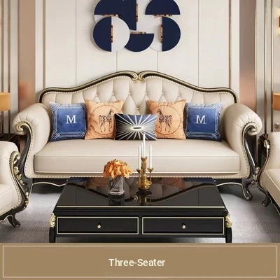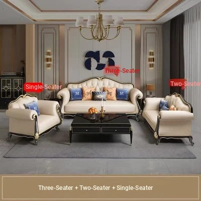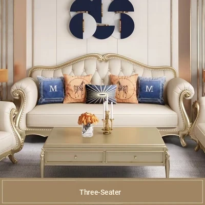 Genuine Leather Sofa Set 123 - American Light Luxury Solid Wood Carved European Style for Small Spaces - Top Grain Leather Three-Seater for Elegant Living Rooms