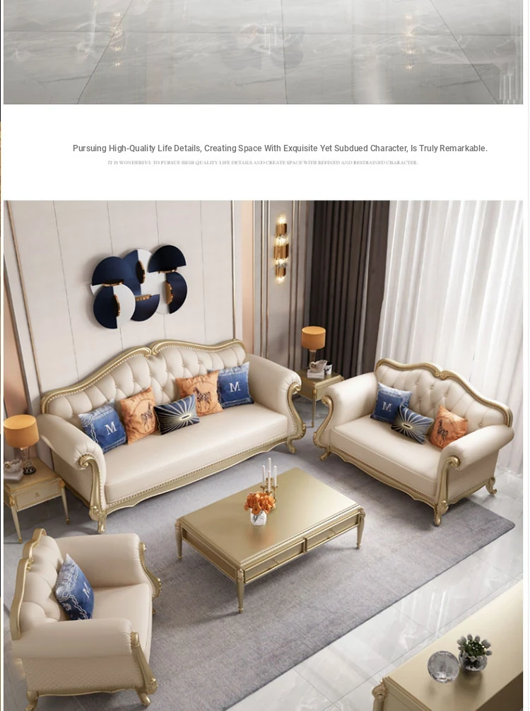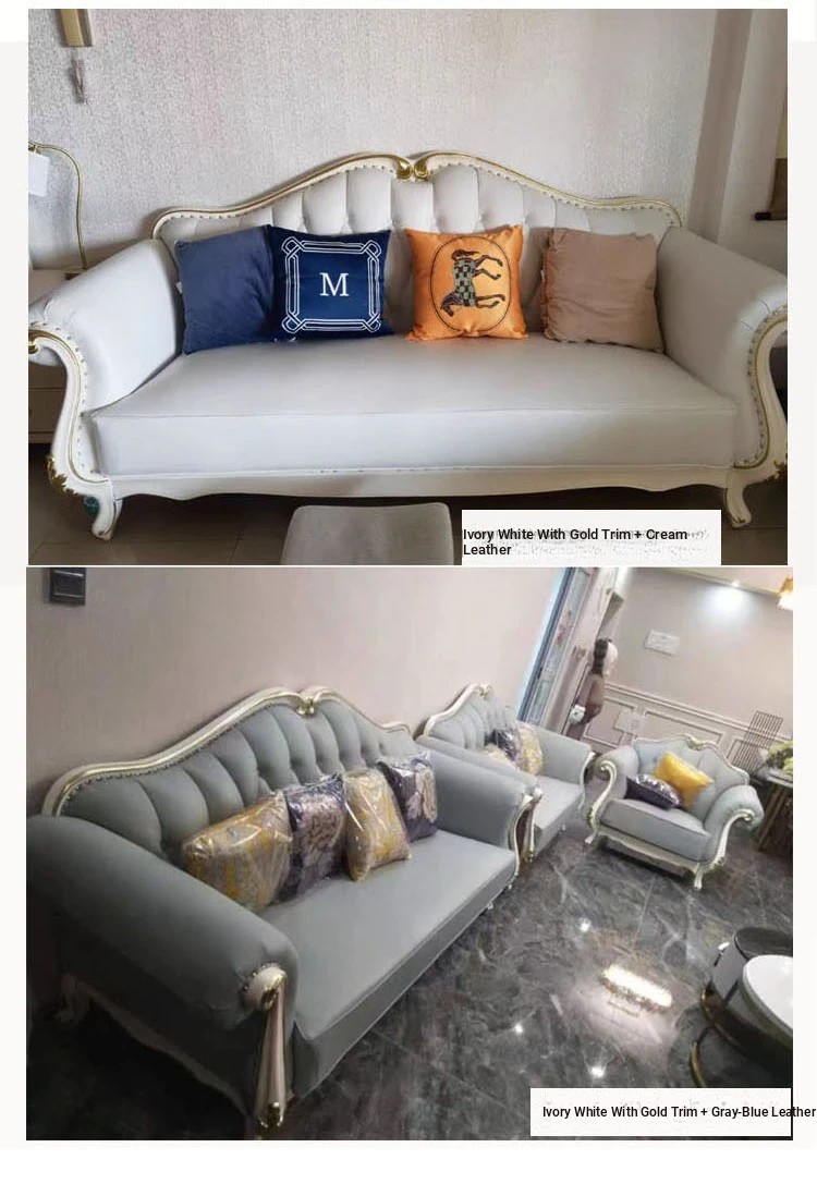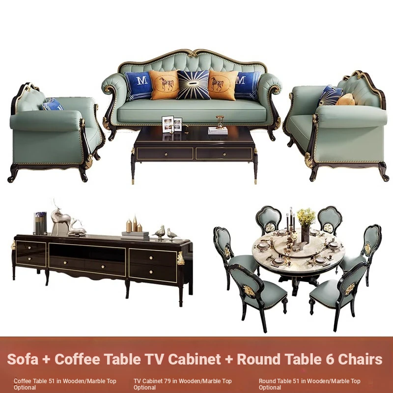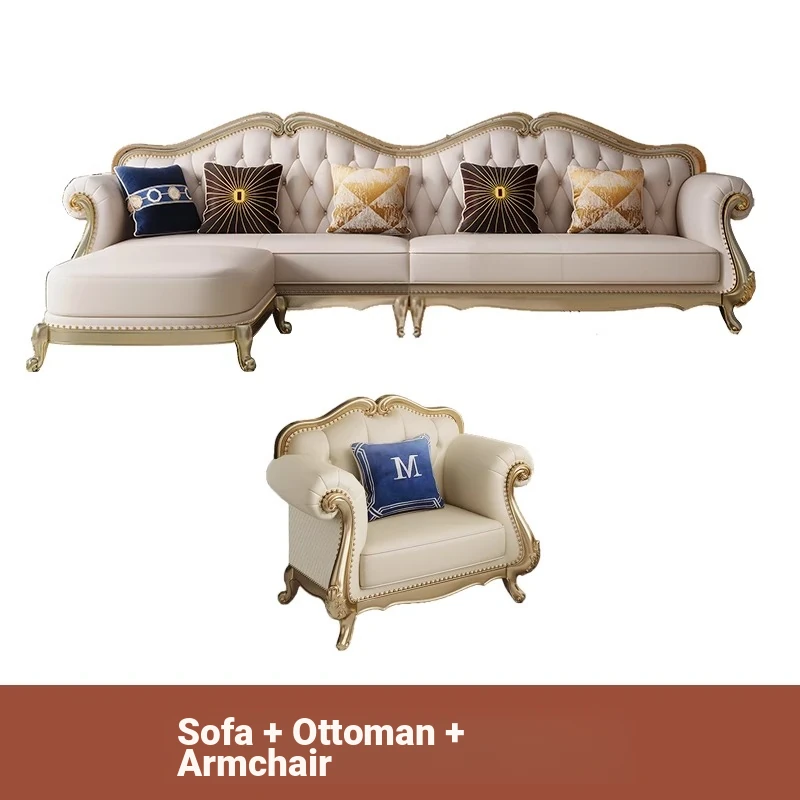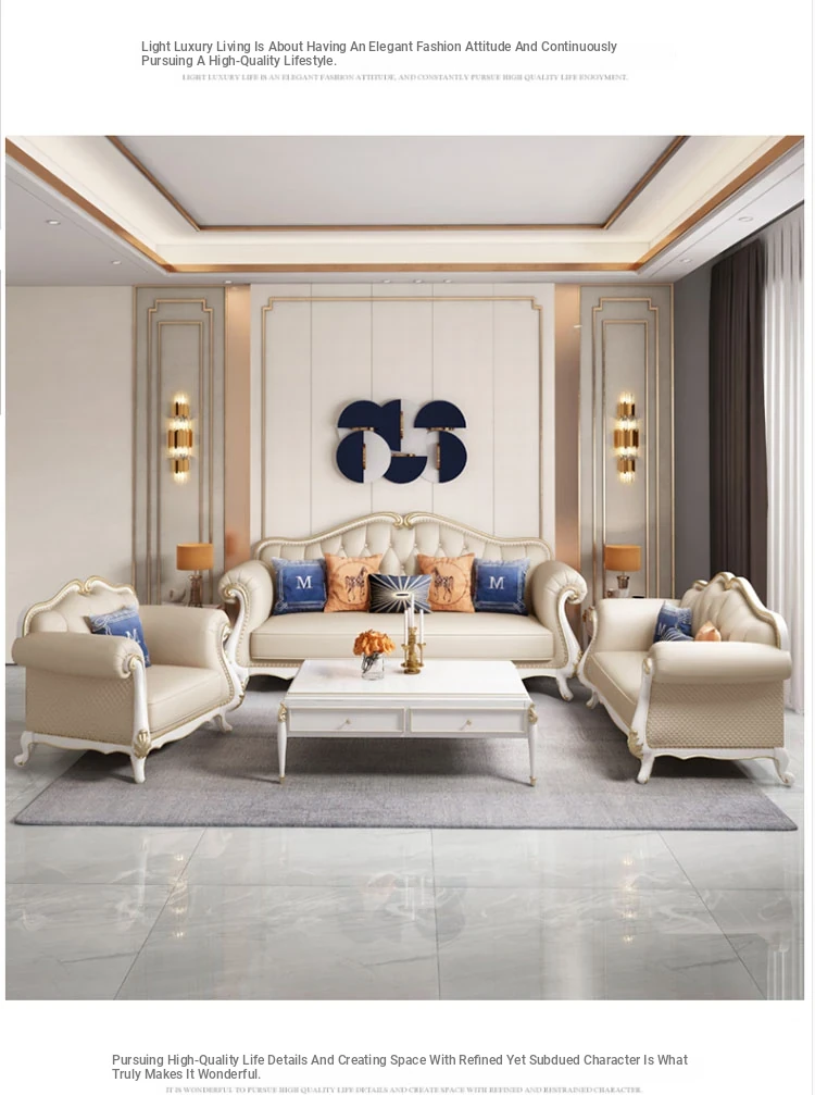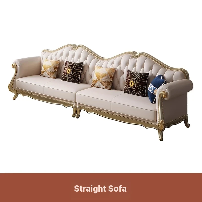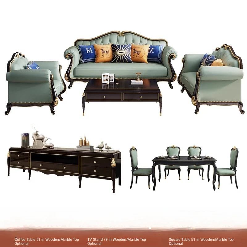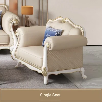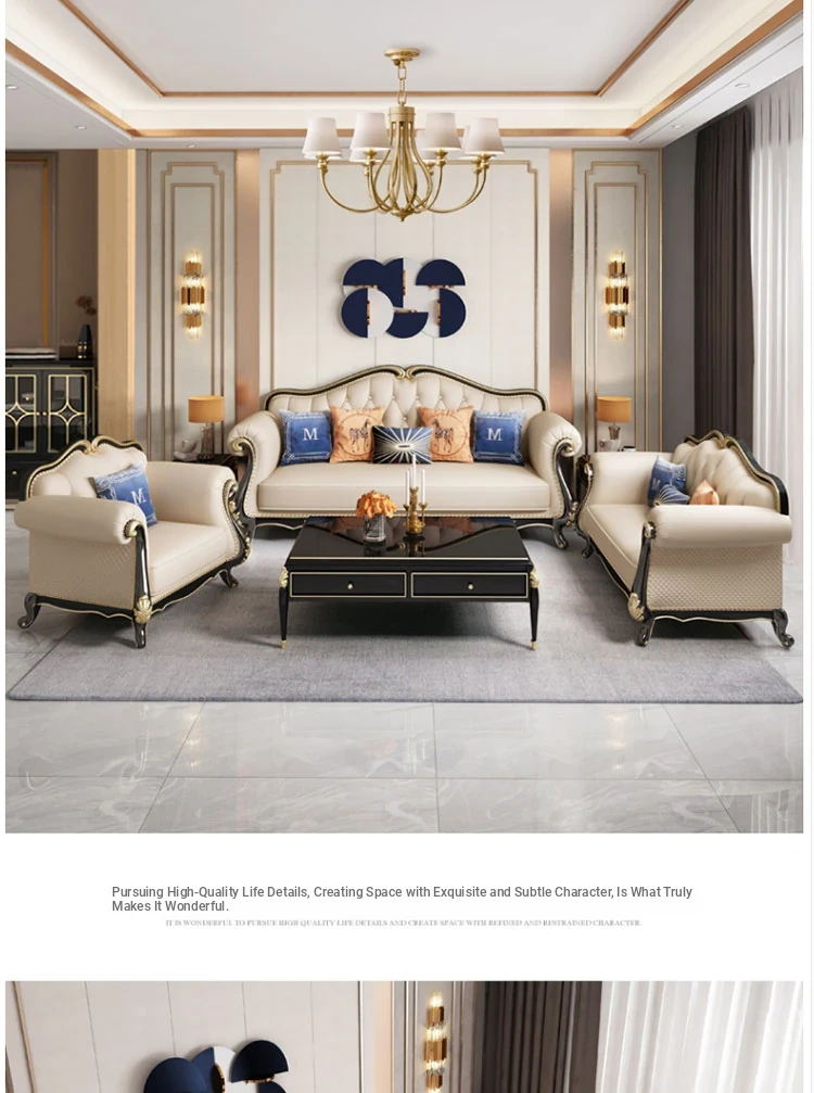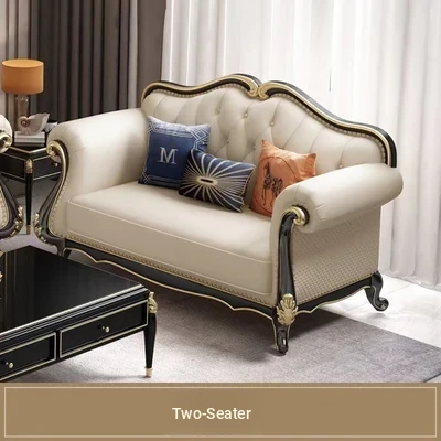 Genuine Leather Sofa Set 123 - American Light Luxury Solid Wood Carved European Style for Small Spaces - Top Grain Leather Three-Seater for Elegant Living Rooms