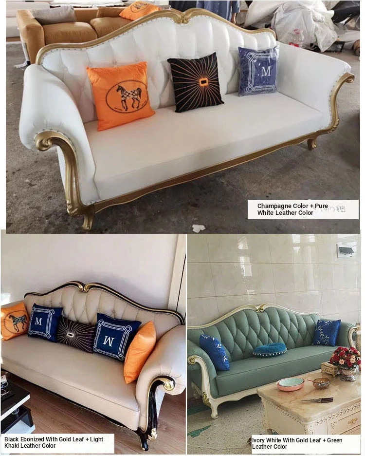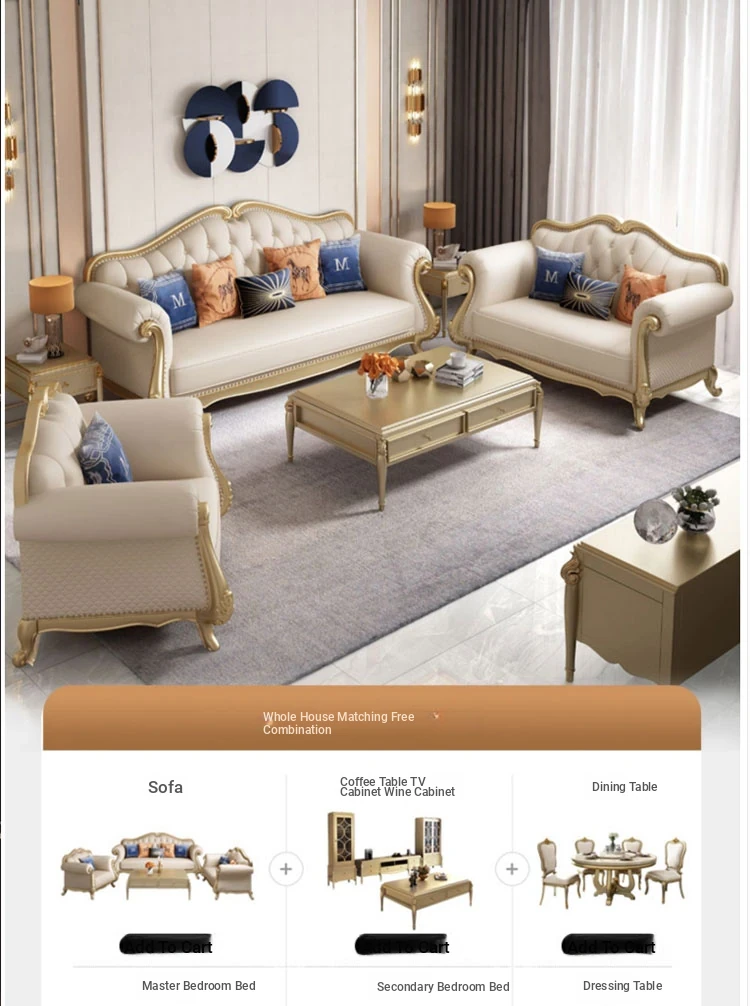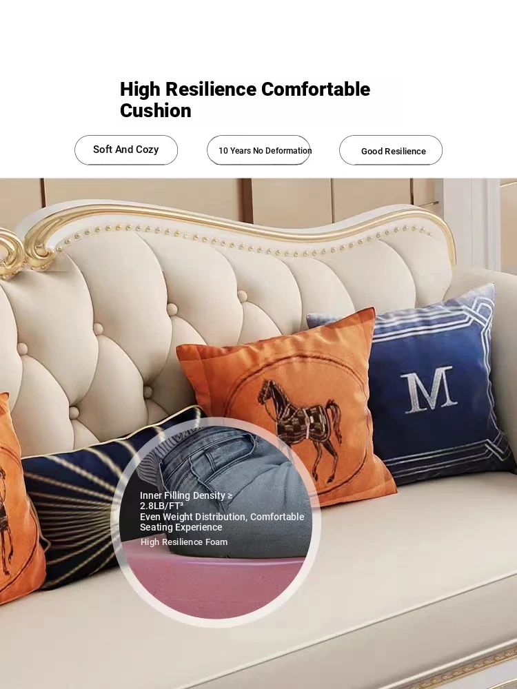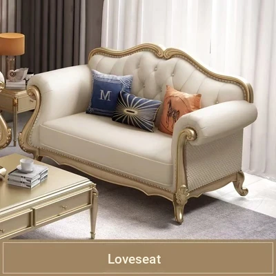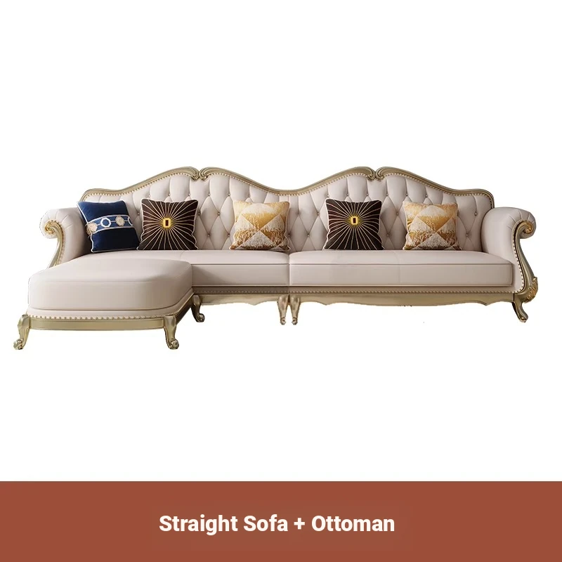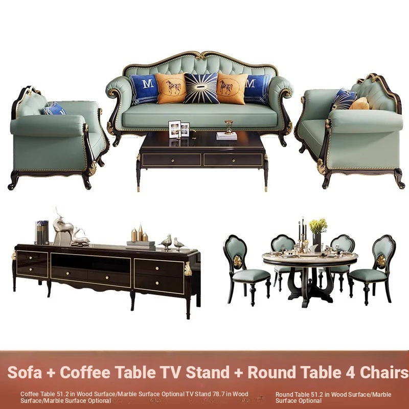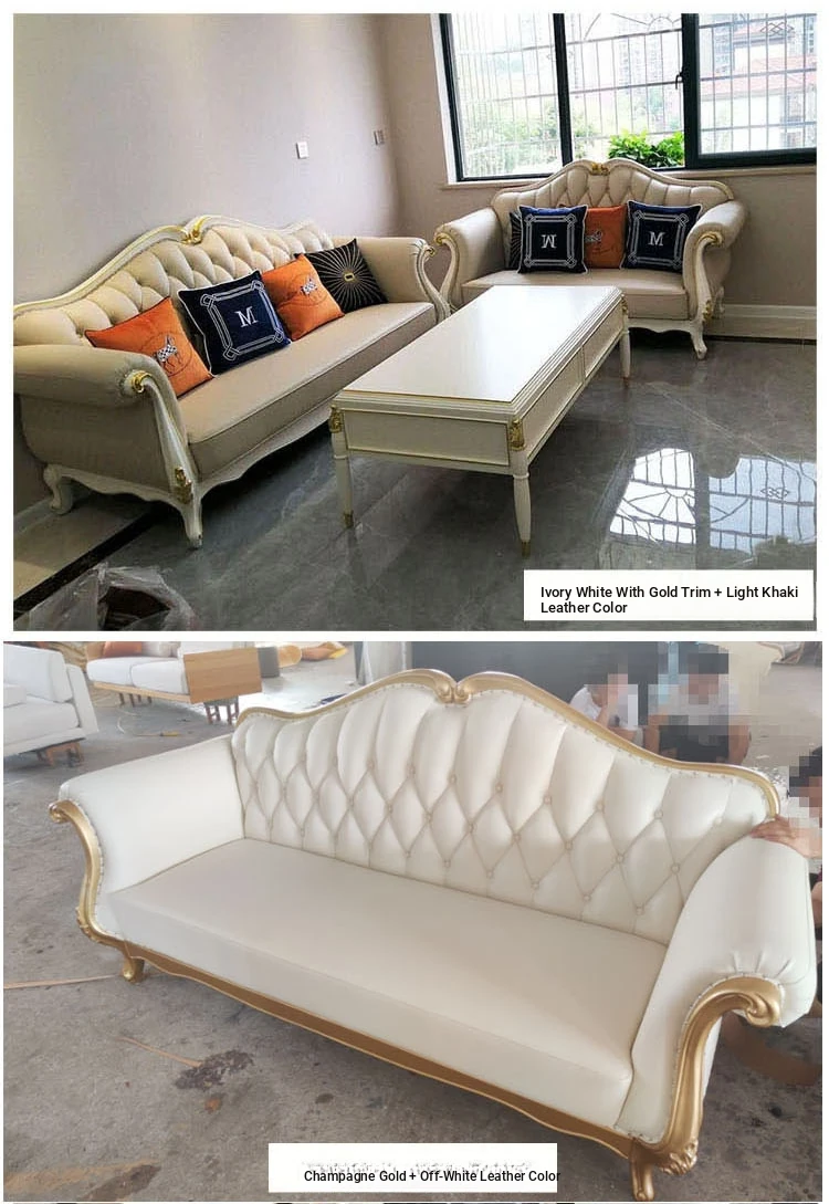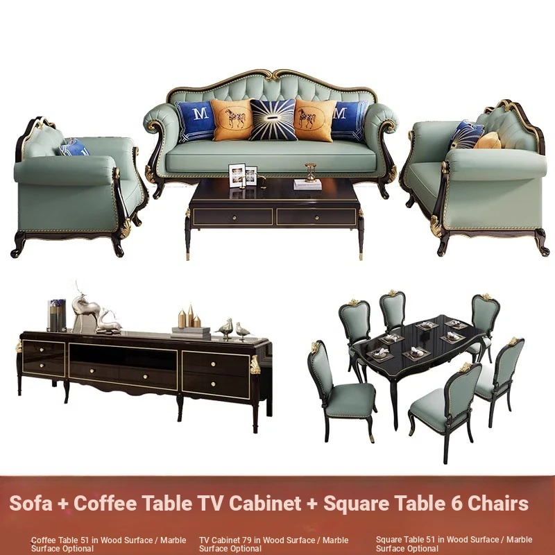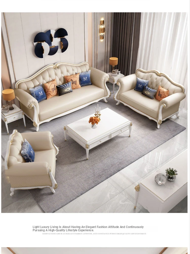 Genuine Leather Sofa Set 123 - American Light Luxury Solid Wood Carved European Style for Small Spaces - Top Grain Leather Three-Seater for Elegant Living Rooms
