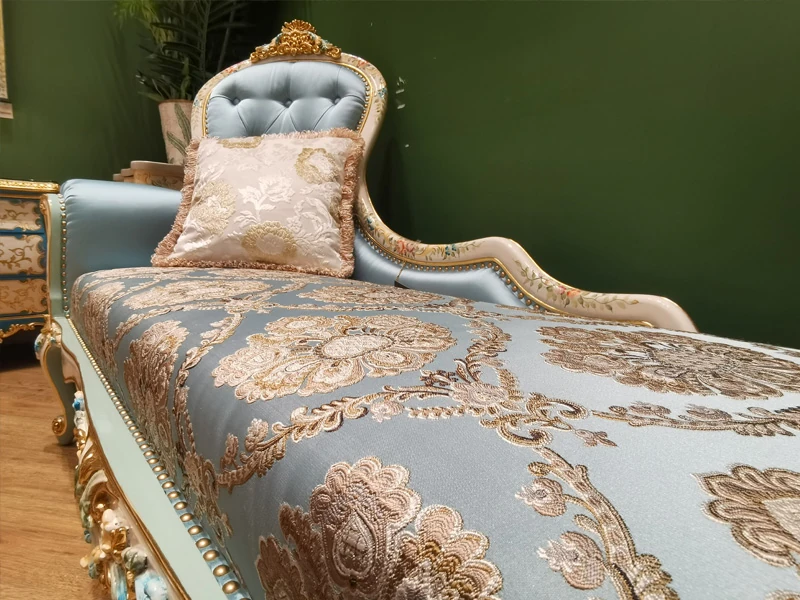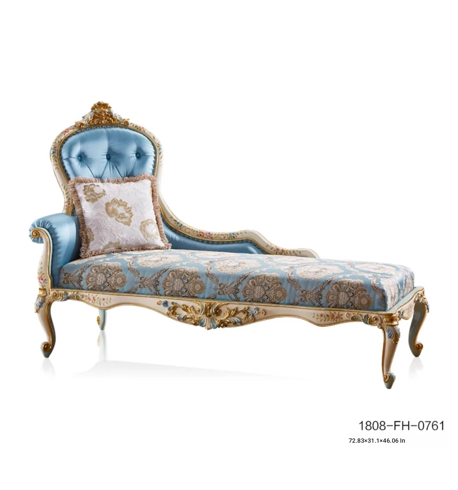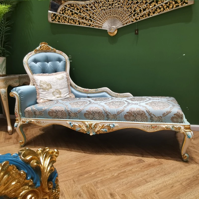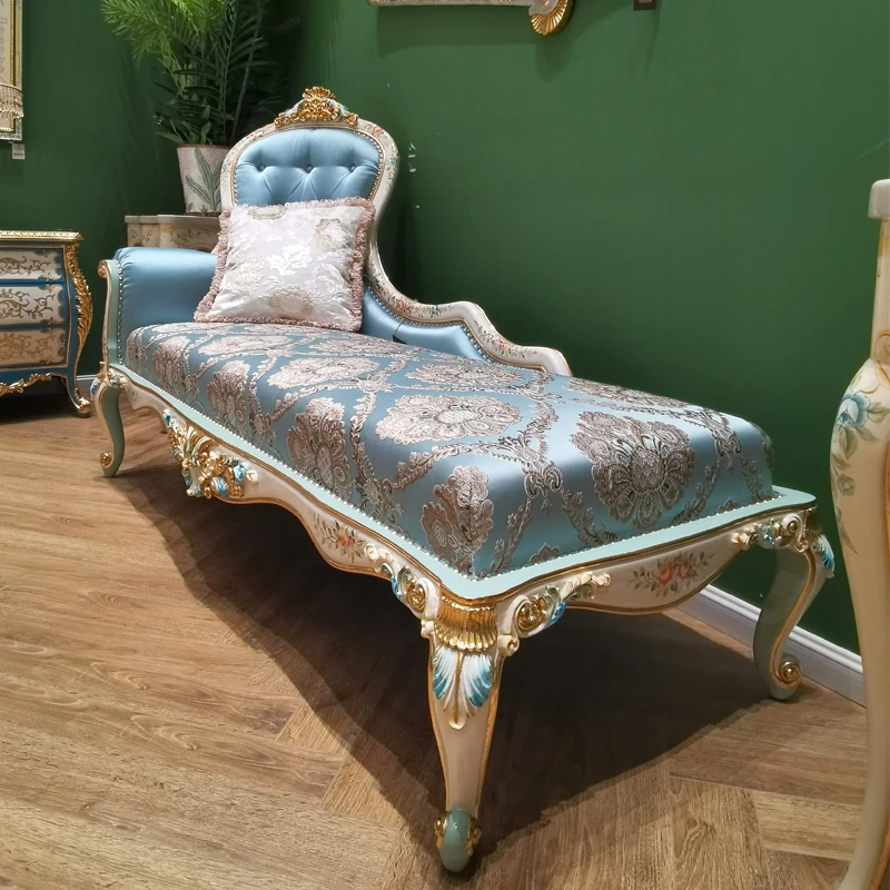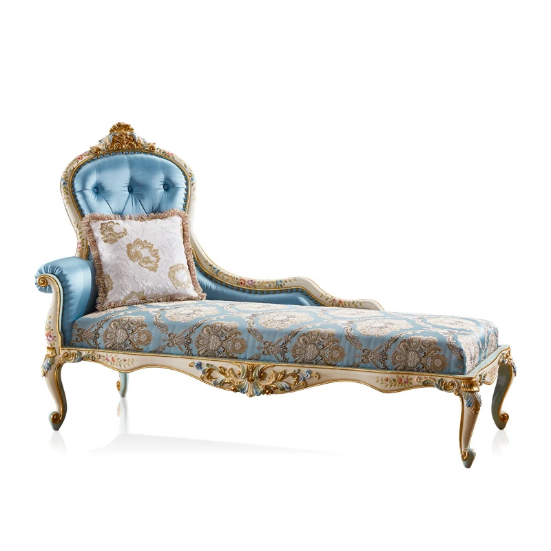 Julianne French Princess Style Elegant Romantic Solid Wood Carved Painted Floral Crown Blue Embroidered Fabric Chaise Lounge Chair