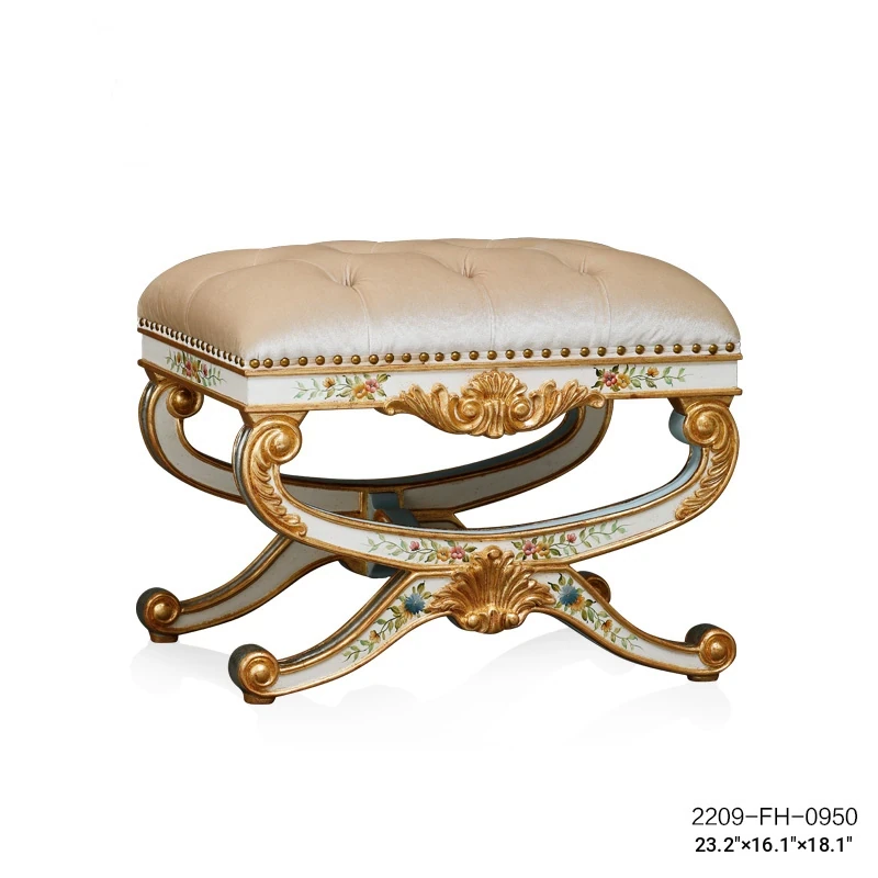 Julianne French Romantic Solid Wood Carved Gold Foil Accent Stool - Perfect for Villa Bedrooms, Dressing Areas, and Living Room Shoe Changes!