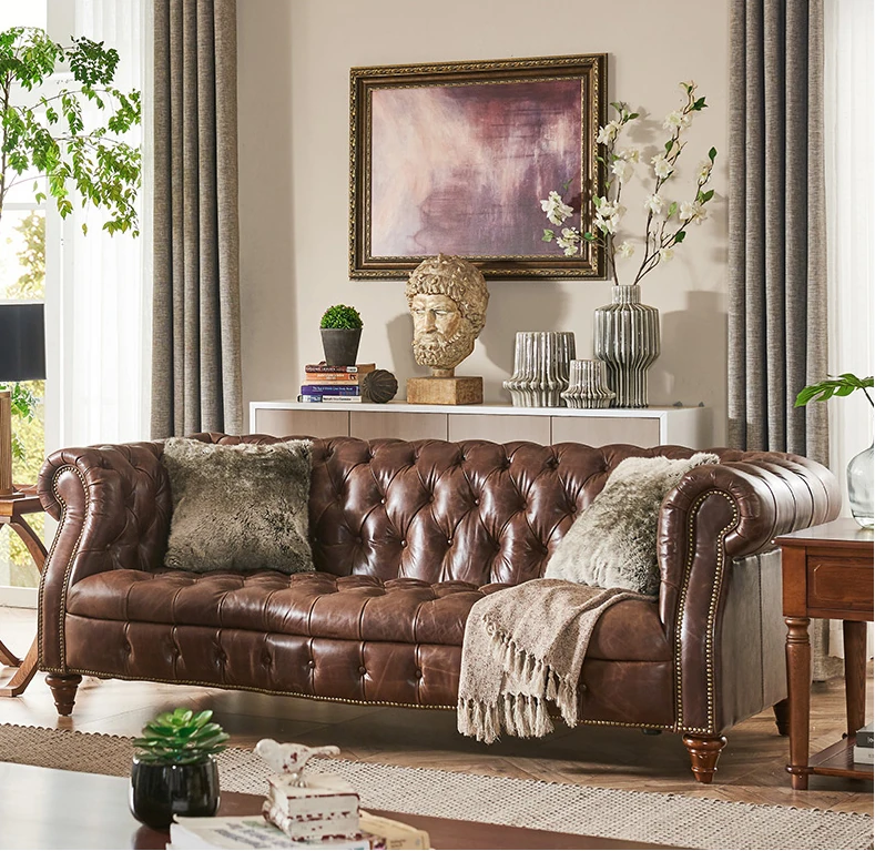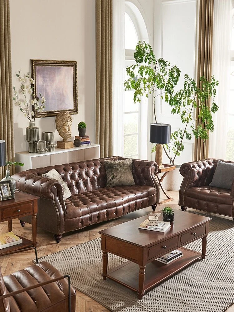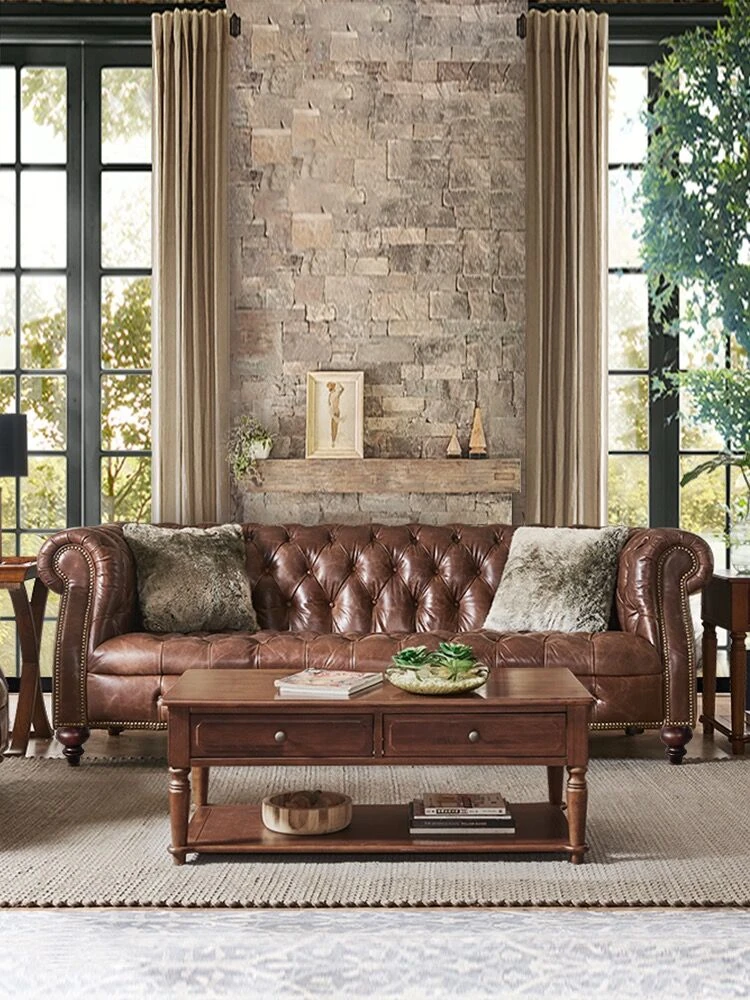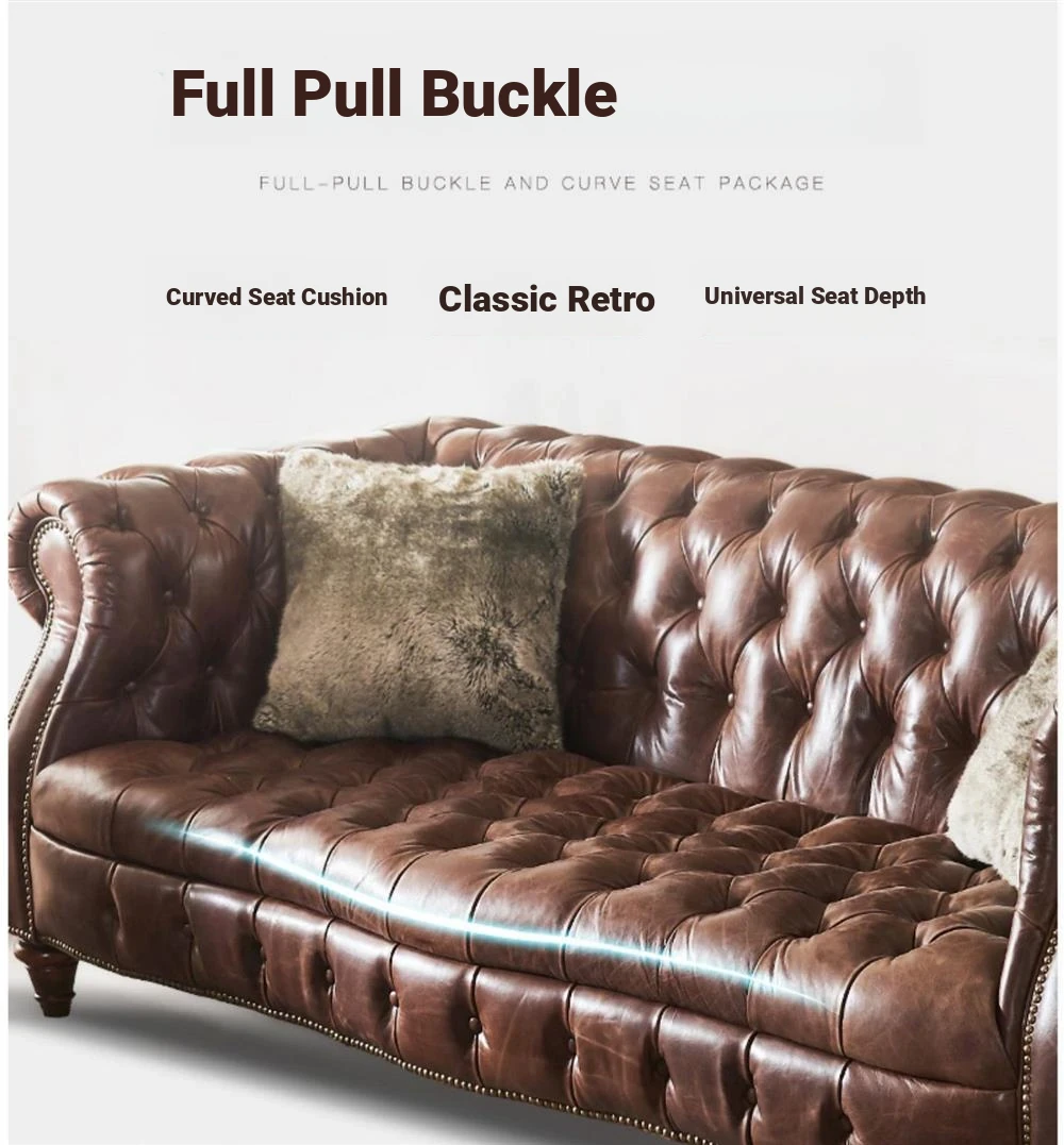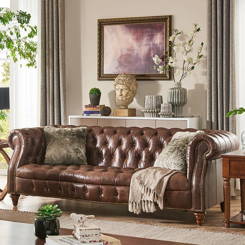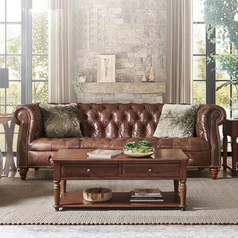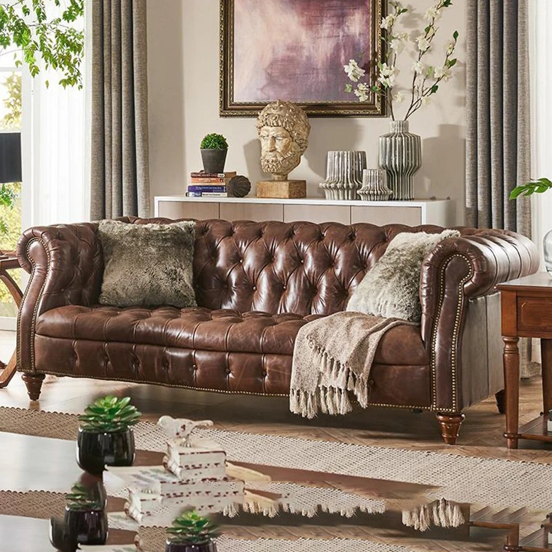 Premium American Leather Sofa - Top-Grain Cowhide for Reception Areas and Cigar Lounges, Vintage Style with Tufted Detailing, High-End European Furniture