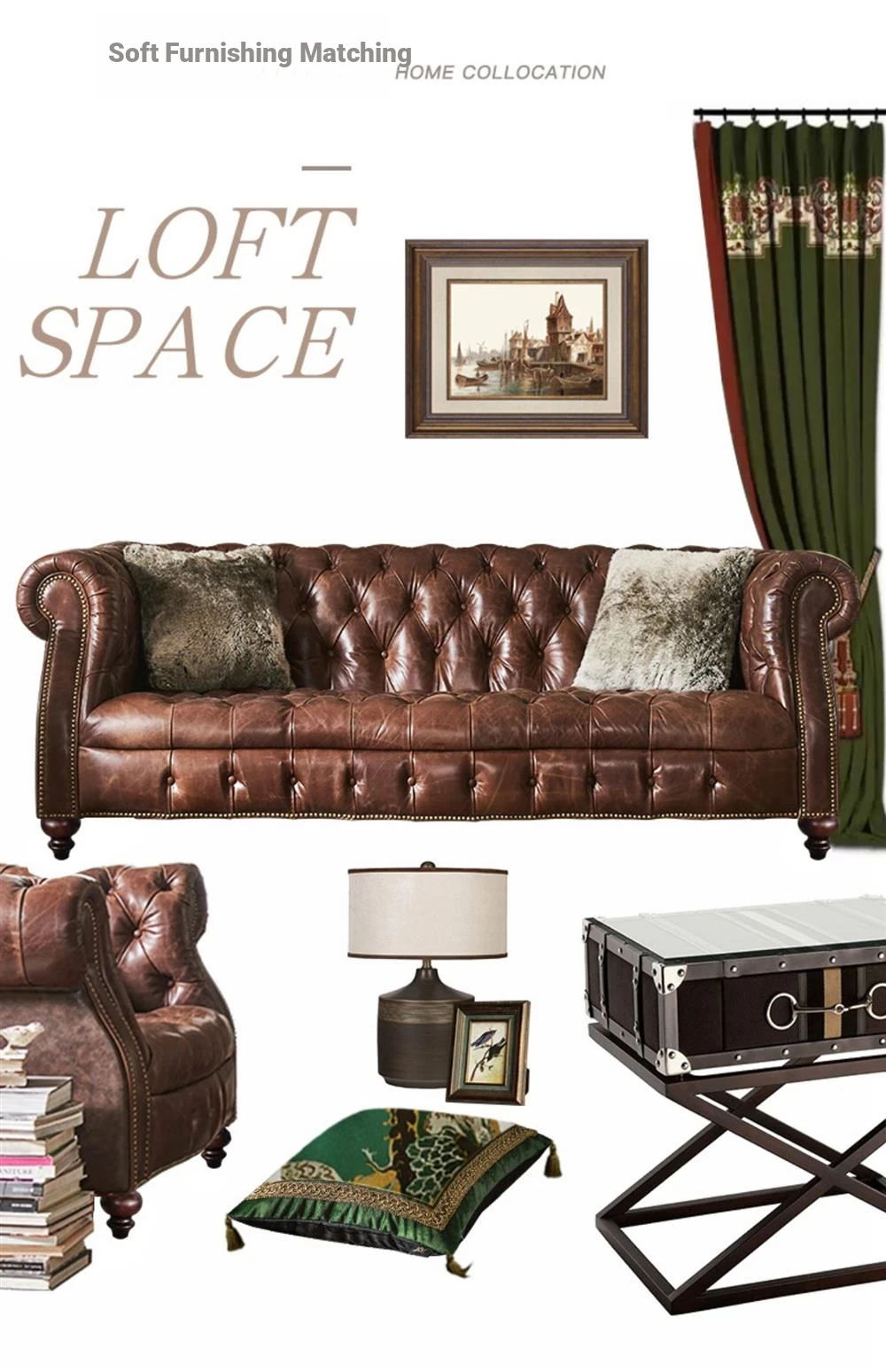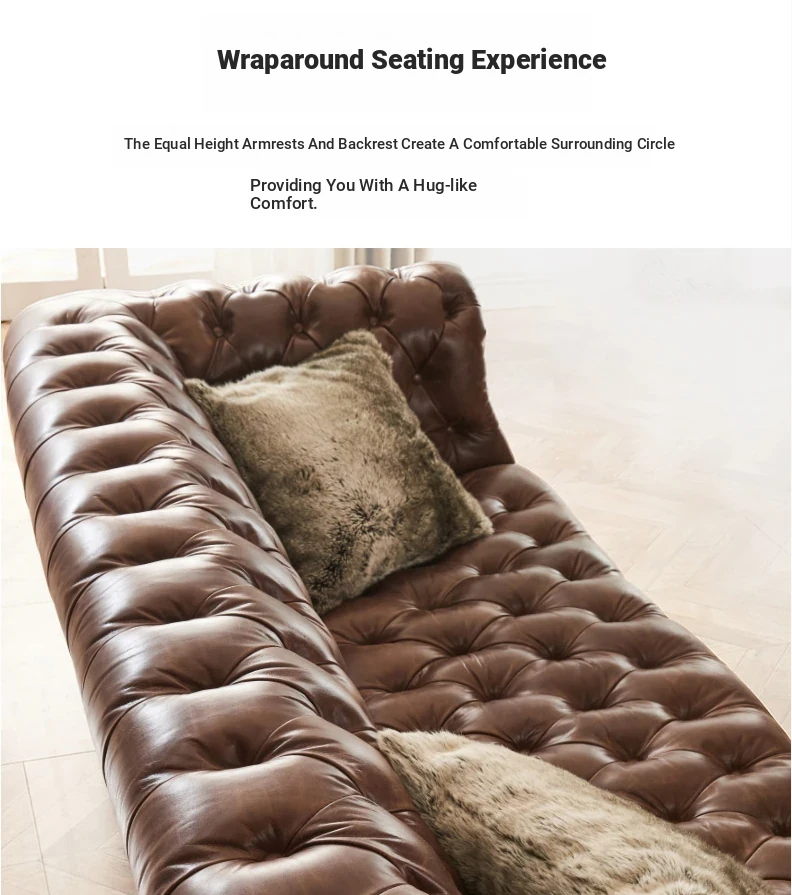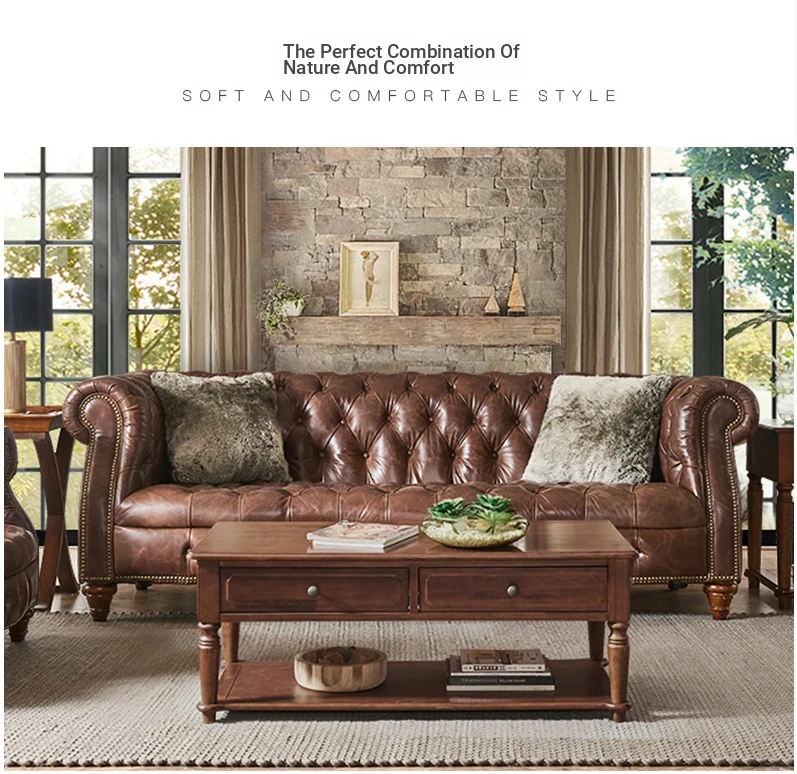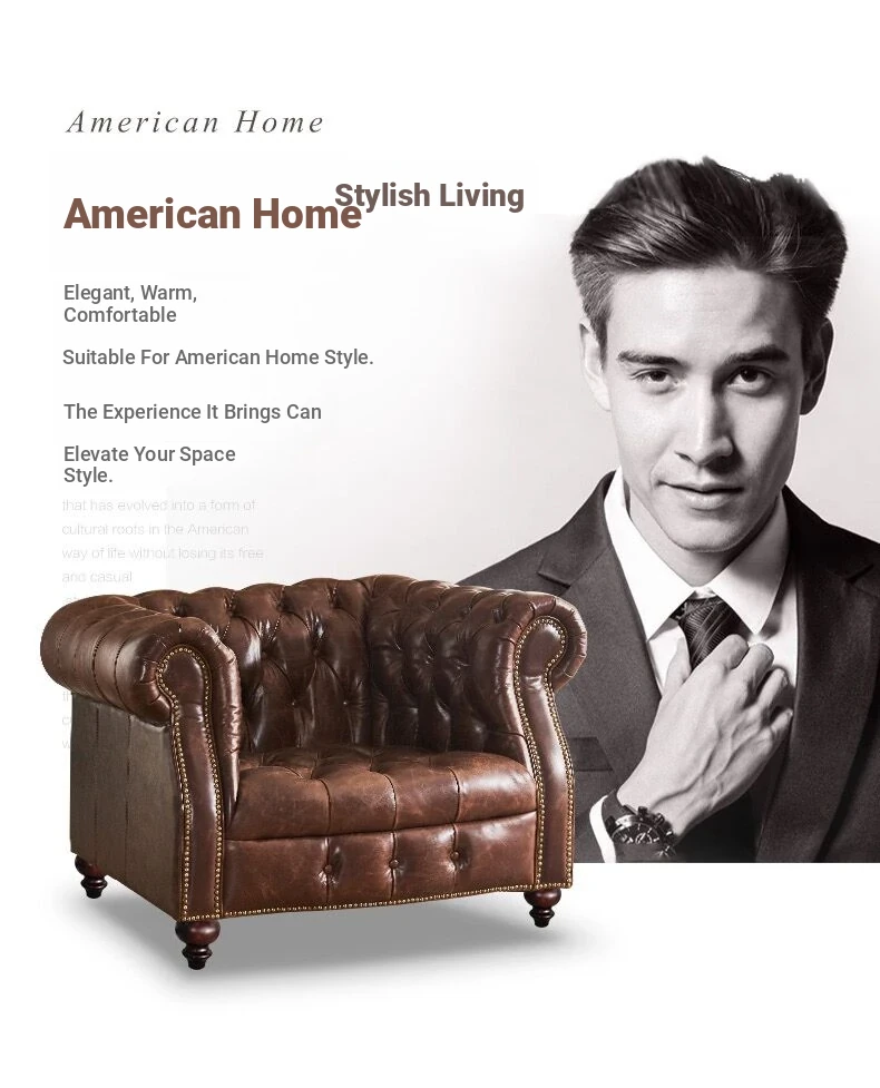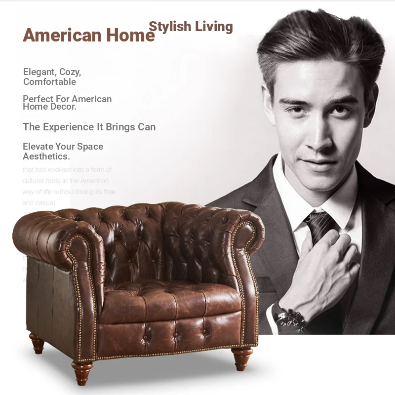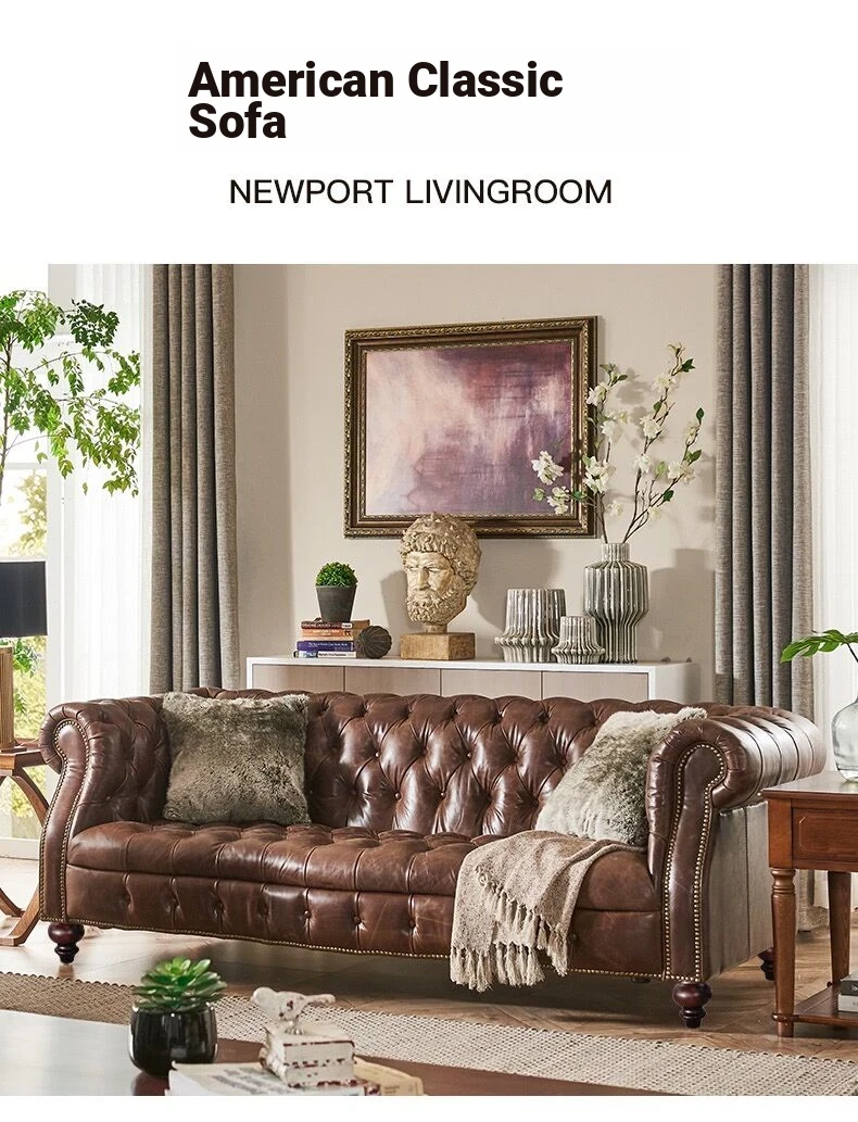 Premium American Leather Sofa - Top-Grain Cowhide for Reception Areas and Cigar Lounges, Vintage Style with Tufted Detailing, High-End European Furniture