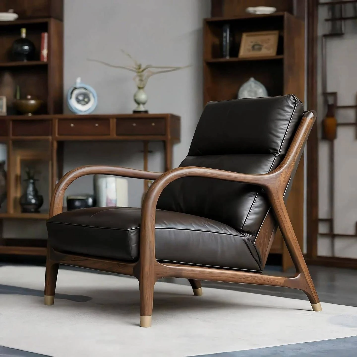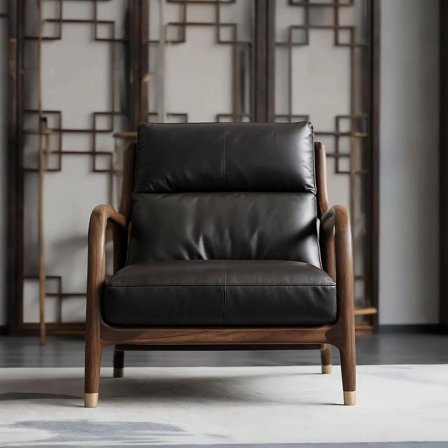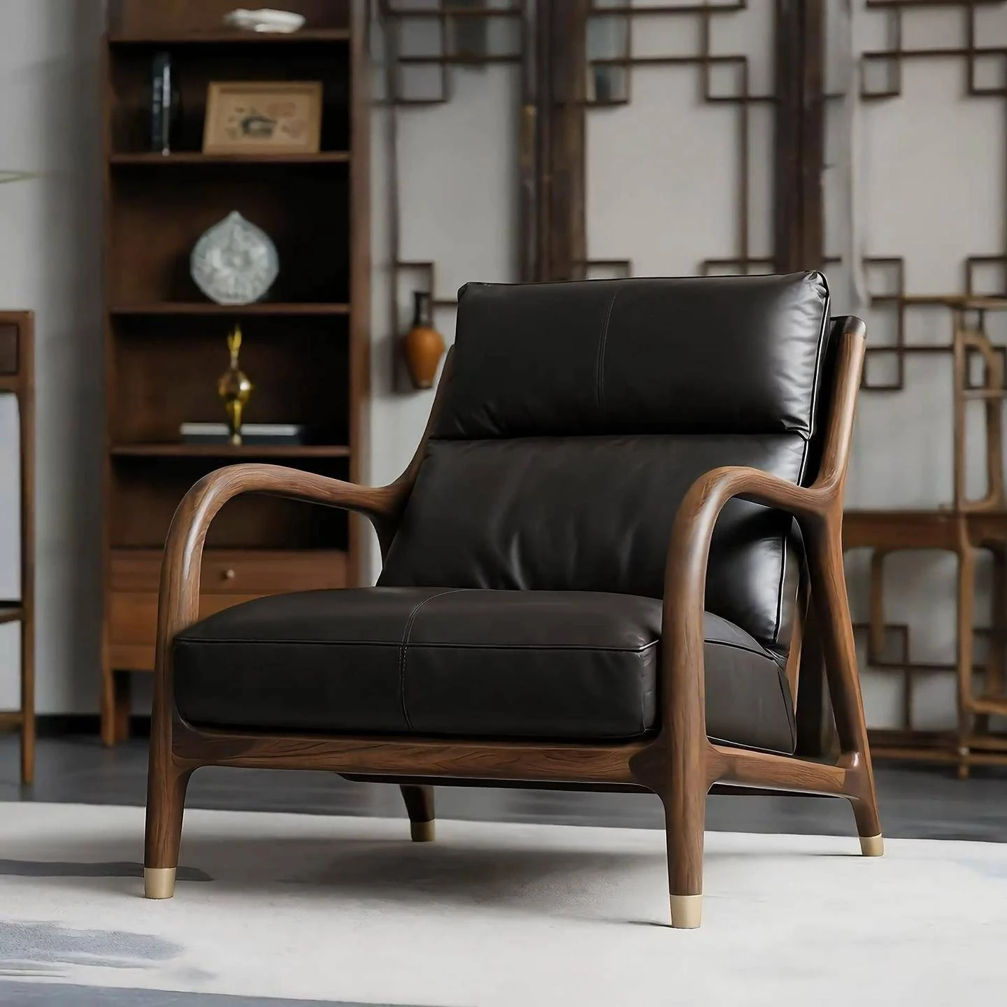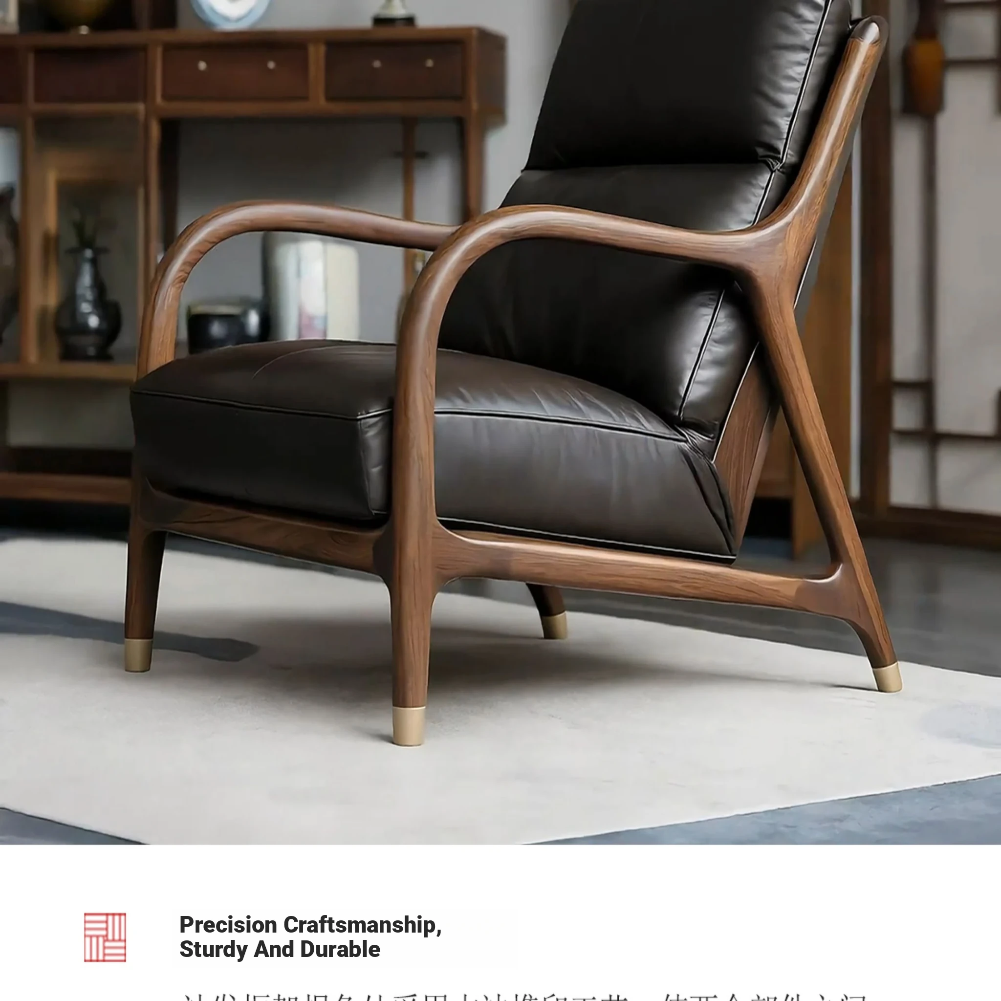 Premium North American Black Walnut Solid Wood Armchair - Genuine Leather Sofa Chair for Living Room, Minimalist High-End New Chinese Style Leisure Furniture