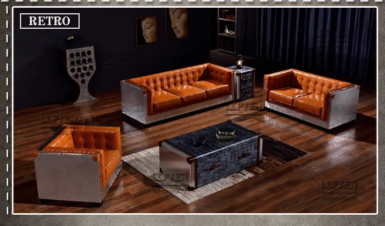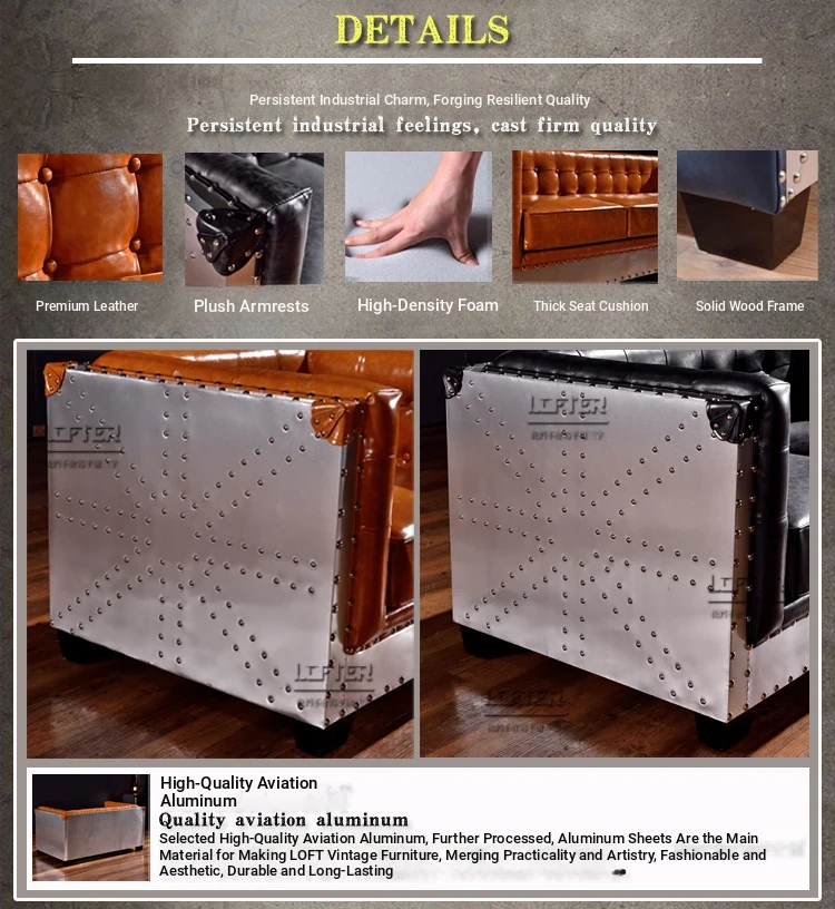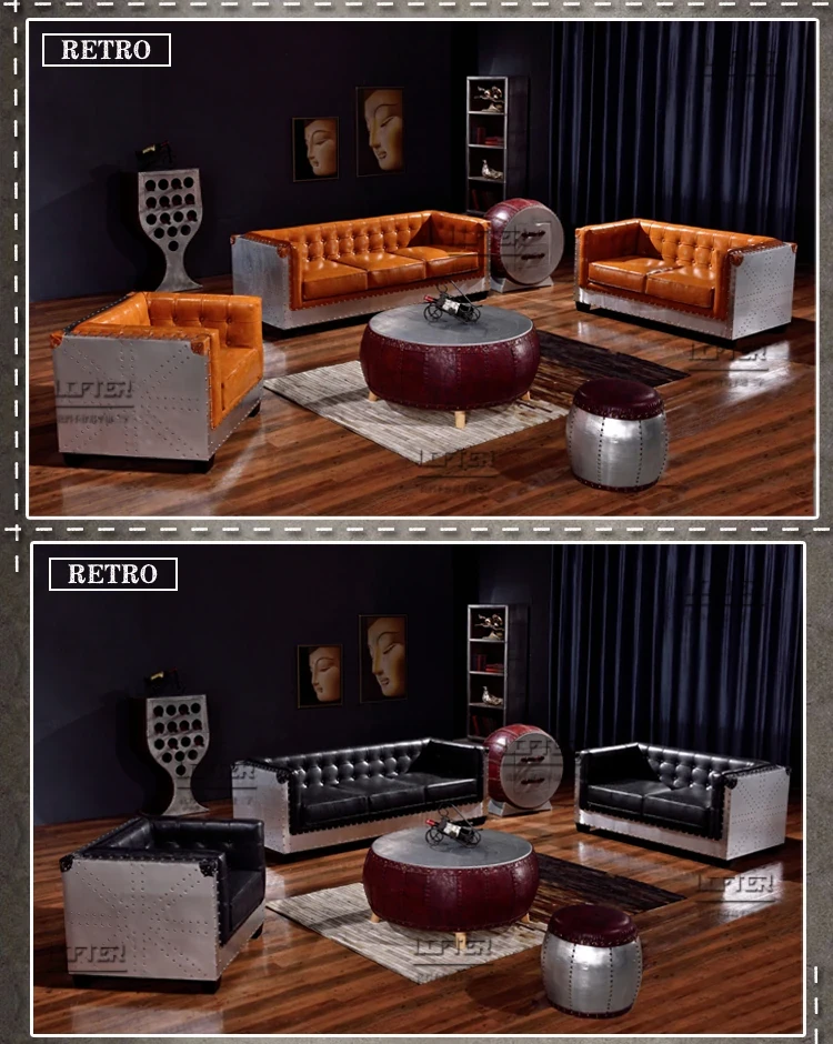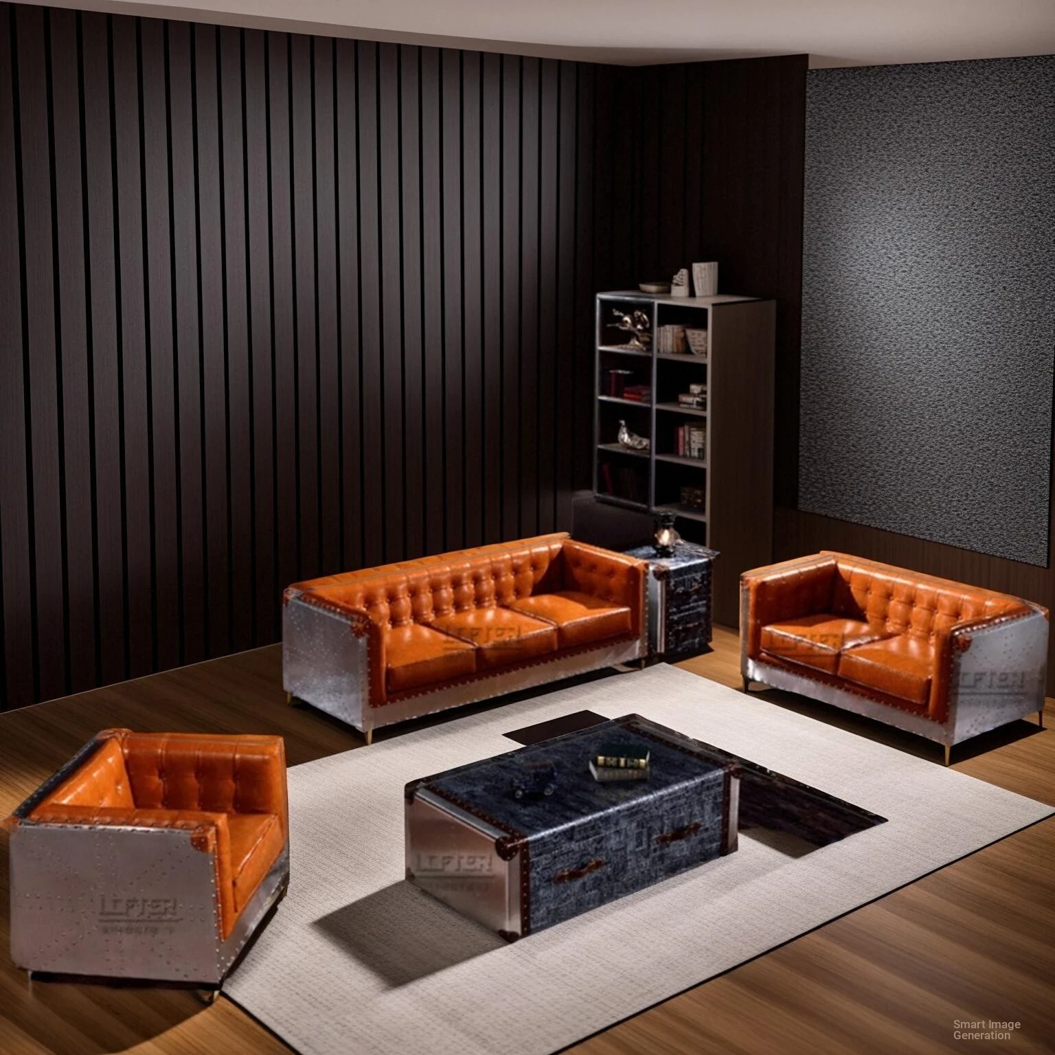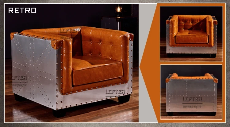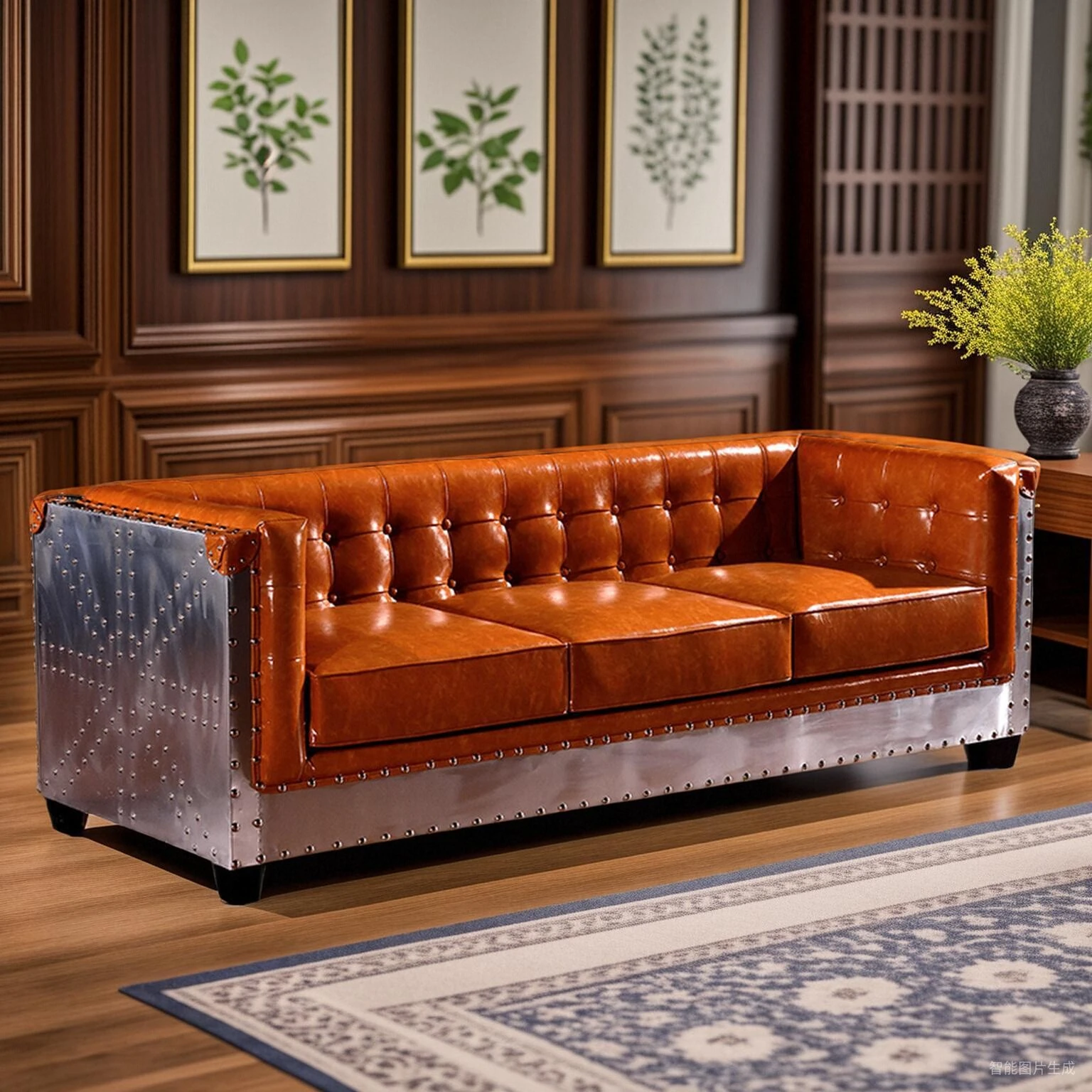 Vintage American Leather Sofa with Industrial Aluminum Skin - Retro Cigar Bar Buckle Couch with Distressed Metal Finish