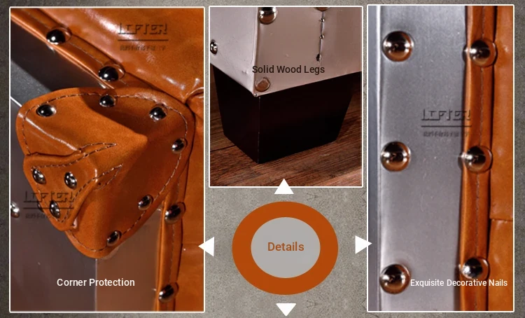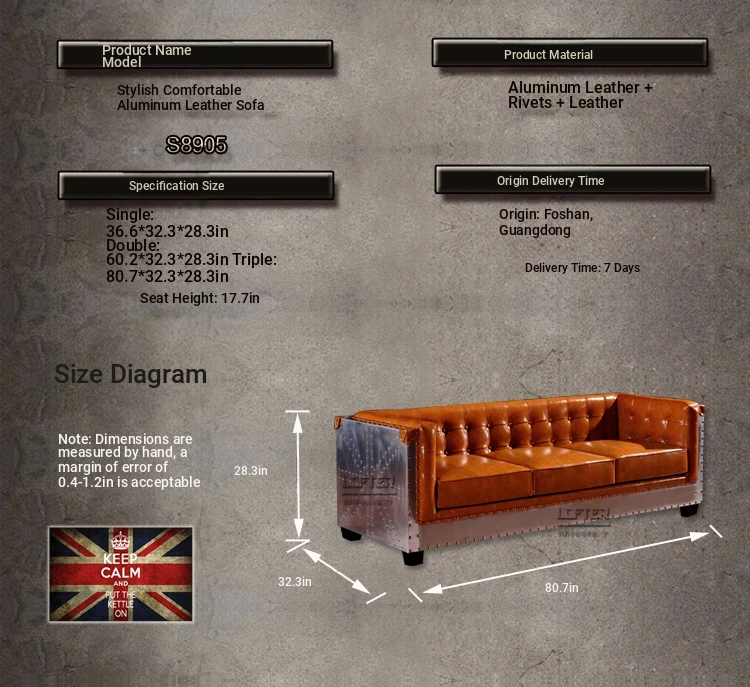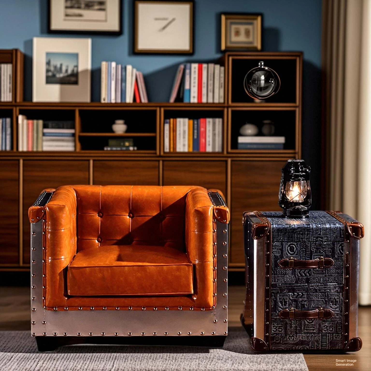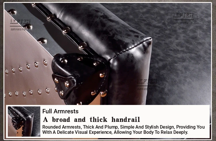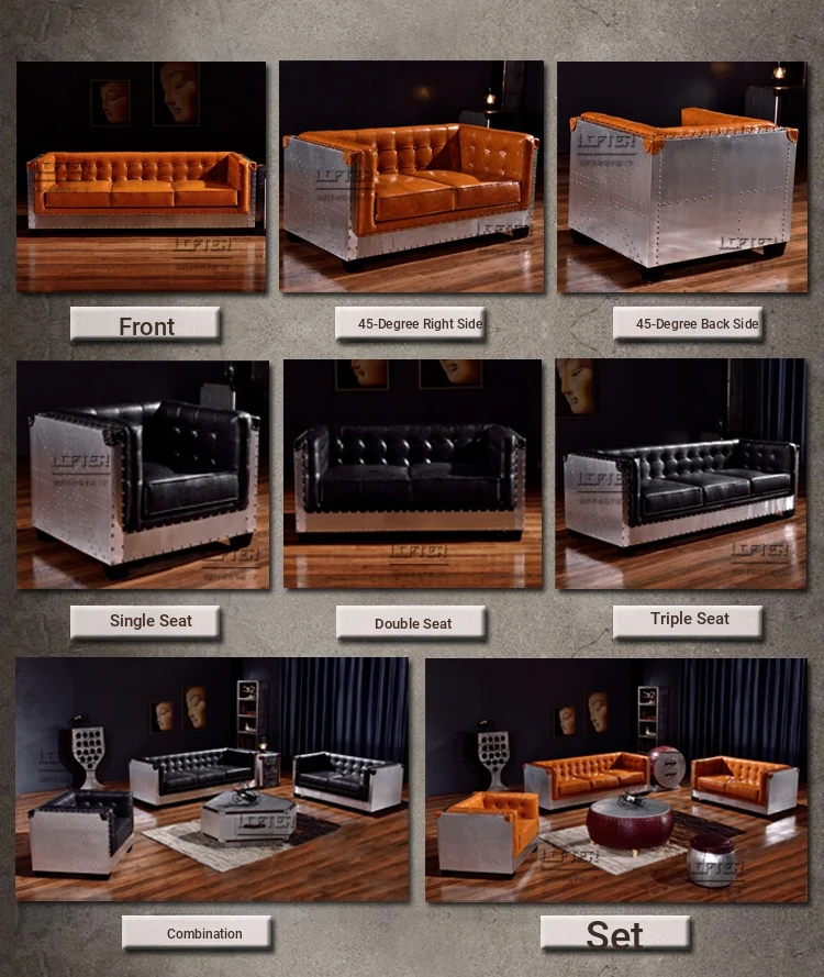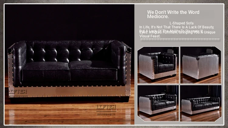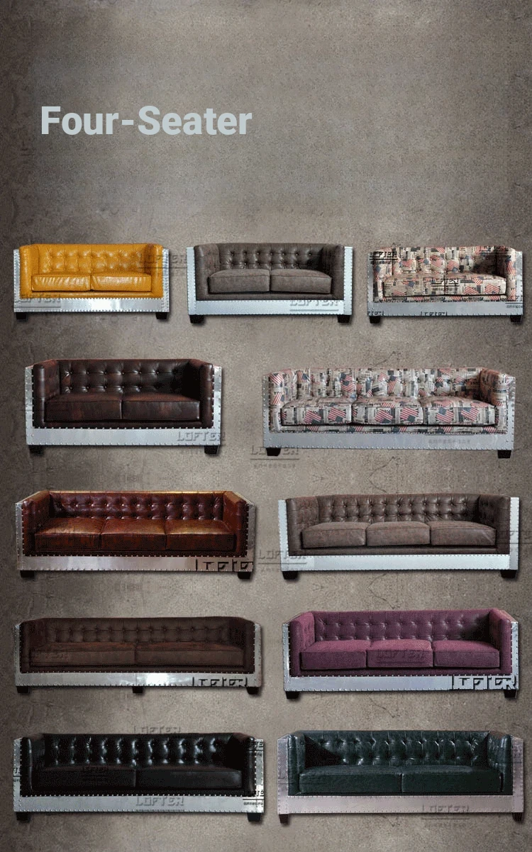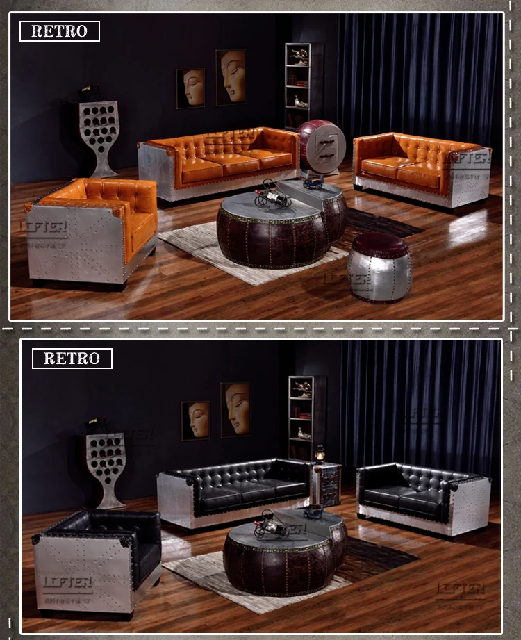 Vintage American Leather Sofa with Industrial Aluminum Skin - Retro Cigar Bar Buckle Couch with Distressed Metal Finish