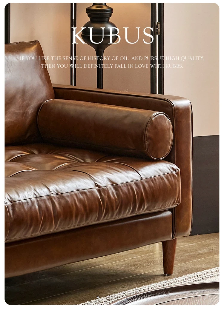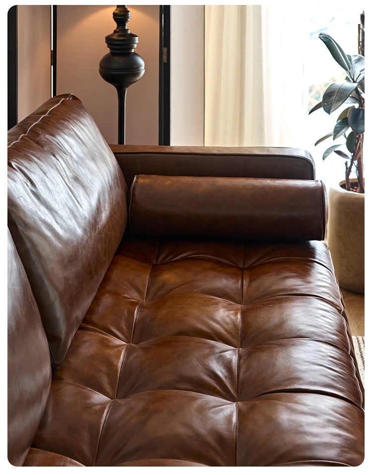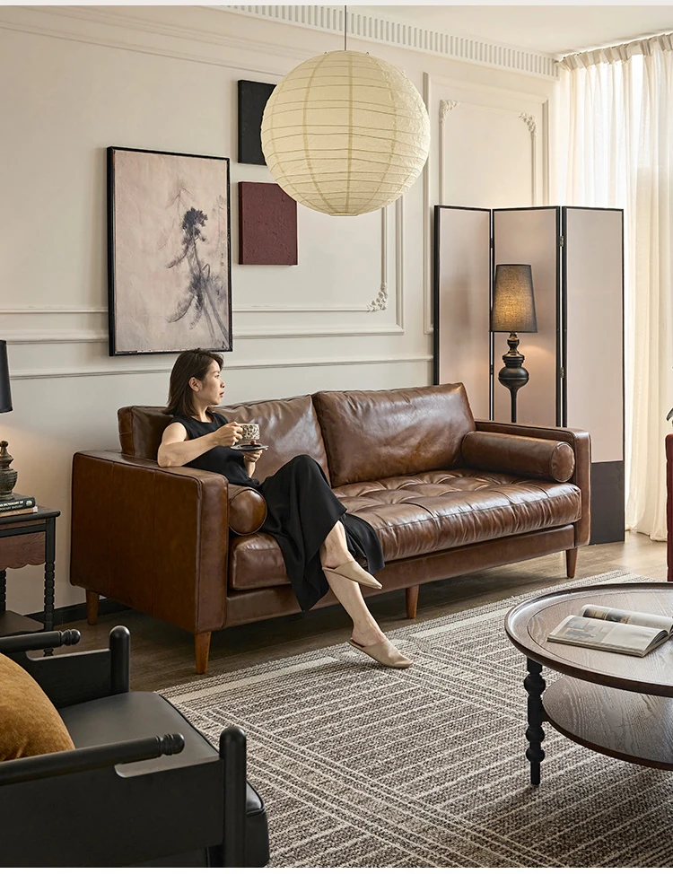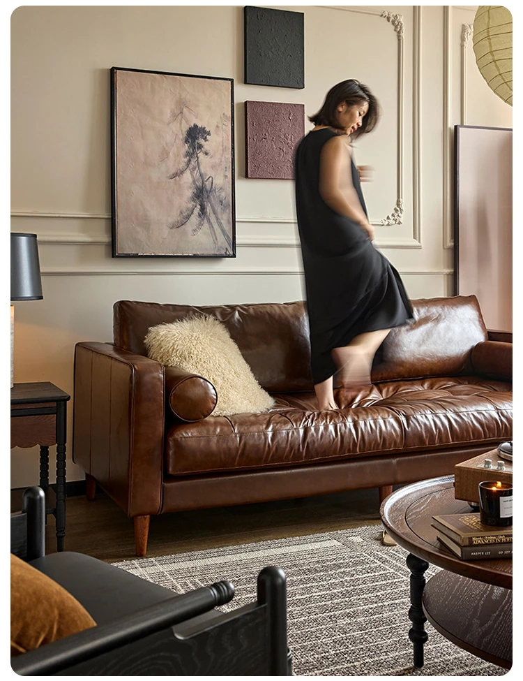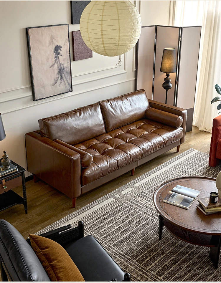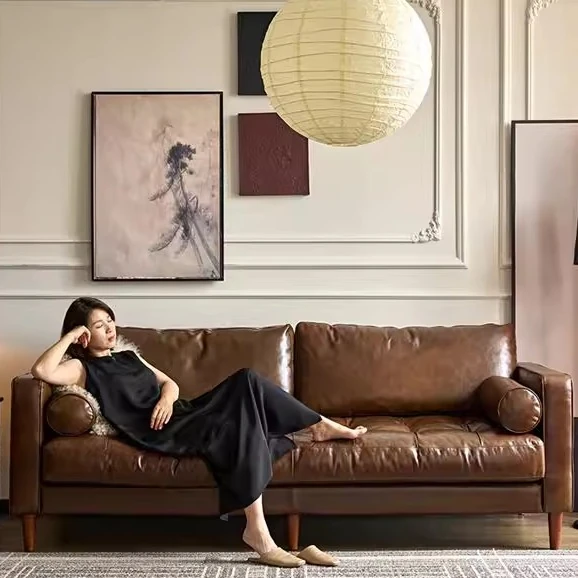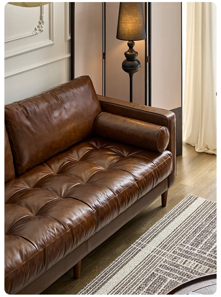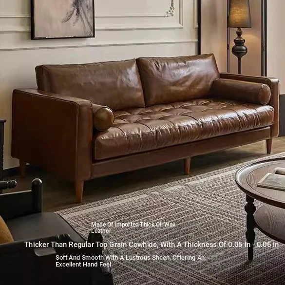 Vintage French Genuine Leather Sofa - American Top Grain Cowhide for Small Living Rooms - Stylish and Durable Oil Wax Leather Design