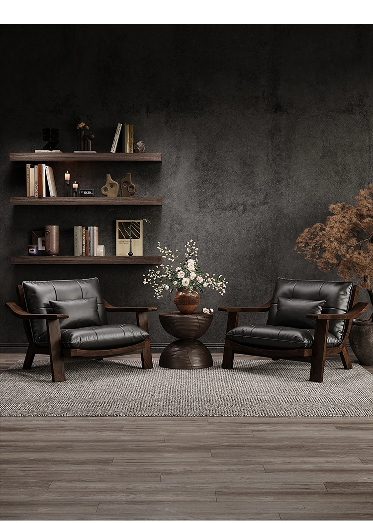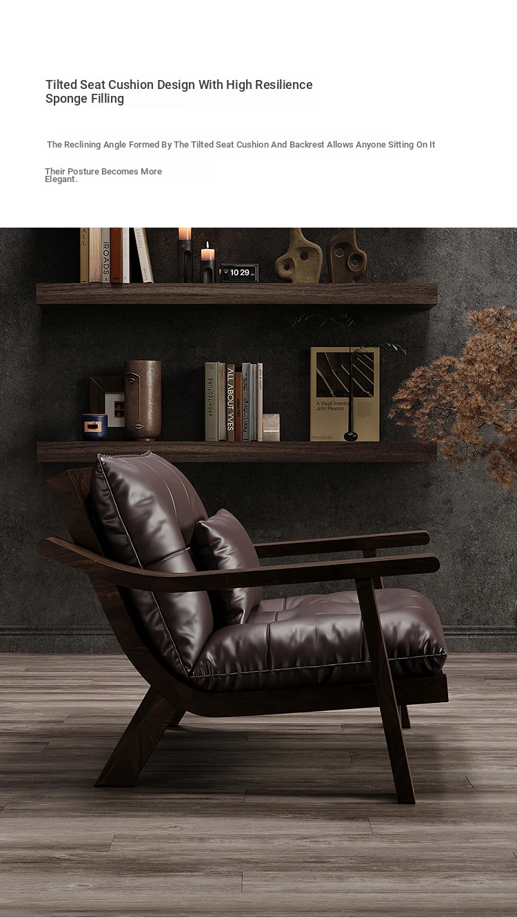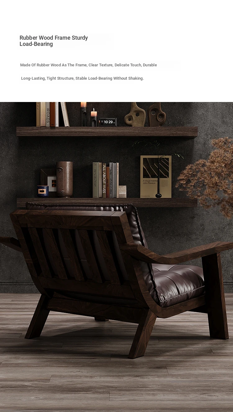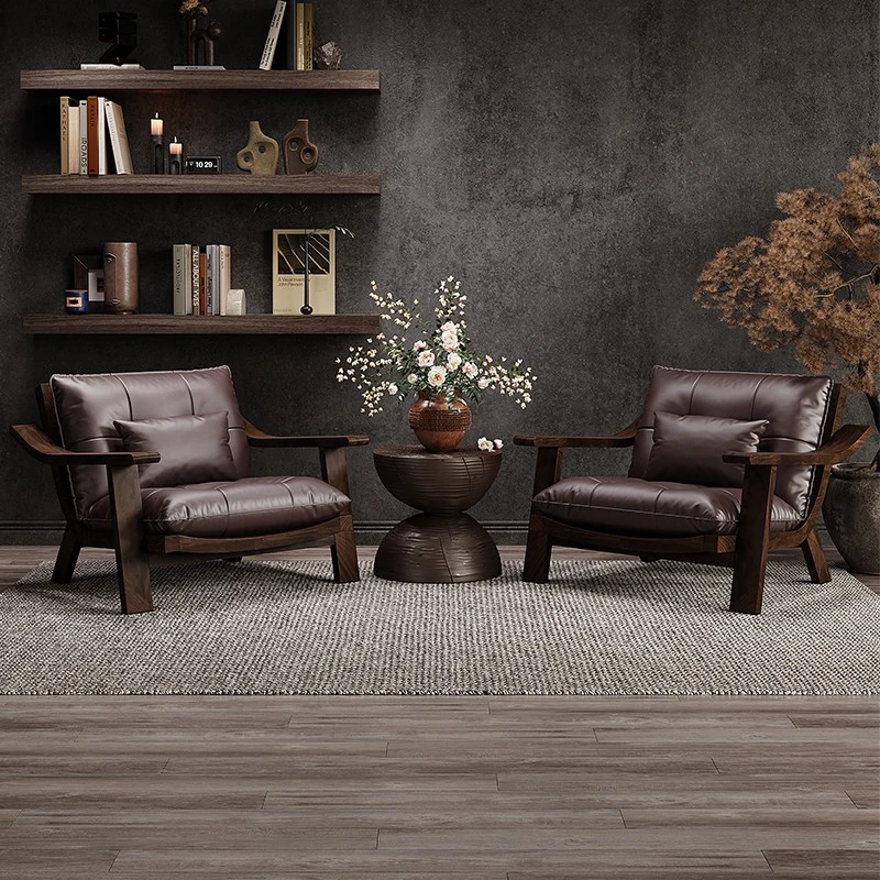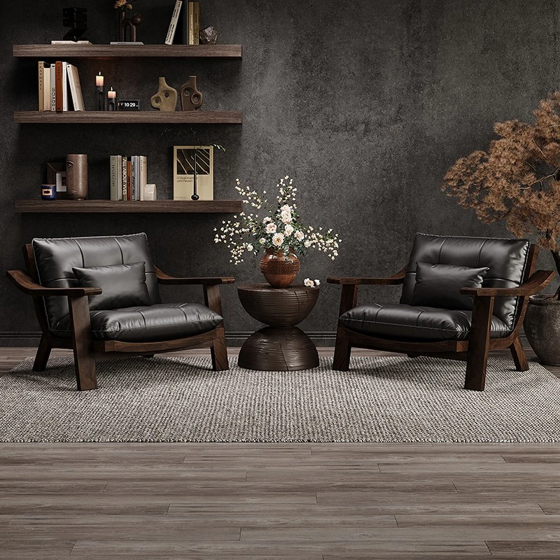 Vintage Solid Wood Lounge Chair - Retro Genuine Leather Single Sofa - Designer Tea Chair with Armrests and Backrest - Perfect for Relaxation and Style