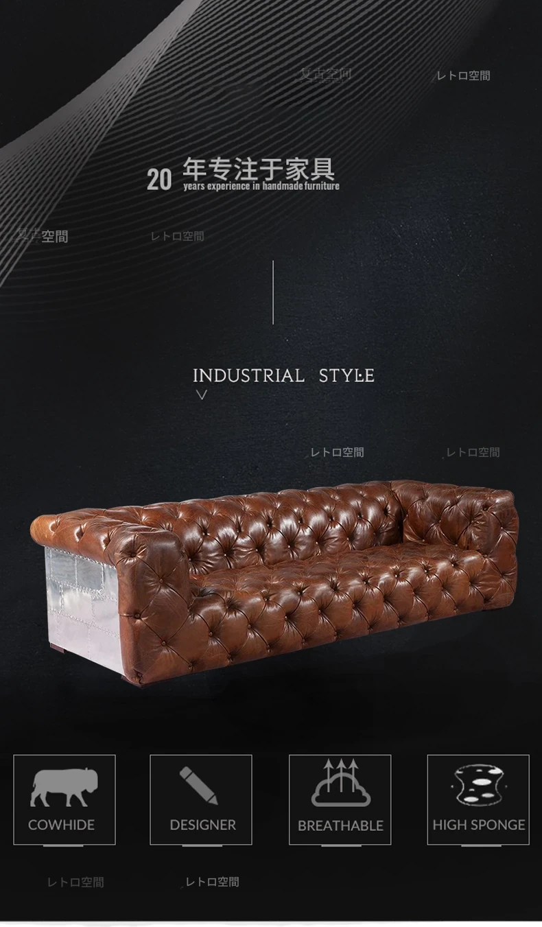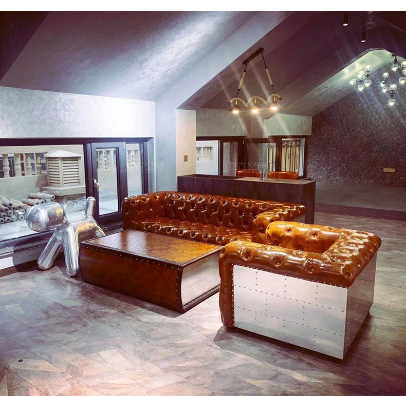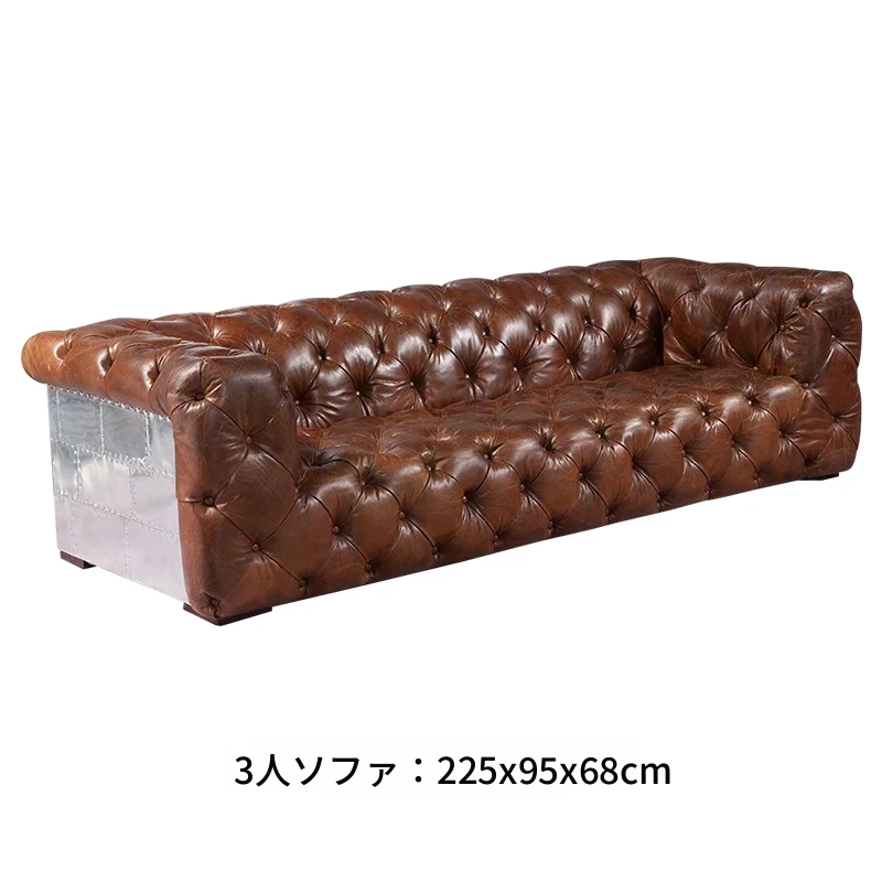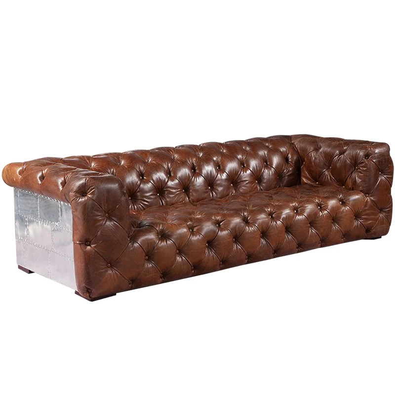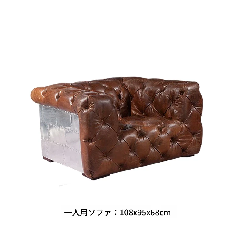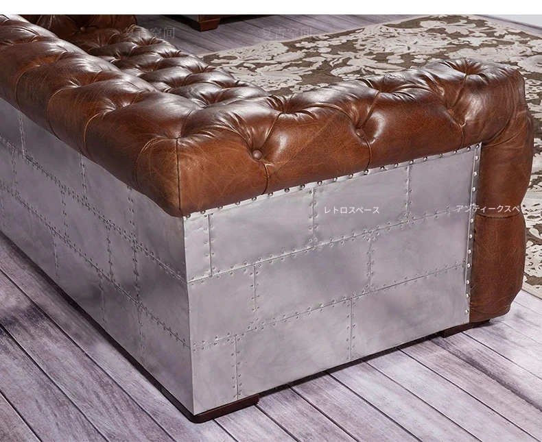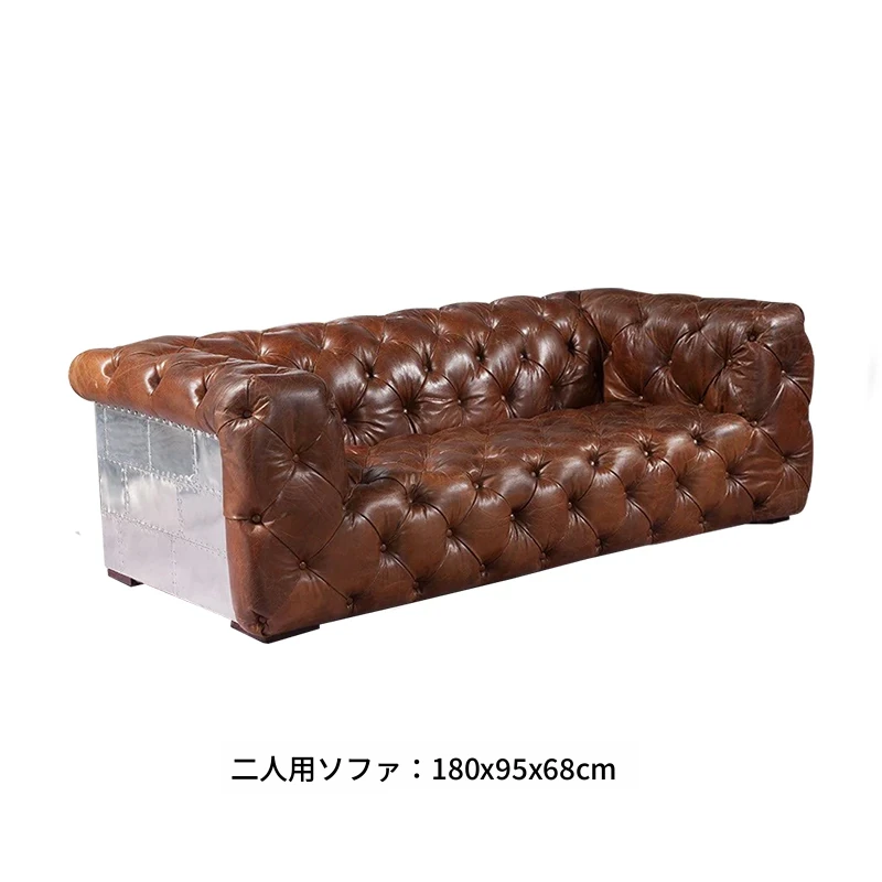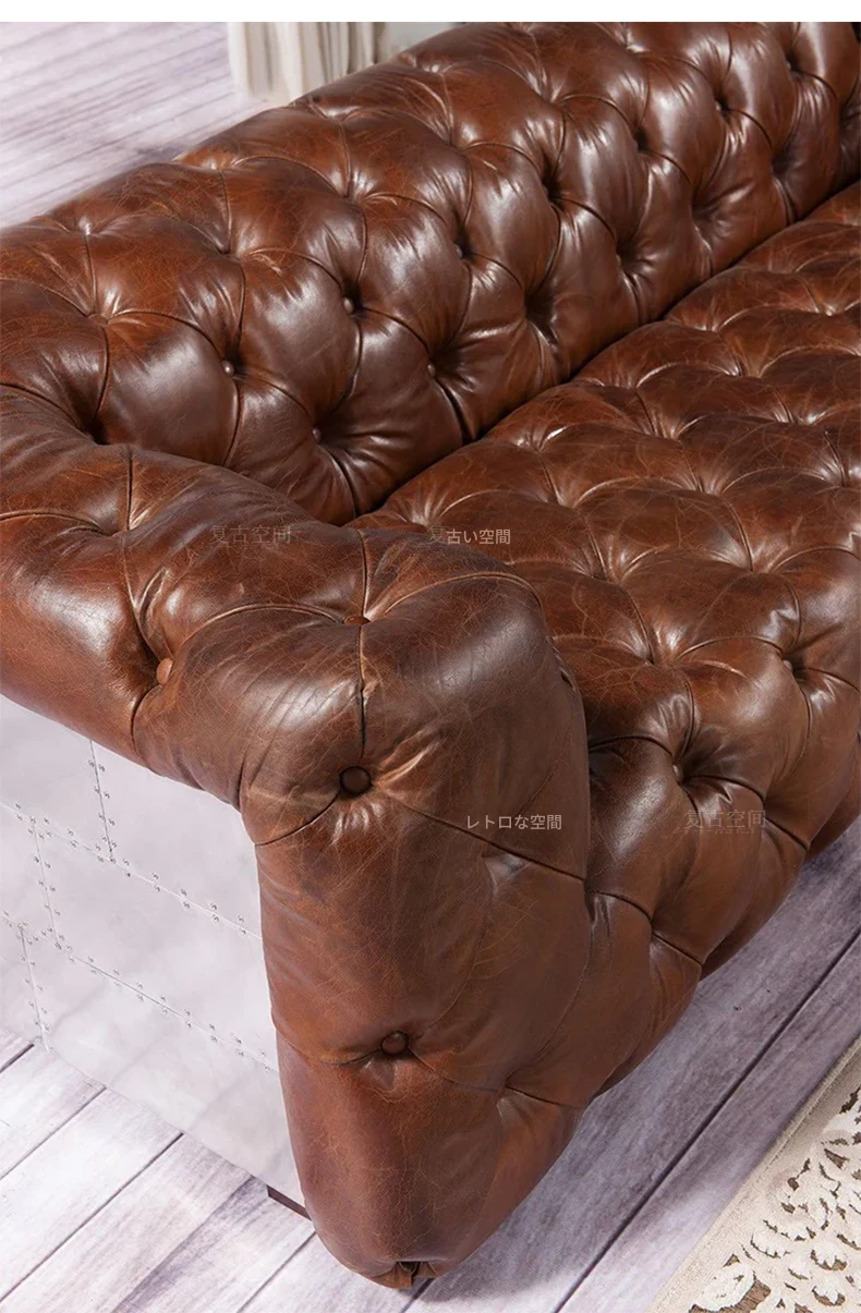 アメリカンオイルワックスレザーの引き手ソファー - インダストリアルスタイルのアルミニウム皮革製レトロシガーバー真皮ソファー。デザイナーによる洗練されたバー向けスタイルで、特別なひとときを演出します。