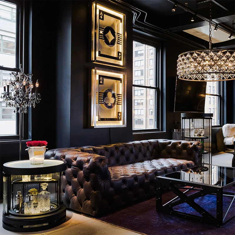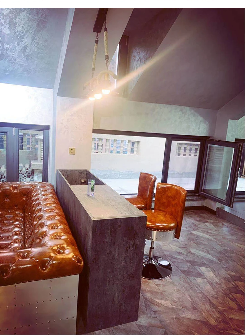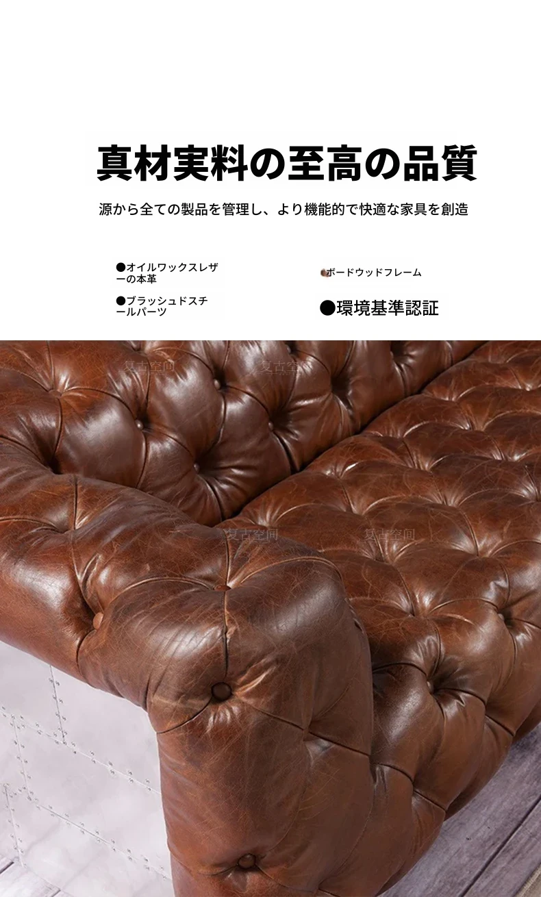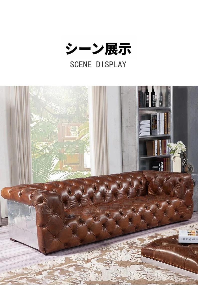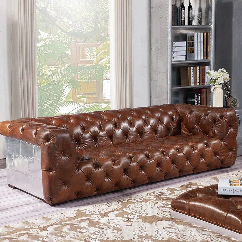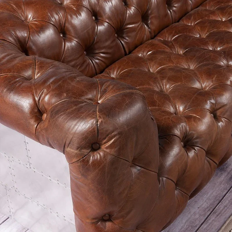 アメリカンオイルワックスレザーの引き手ソファー - インダストリアルスタイルのアルミニウム皮革製レトロシガーバー真皮ソファー。デザイナーによる洗練されたバー向けスタイルで、特別なひとときを演出します。