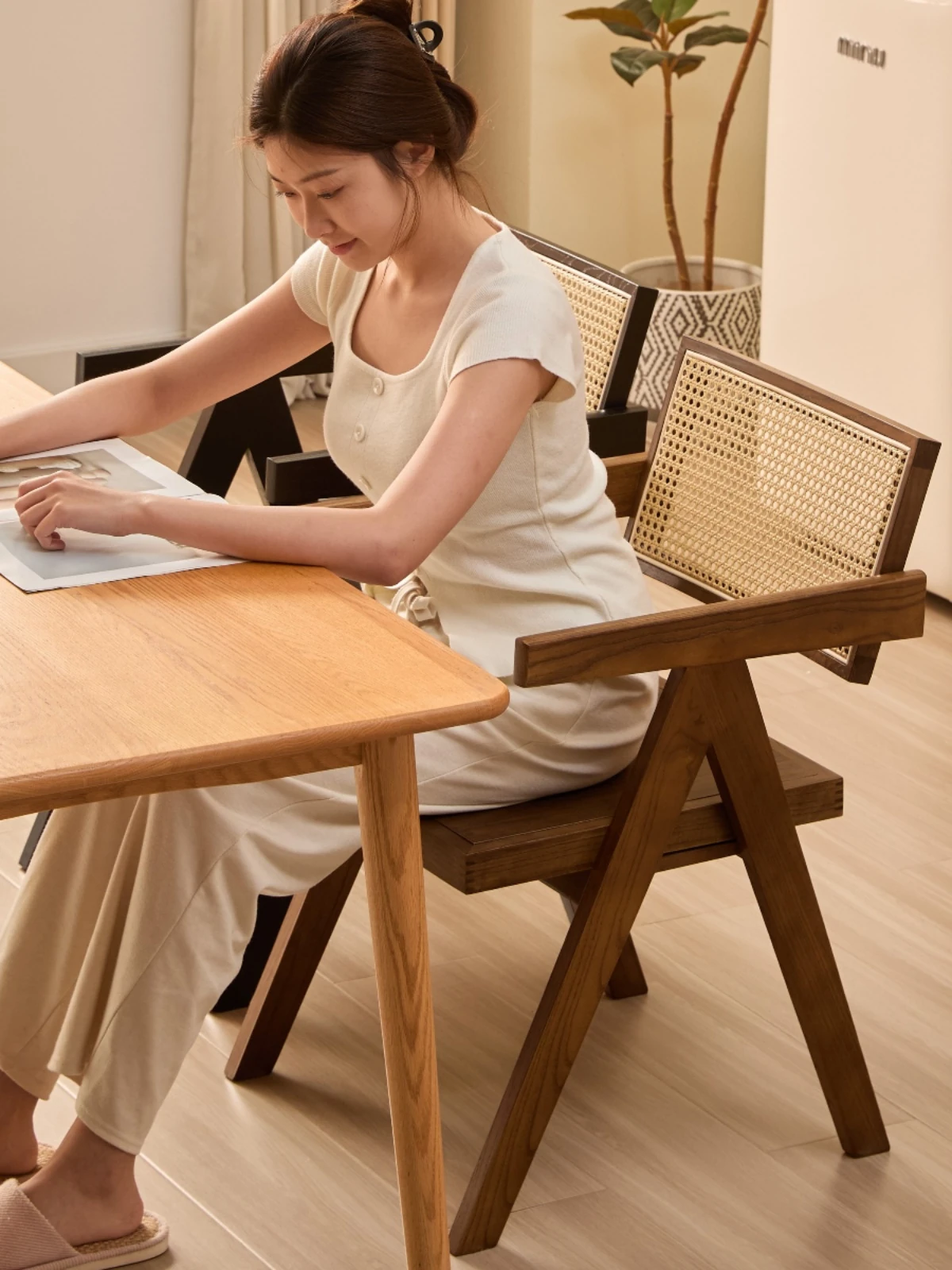 ホワイトアッシュ【ウォールナット色+ラタン+無垢材】