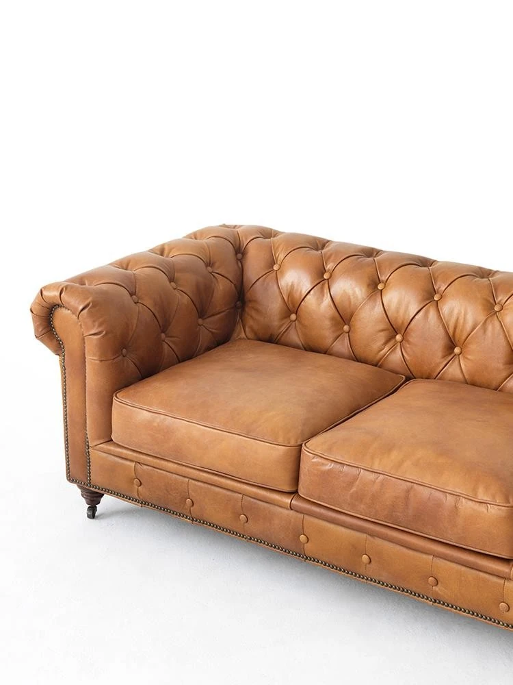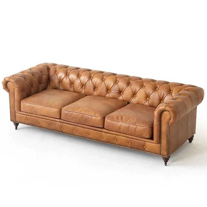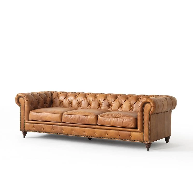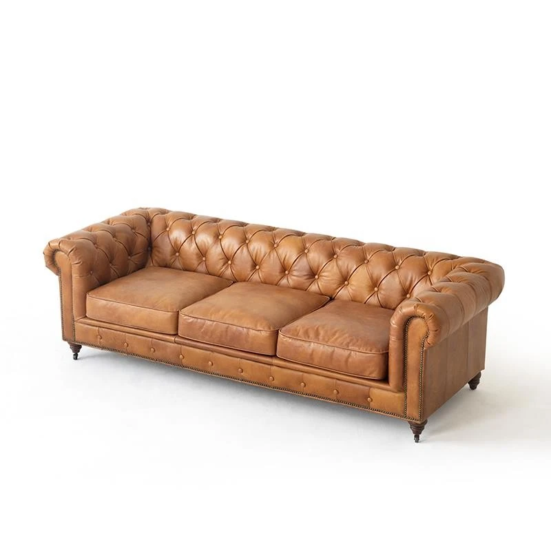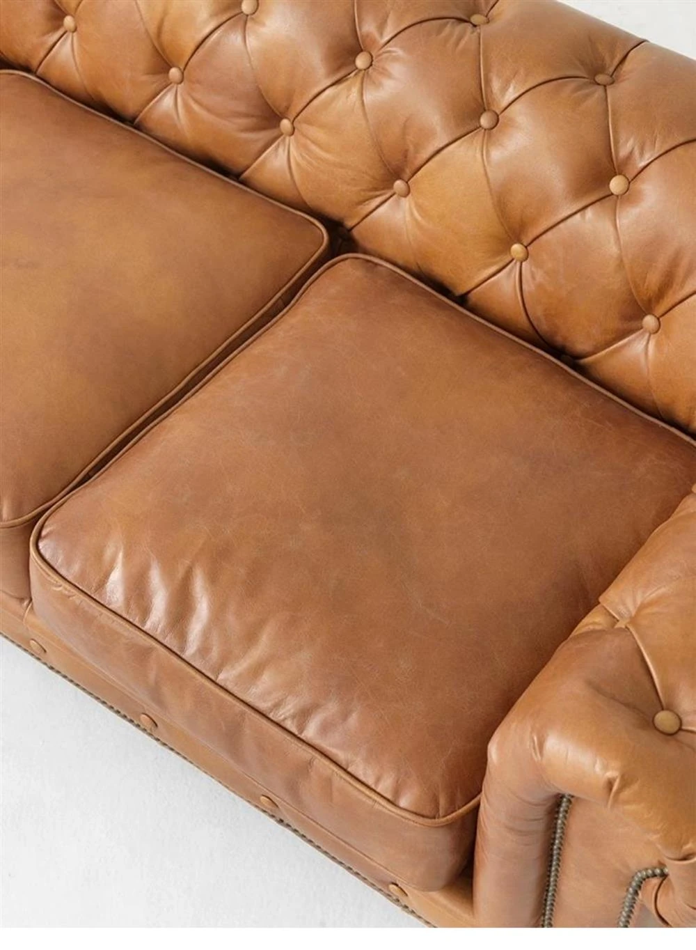Classic American Pull-Down Genuine Leather 3-Seat Vintage Sofa - Perfect for Your Retro Cigar Room or Luxurious Villa Living Room Furniture