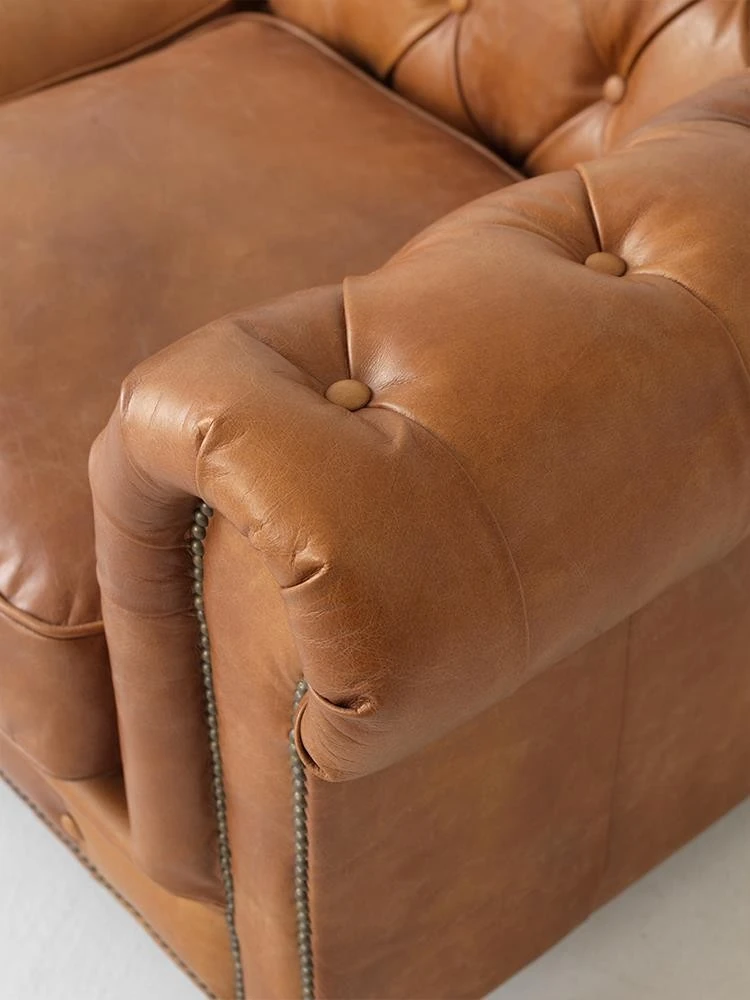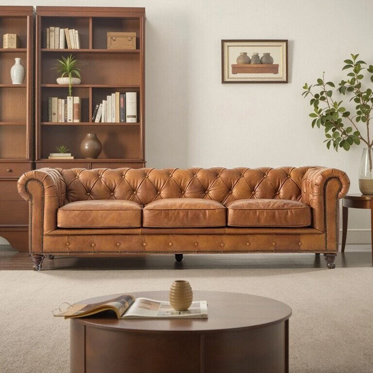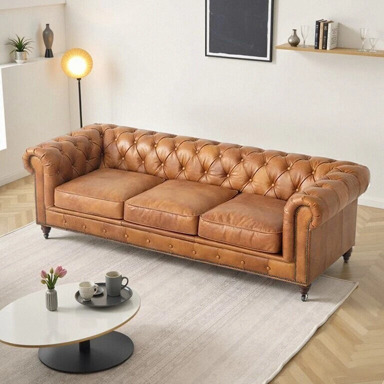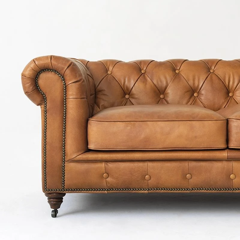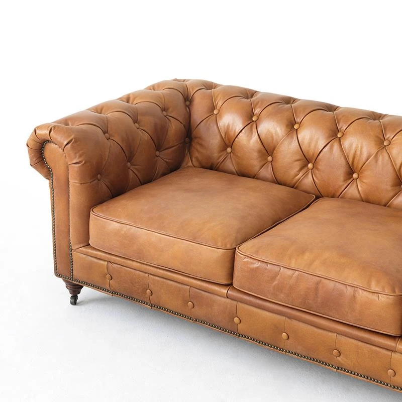 Classic American Pull-Down Genuine Leather 3-Seat Vintage Sofa - Perfect for Your Retro Cigar Room or Luxurious Villa Living Room Furniture