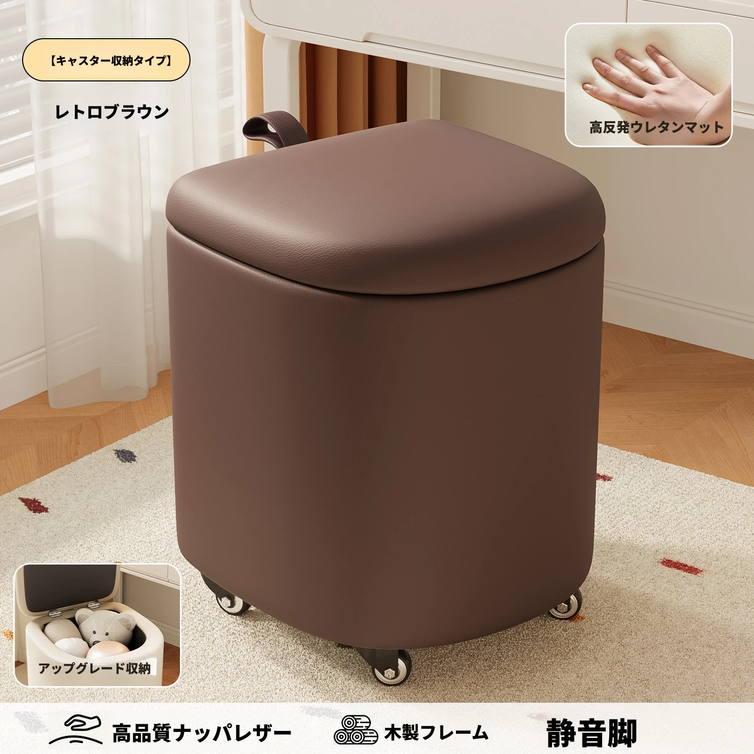 キャスター収納タイプ⭐レトロブラウン【高弾力スポンジマット】高品質ナッパレザー-360°回転