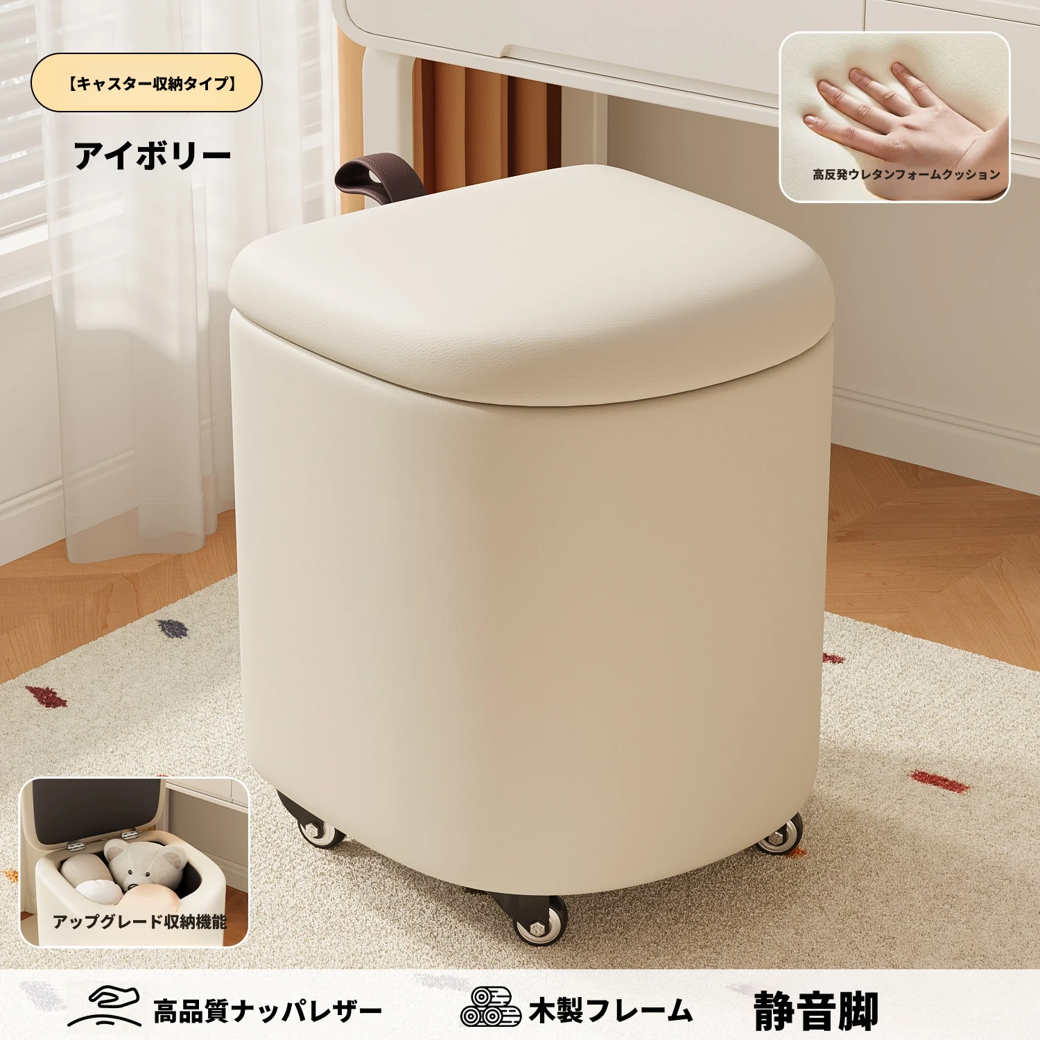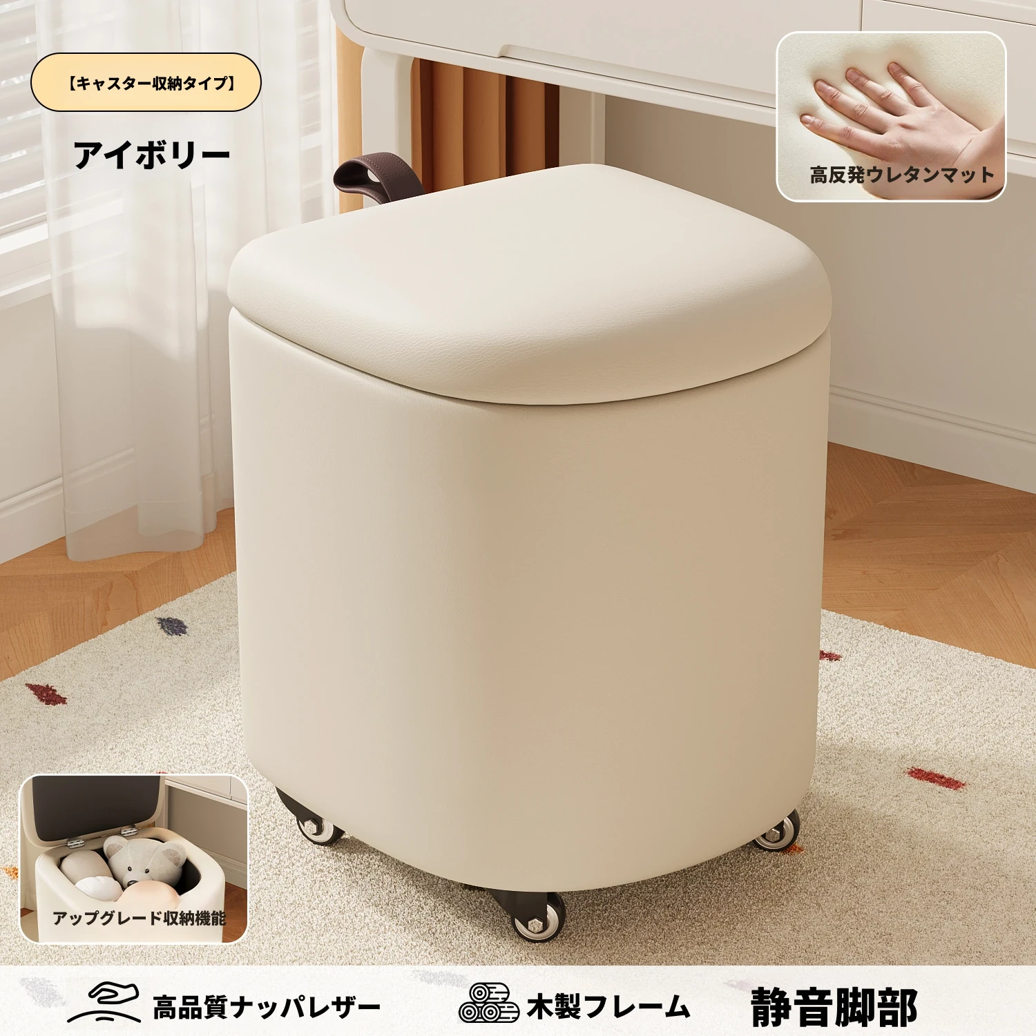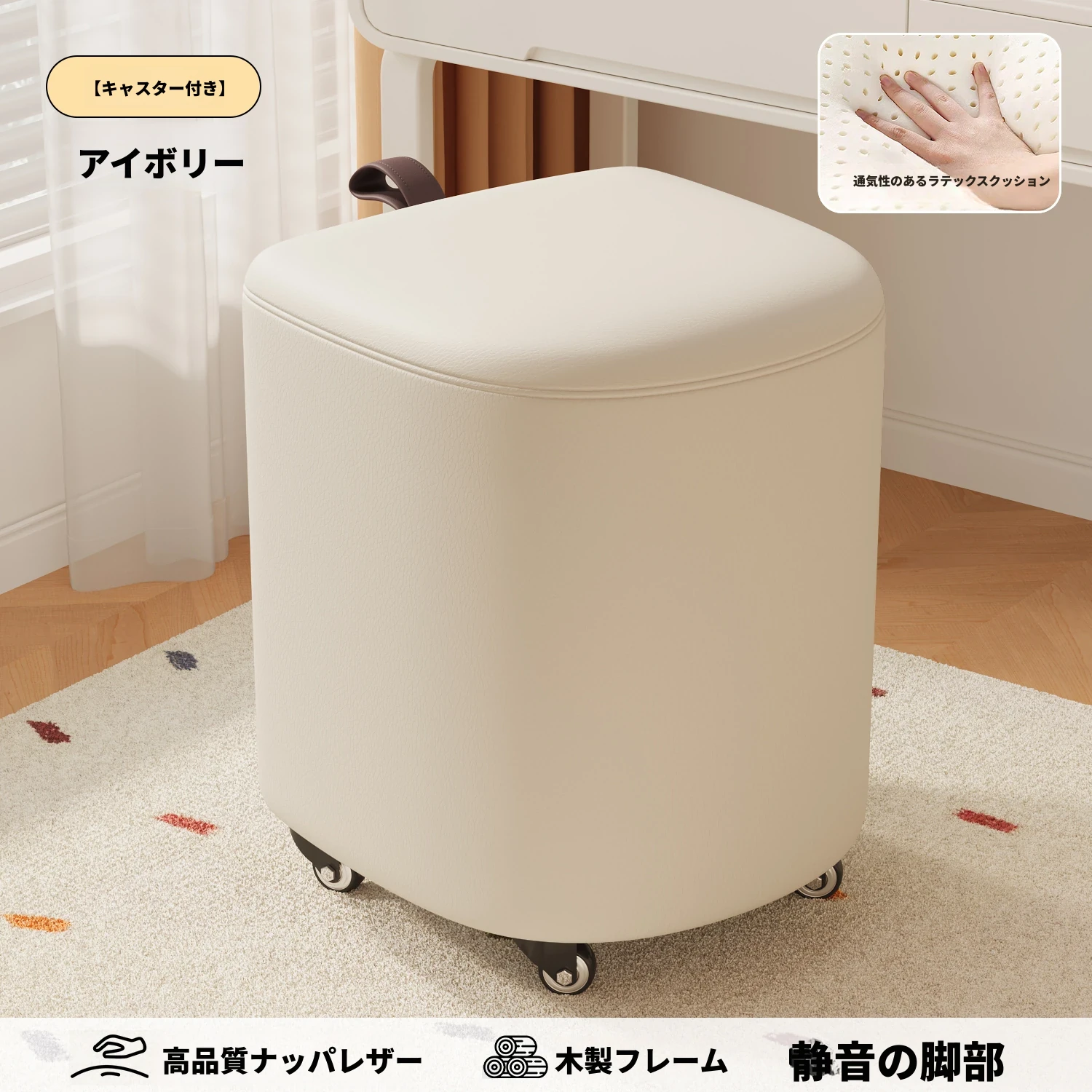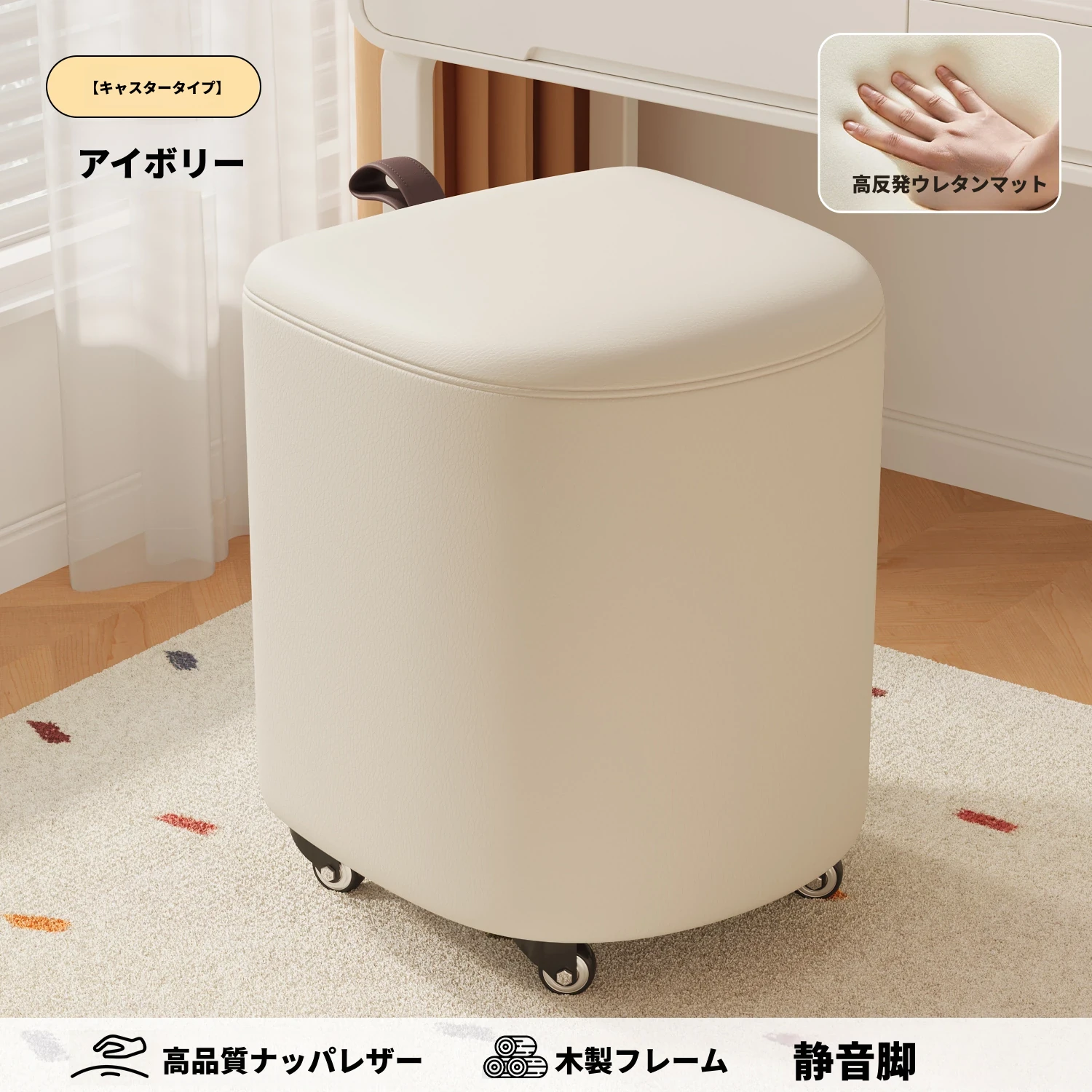 キャスター収納タイプ⭐アイボリー【高弾力スポンジマット】高品質ナッパレザー-360°回転