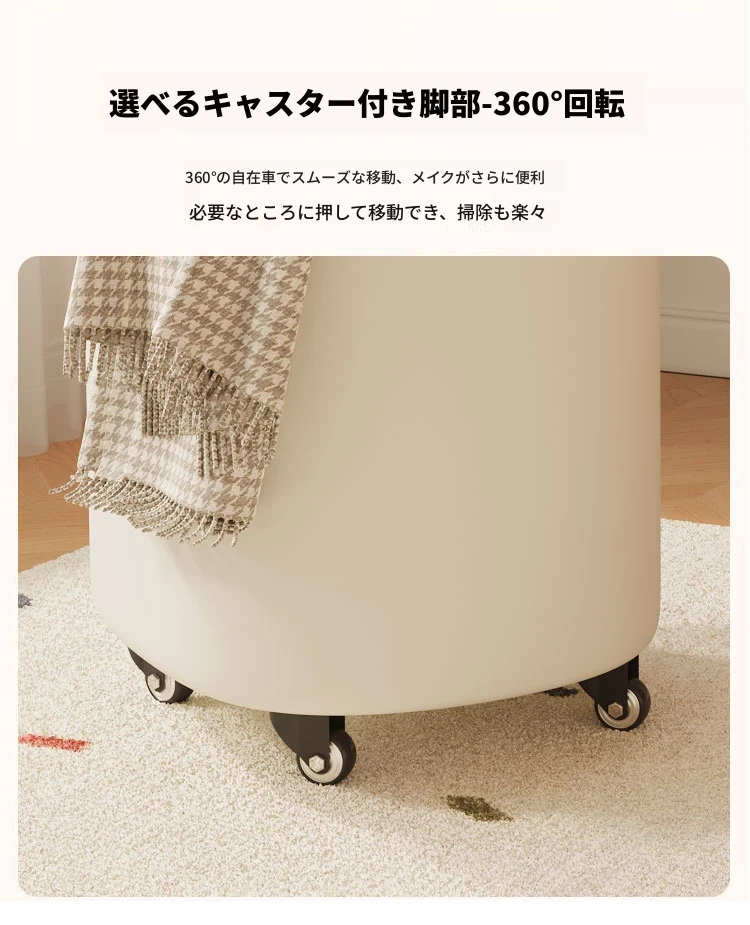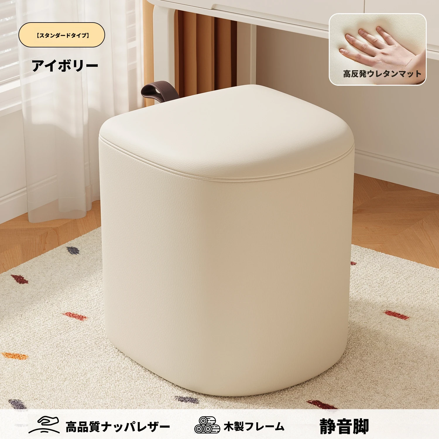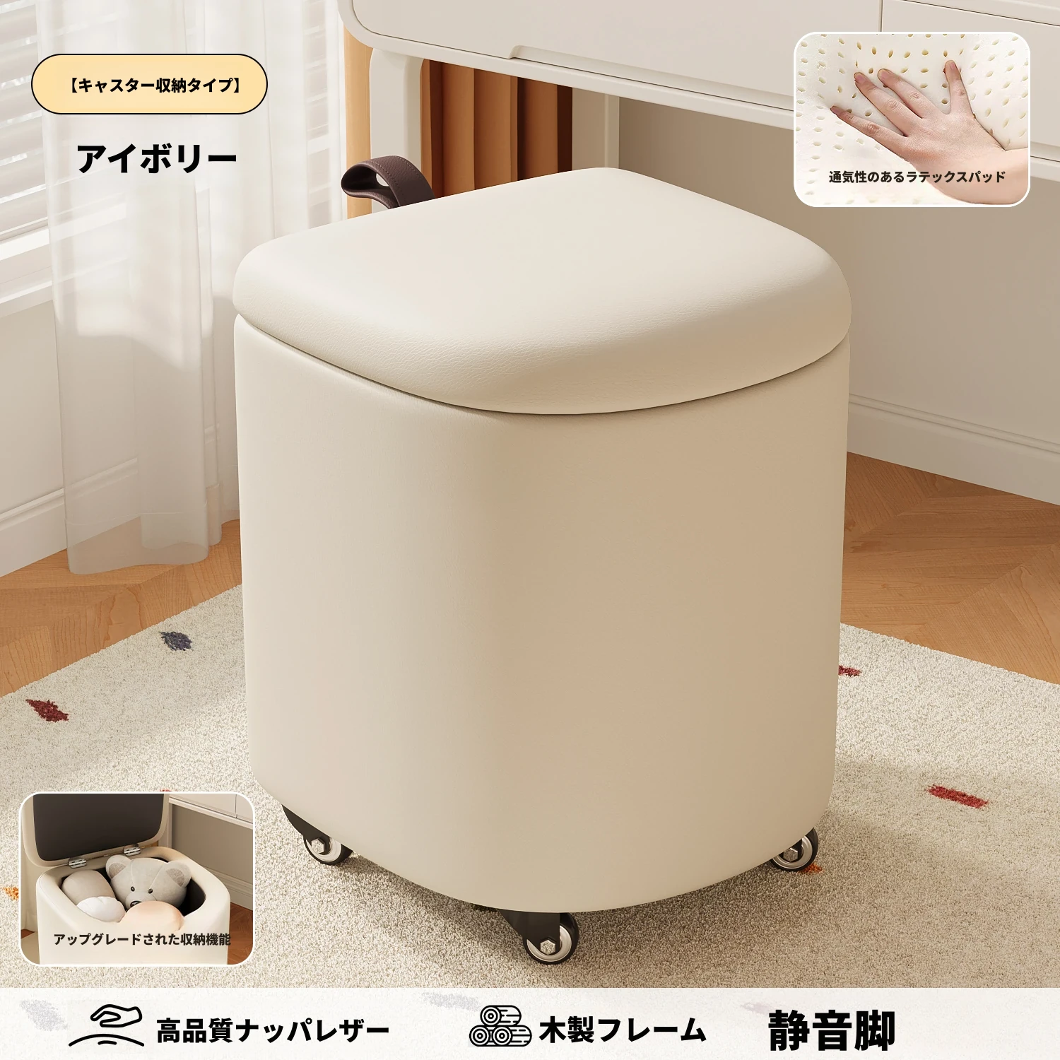 キャスター収納タイプ⭐アイボリー【高弾力スポンジマット】高品質ナッパレザー-360°回転
