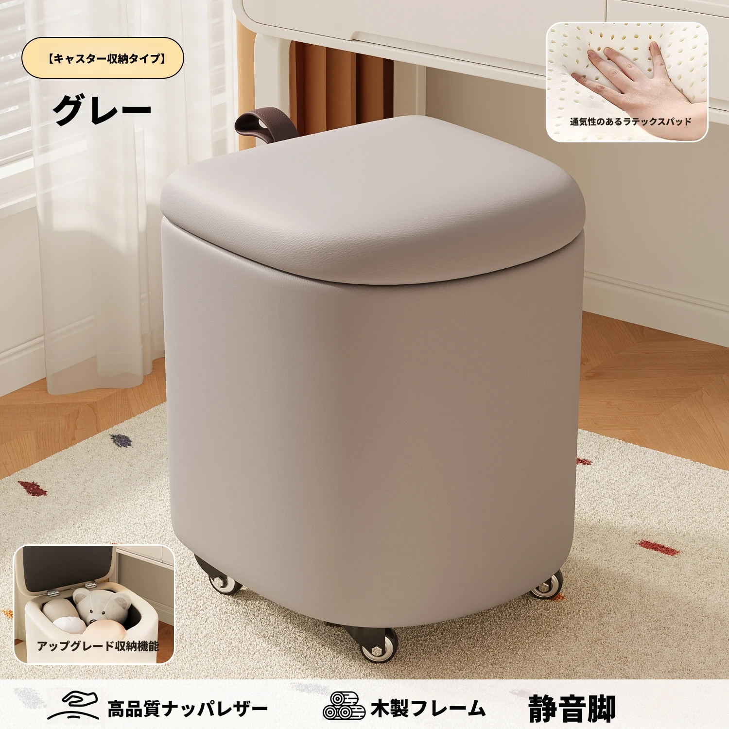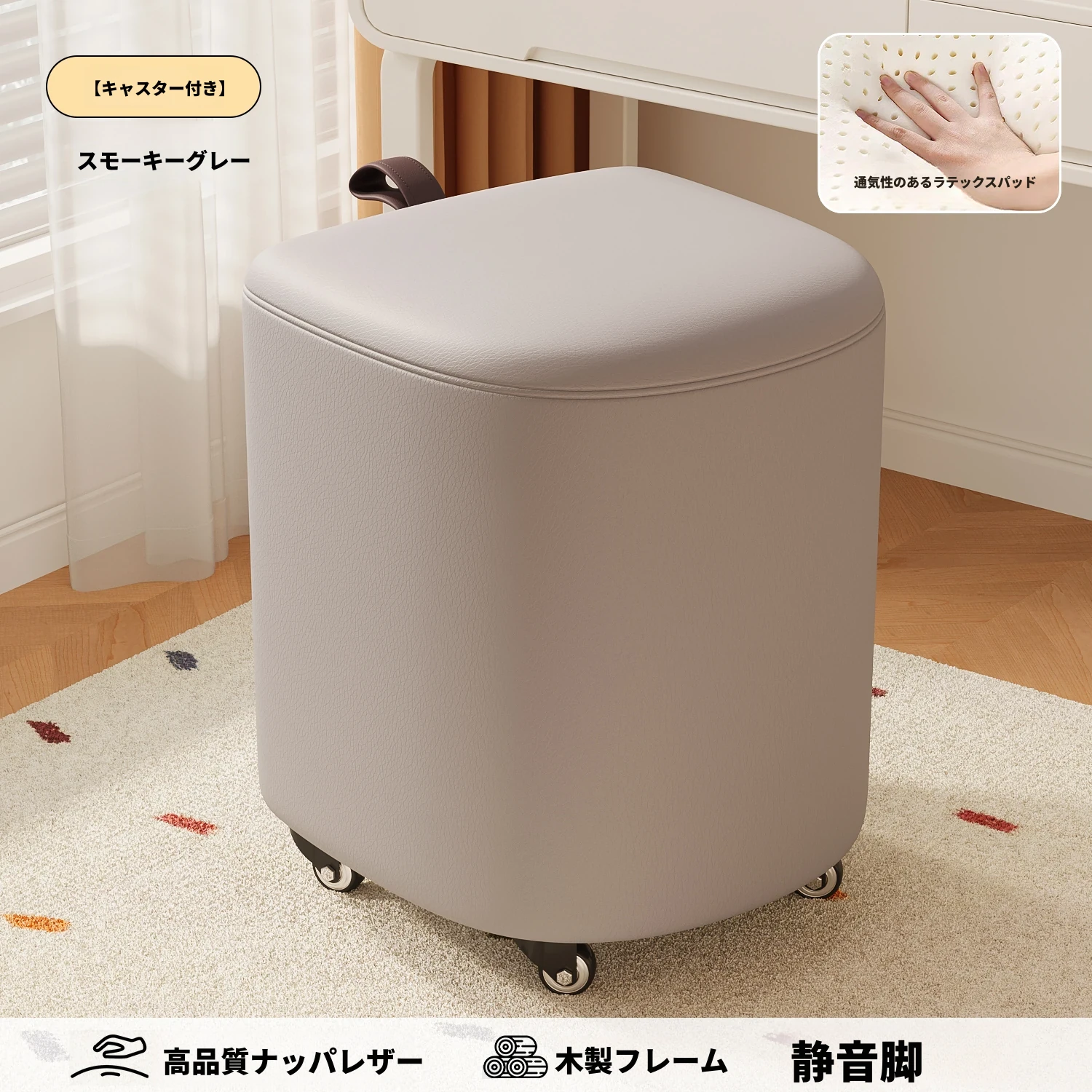 キャスター収納タイプ⭐スモーキーグレー【通気性ラテックスマット】高品質ナッパレザー-360°回転