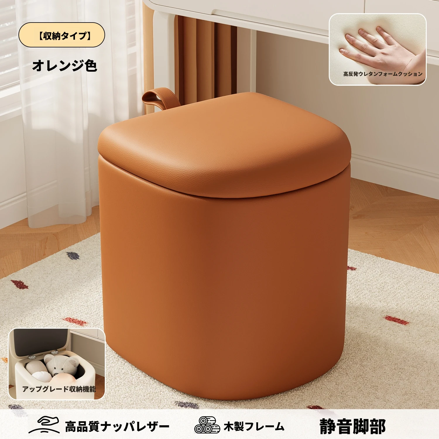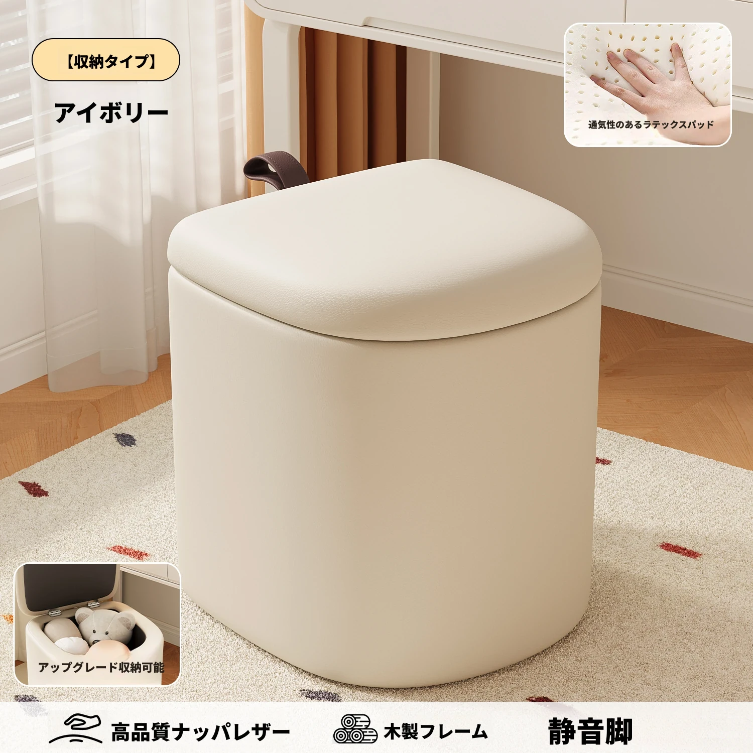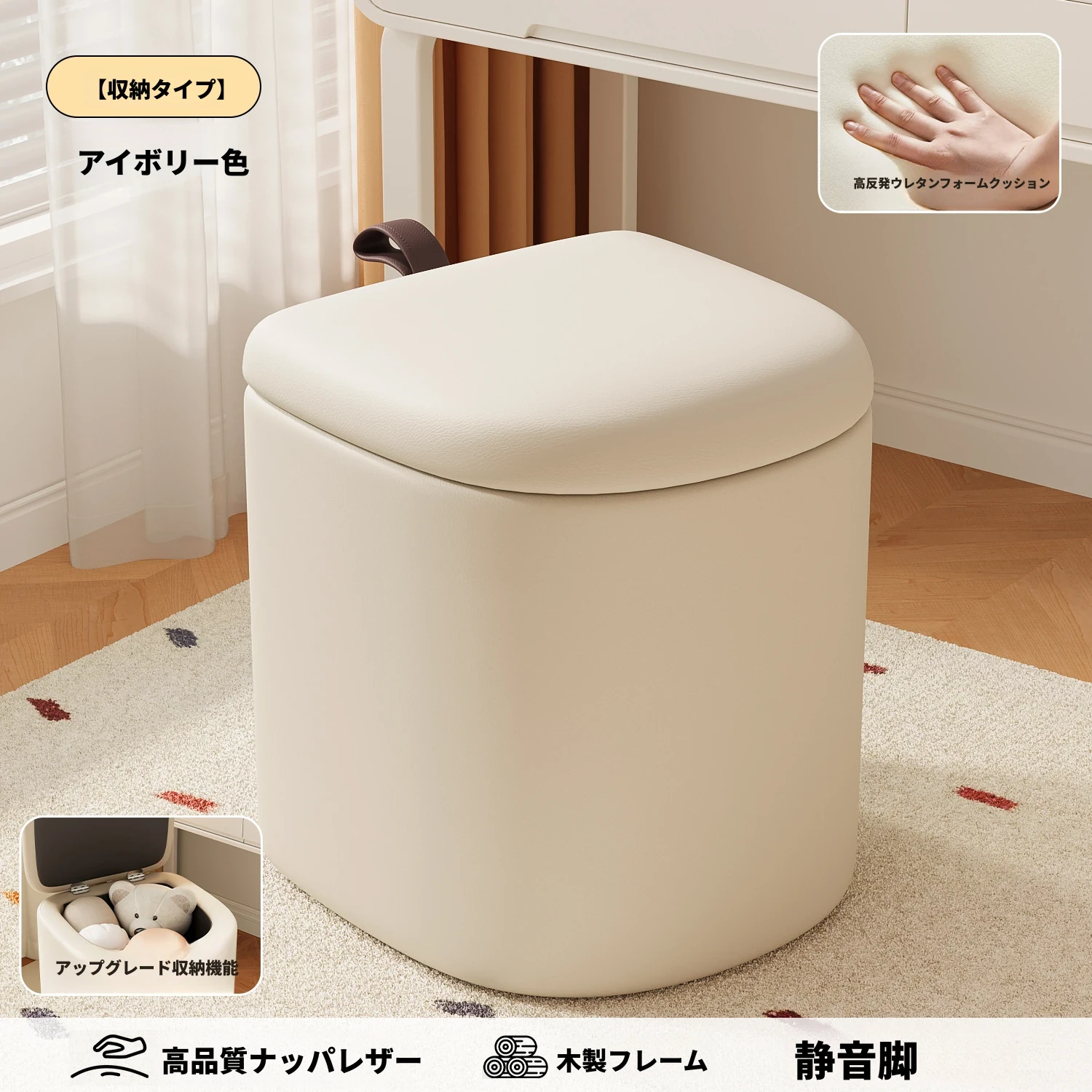 クリーム風化粧台椅子 - 女子向けの寝室にぴったり!収納機能付きで、軽やかで高級感溢れるデザイン。ネイルアートにも最適なスタイリッシュなスクエアスツール。あなたの特別な空間を演出します!