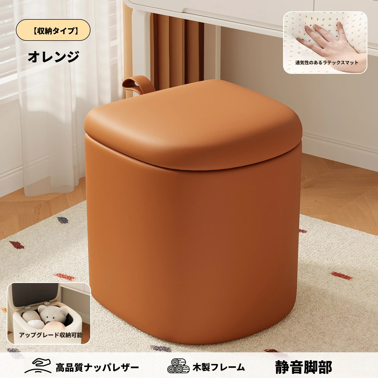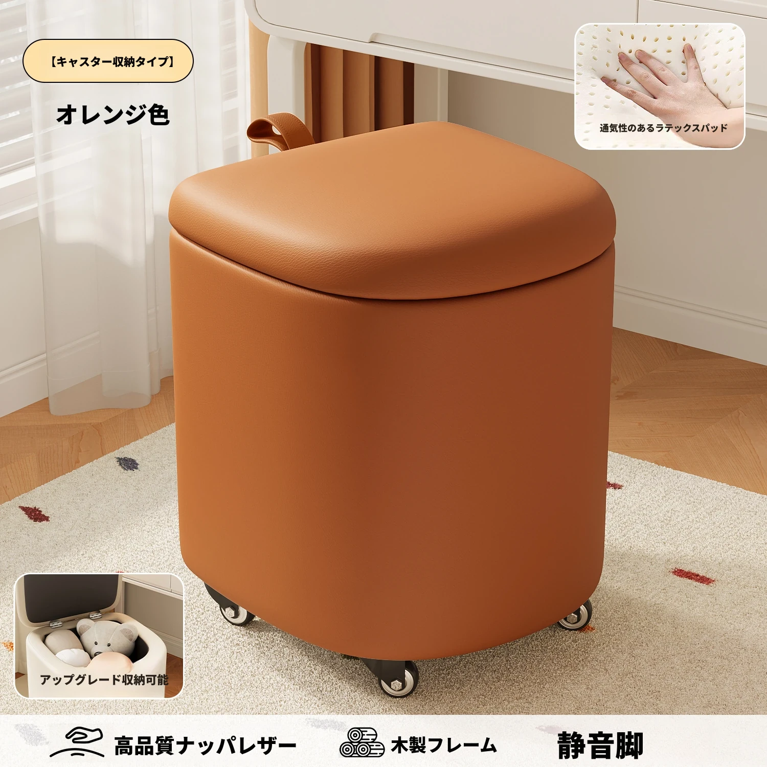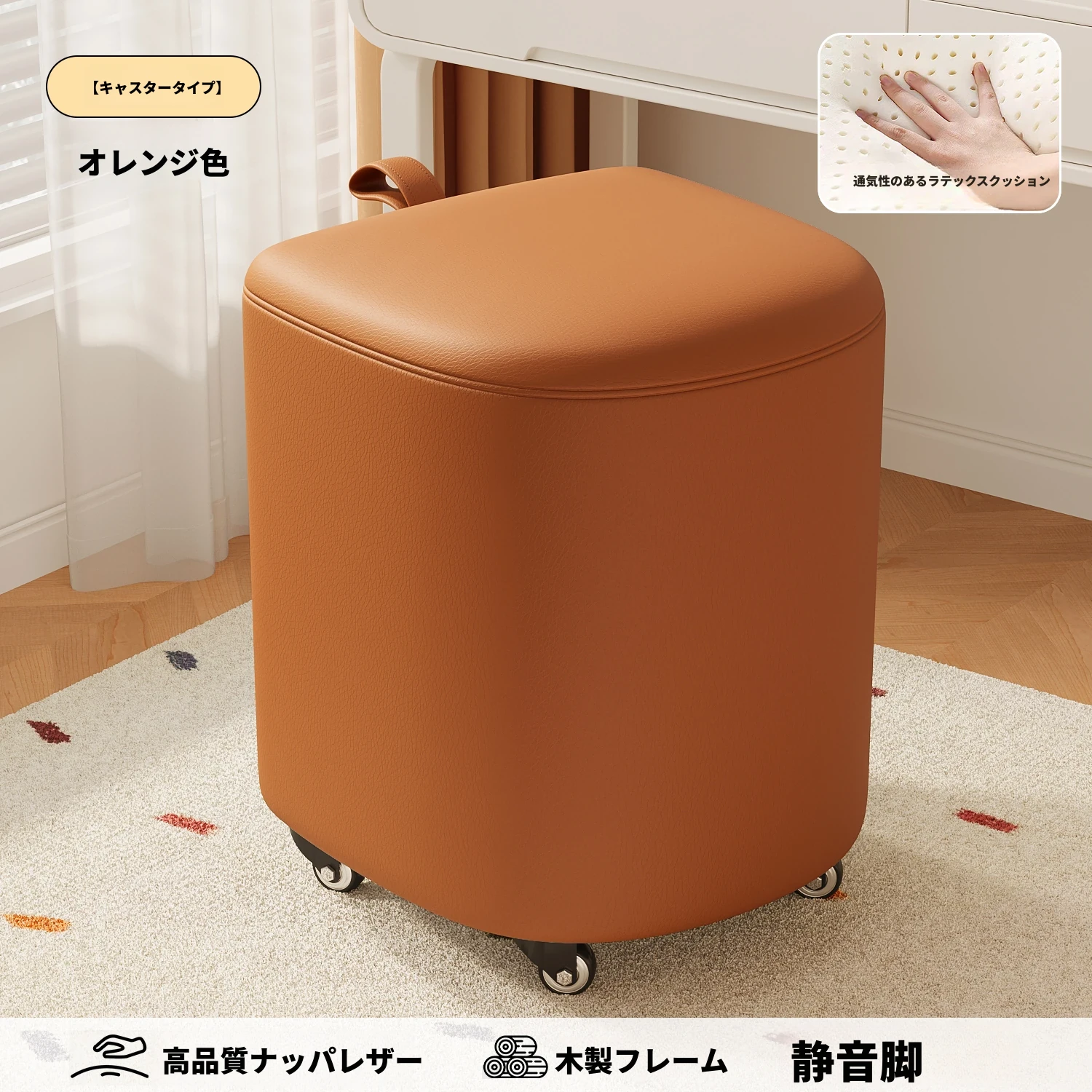 キャスター収納タイプ⭐オレンジレッド【通気性ラテックスマット】高品質ナッパレザー-360°回転