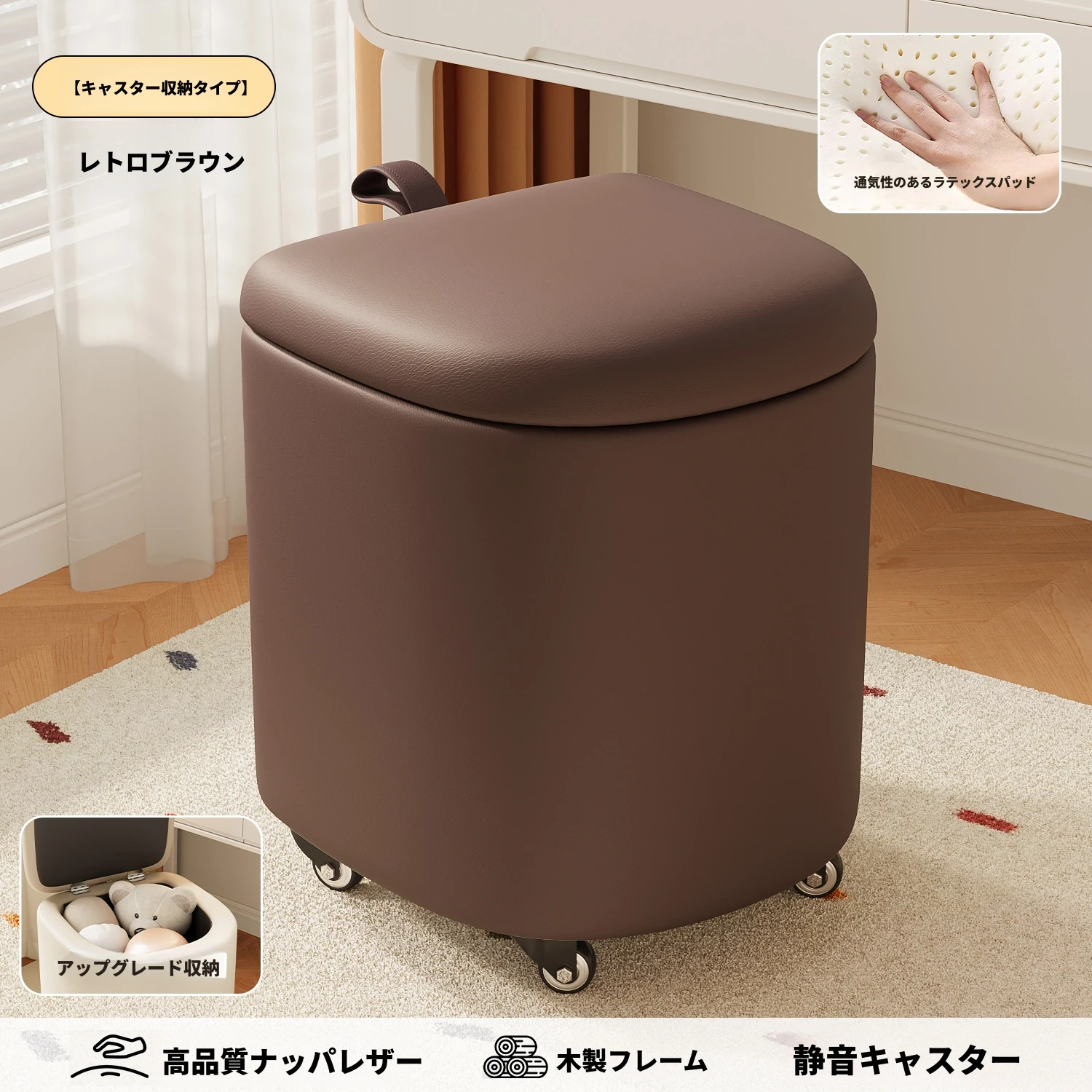 キャスター収納タイプ⭐レトロブラウン【通気性ラテックスマット】高品質ナッパレザー-360°回転