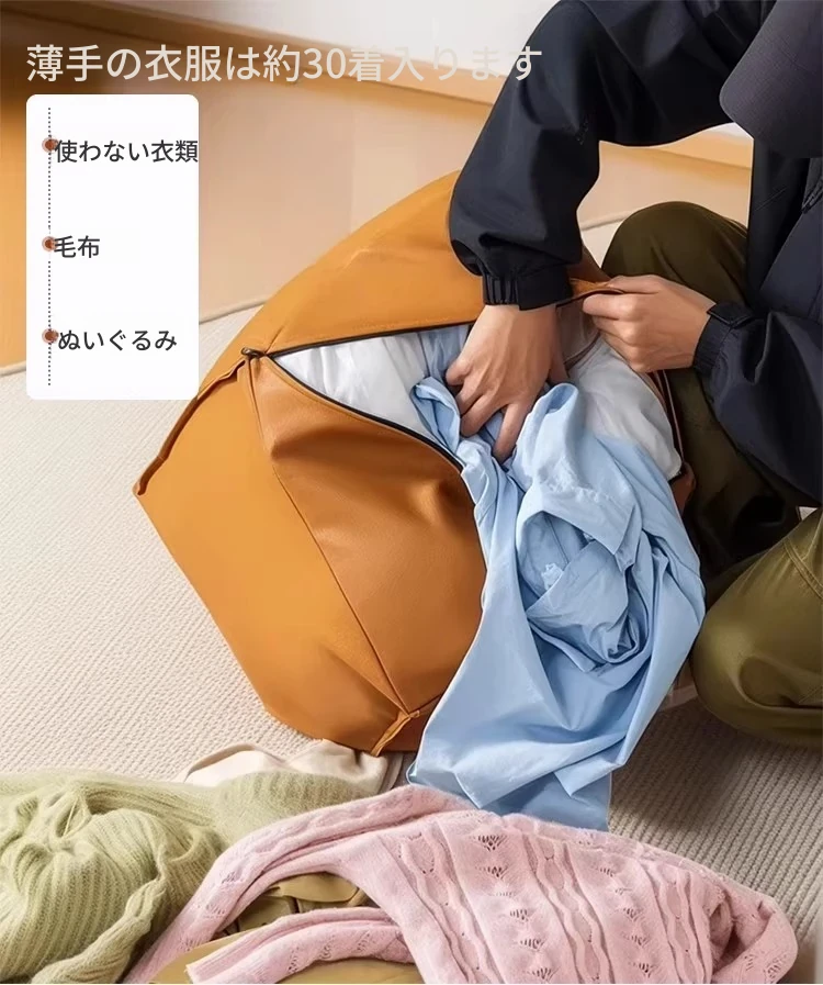 リラックスソファカバー - 使わなくなった衣類で作られたエコなファブリック!ぬいぐるみやおもちゃを収納できる便利なバッグ付き。畳の座椅子やクッションとしても使える多機能アイテム!快適なひとときをお楽しみください。