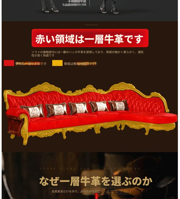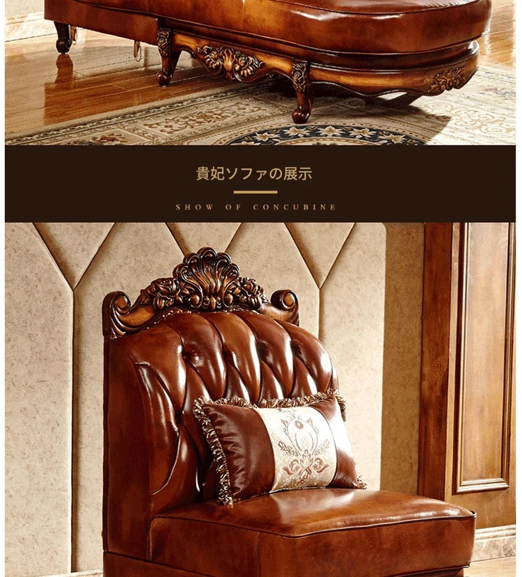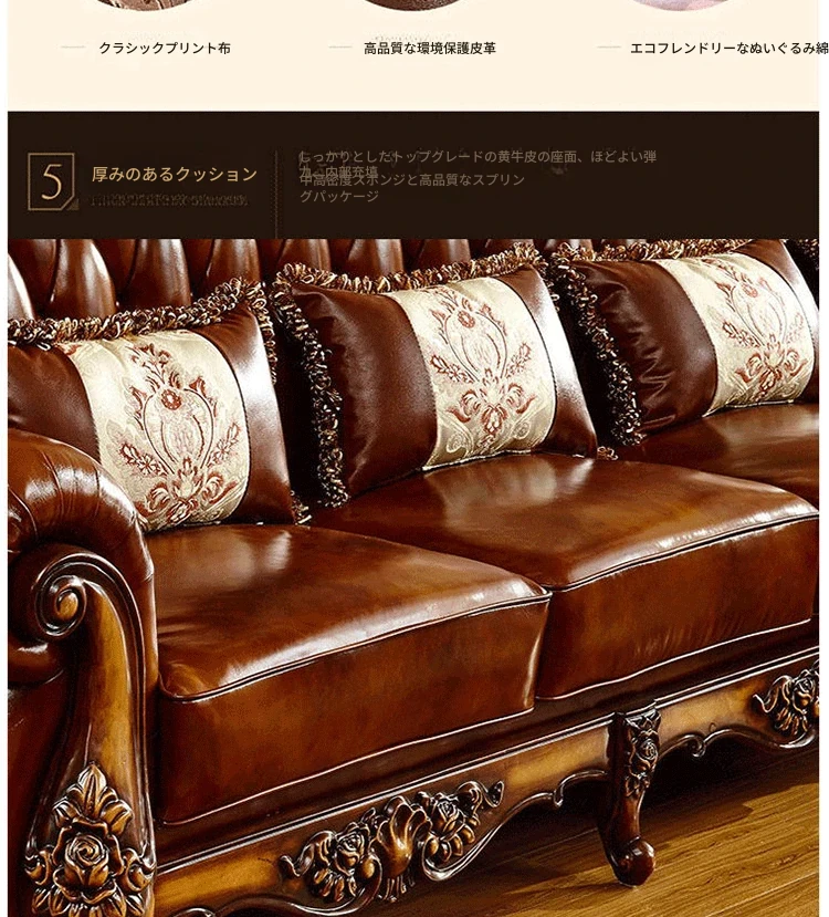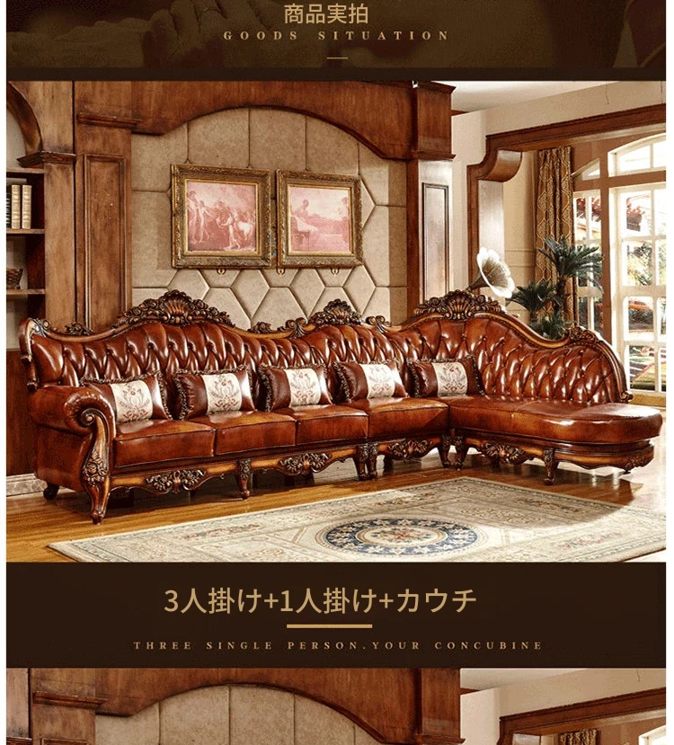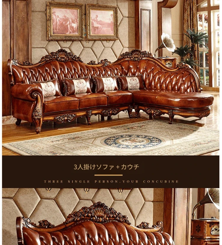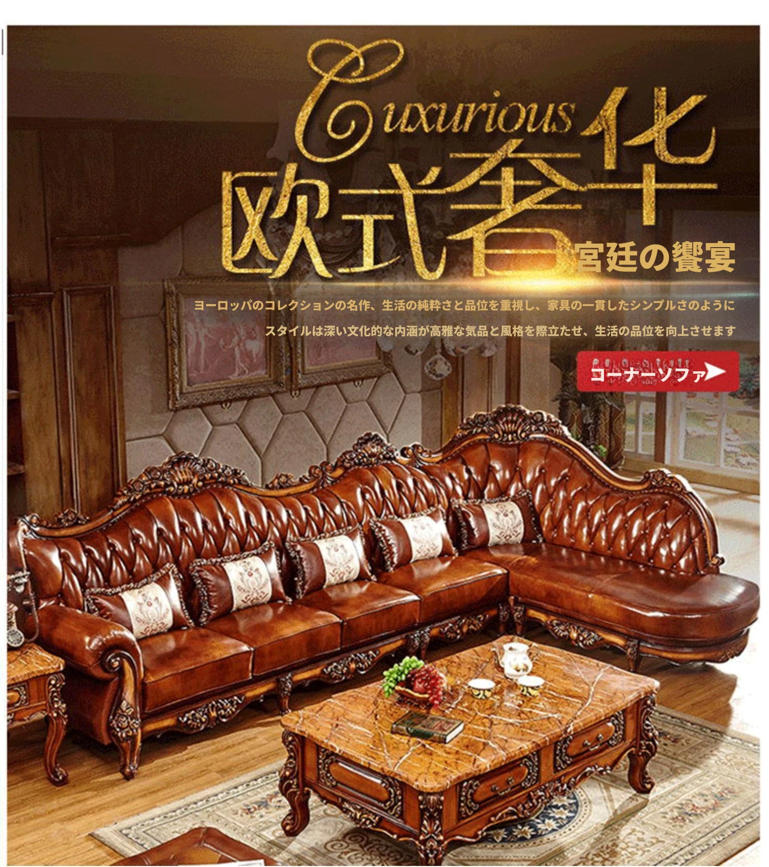 高級感溢れる欧式真皮カウチソファ!豪華なコーナー組み合わせと貴婦人のデザイン、最高級の牛革と彫刻された無垢材を使用した贅沢な別荘リビング家具。おしゃれで快適な空間を演出します!
