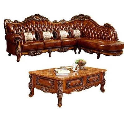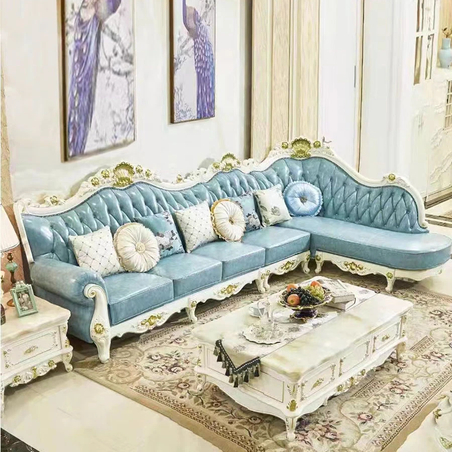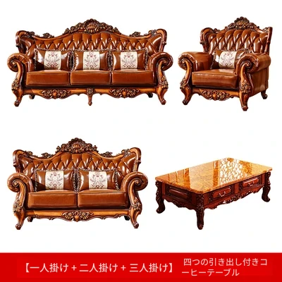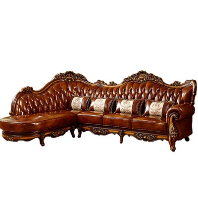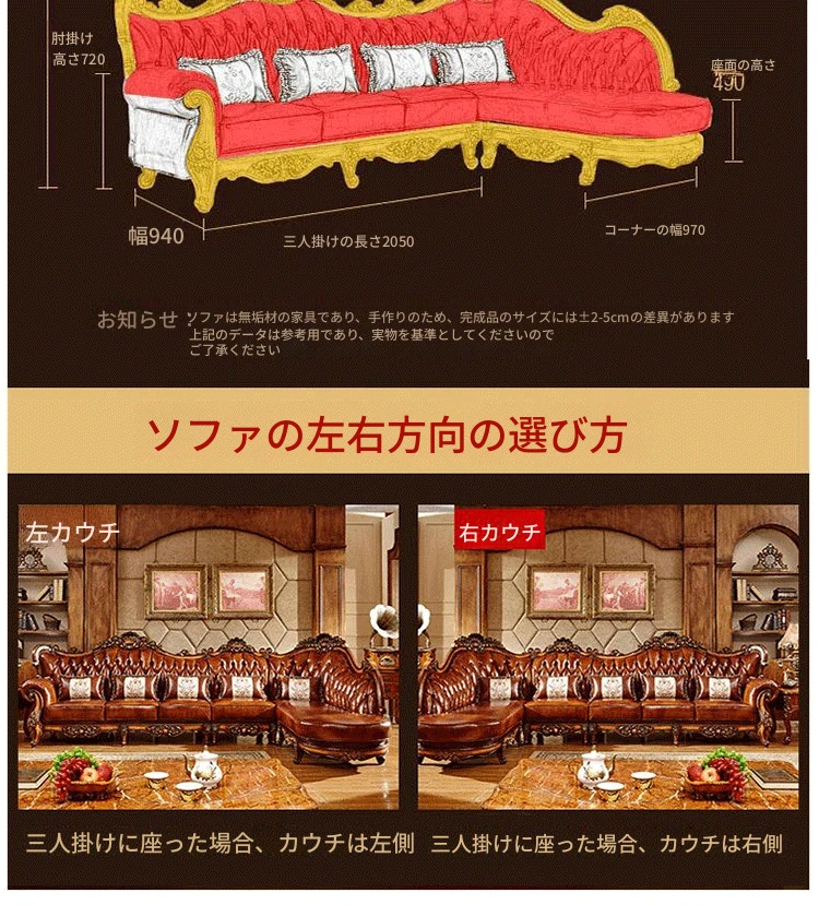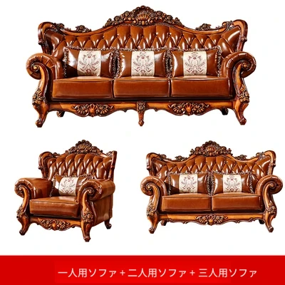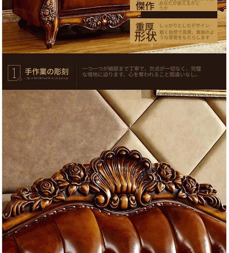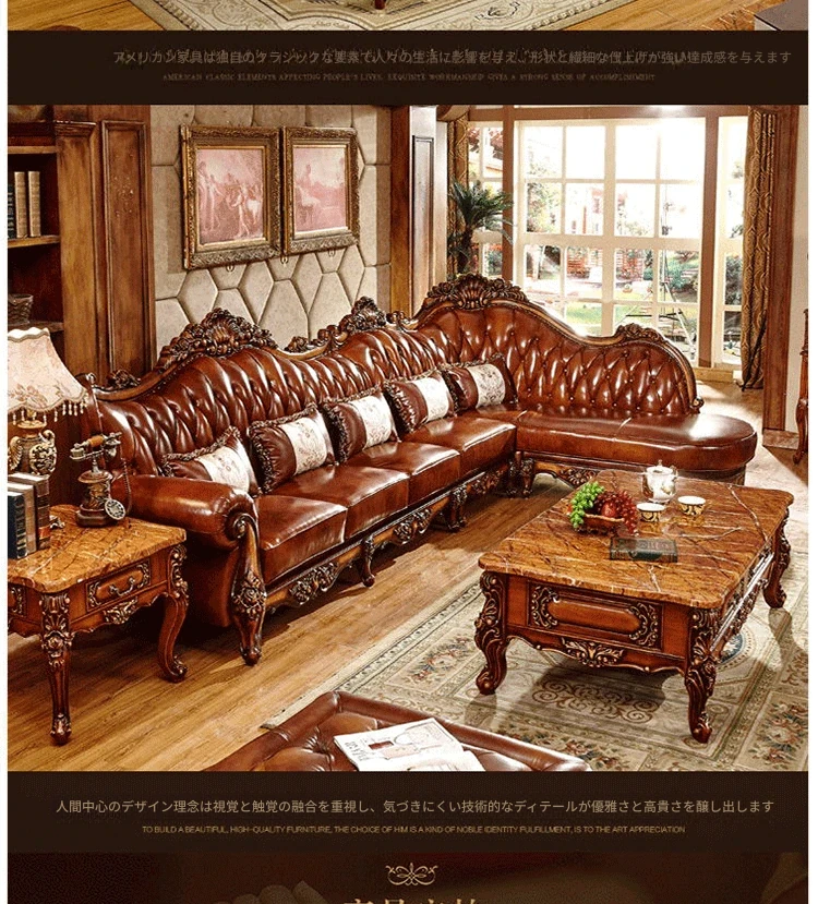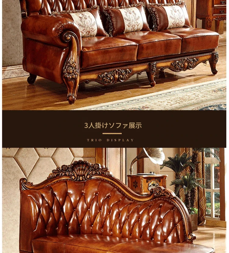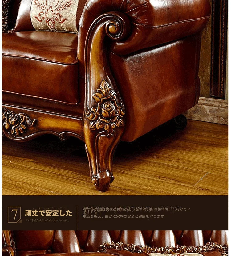 高級感溢れる欧式真皮カウチソファ!豪華なコーナー組み合わせと貴婦人のデザイン、最高級の牛革と彫刻された無垢材を使用した贅沢な別荘リビング家具。おしゃれで快適な空間を演出します!