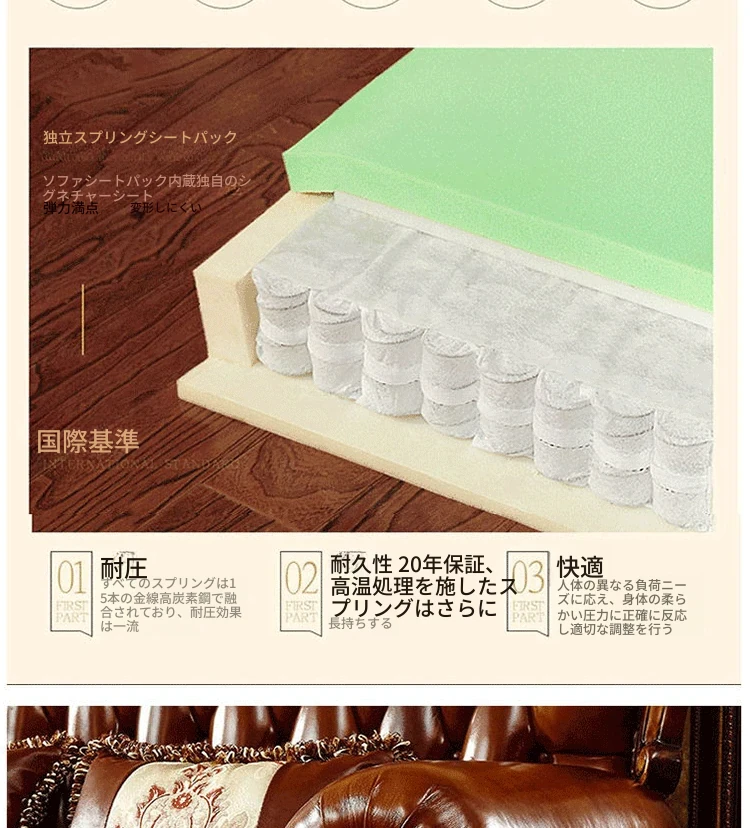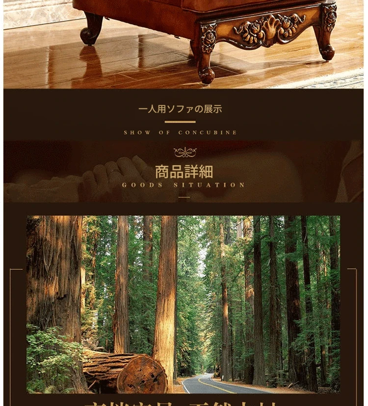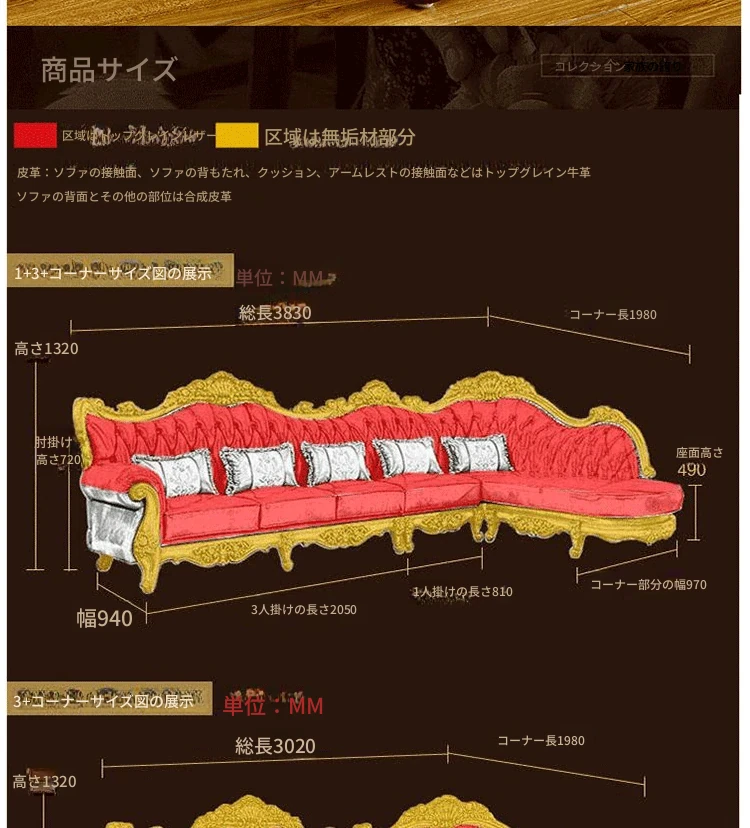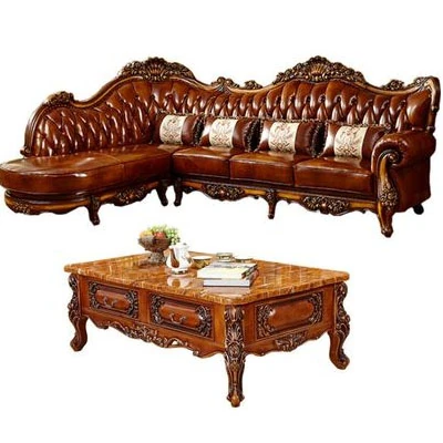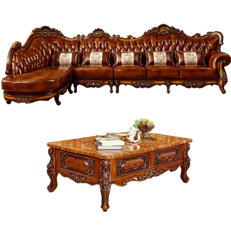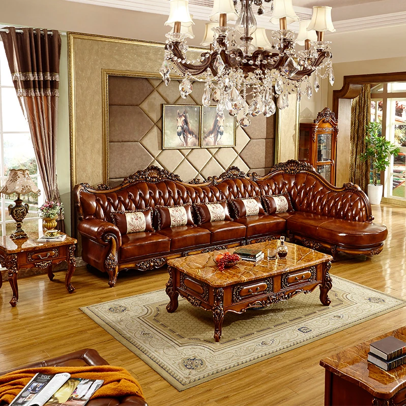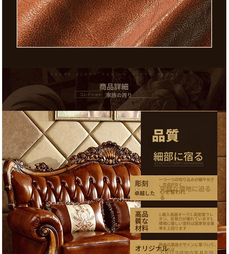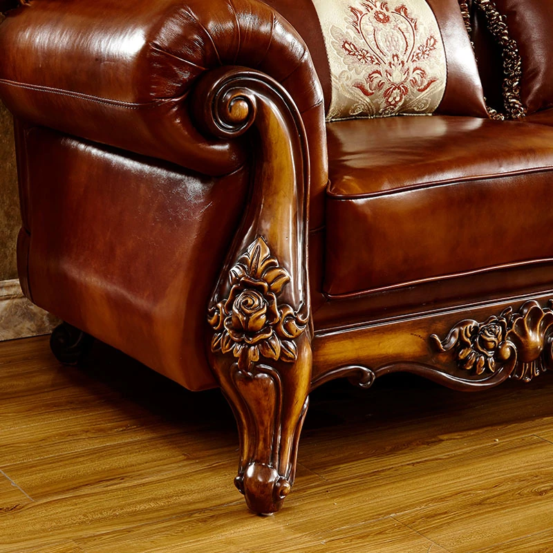 高級感溢れる欧式真皮カウチソファ!豪華なコーナー組み合わせと貴婦人のデザイン、最高級の牛革と彫刻された無垢材を使用した贅沢な別荘リビング家具。おしゃれで快適な空間を演出します!