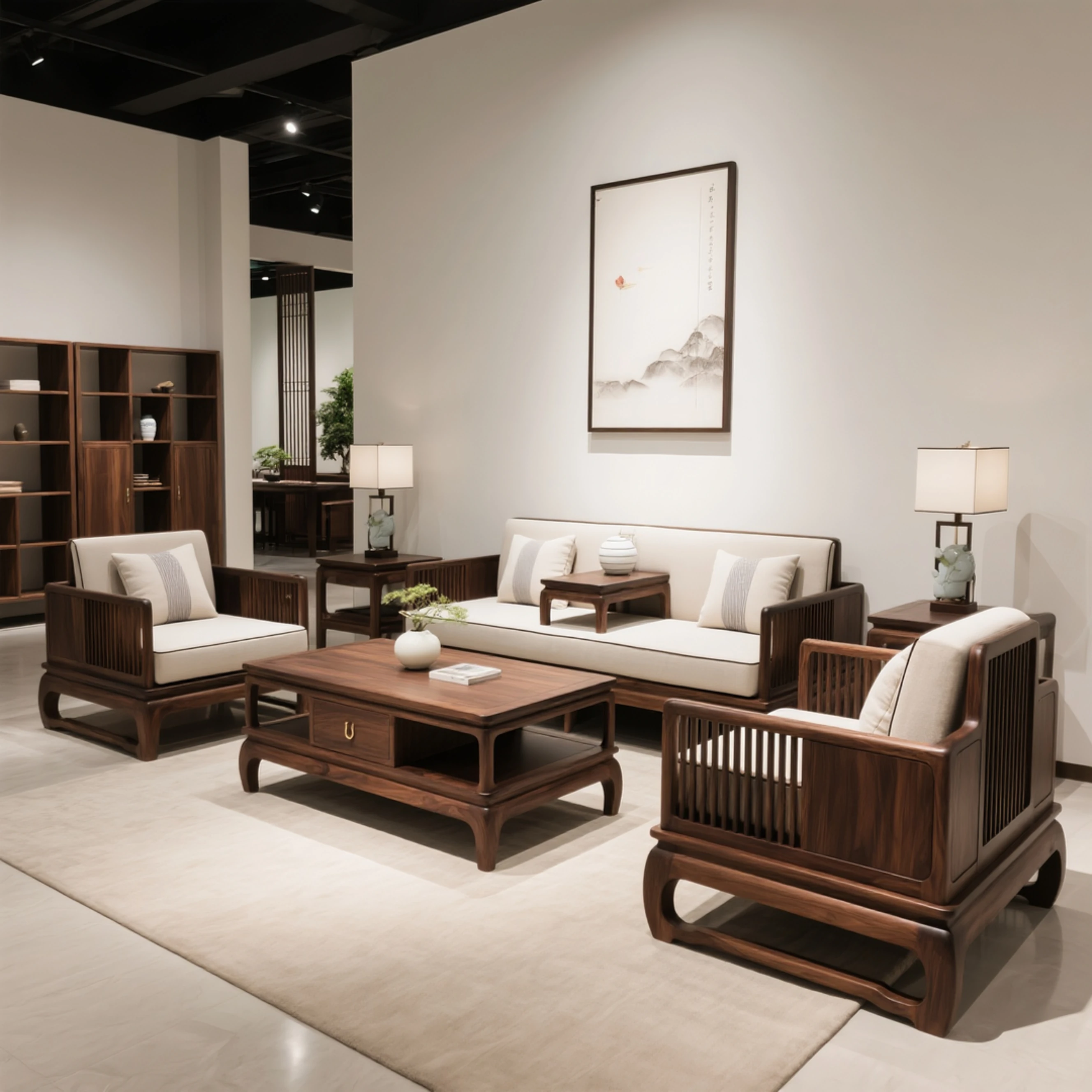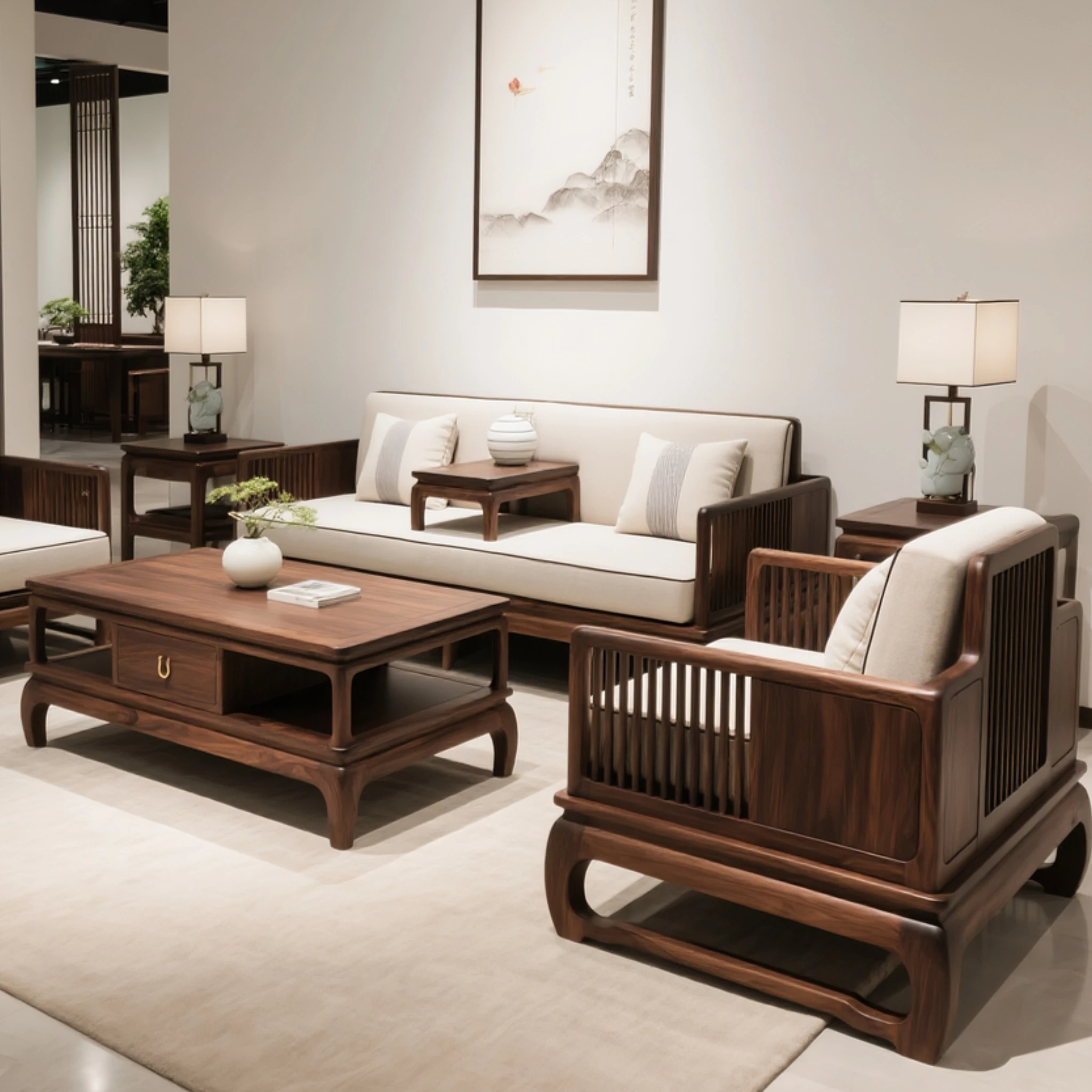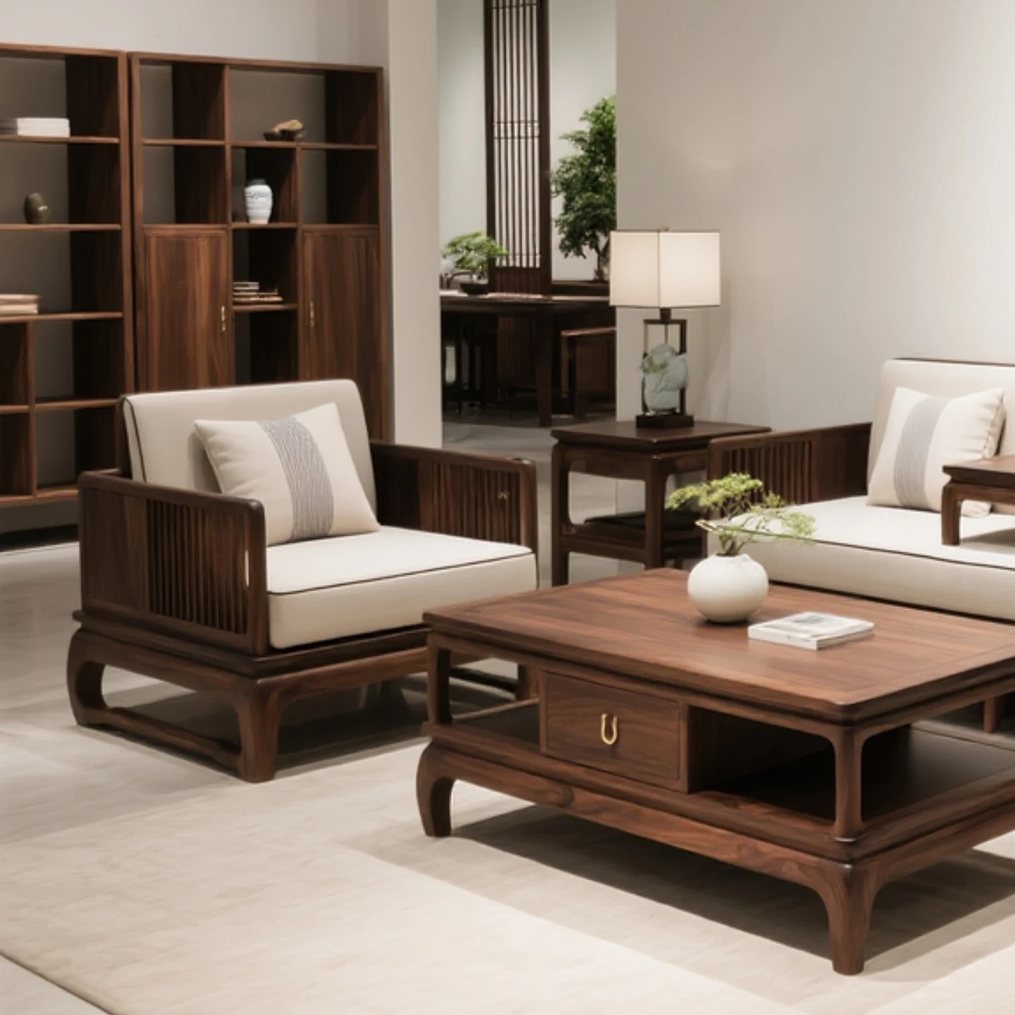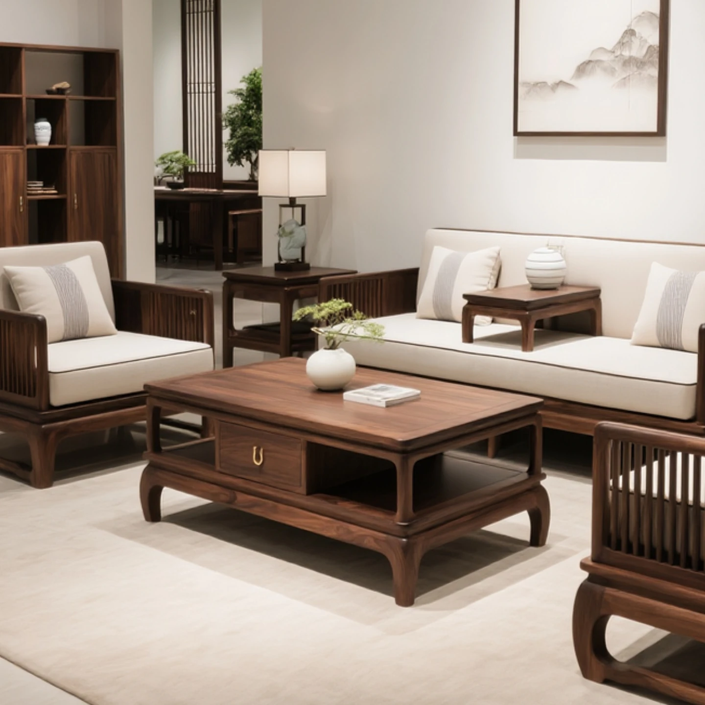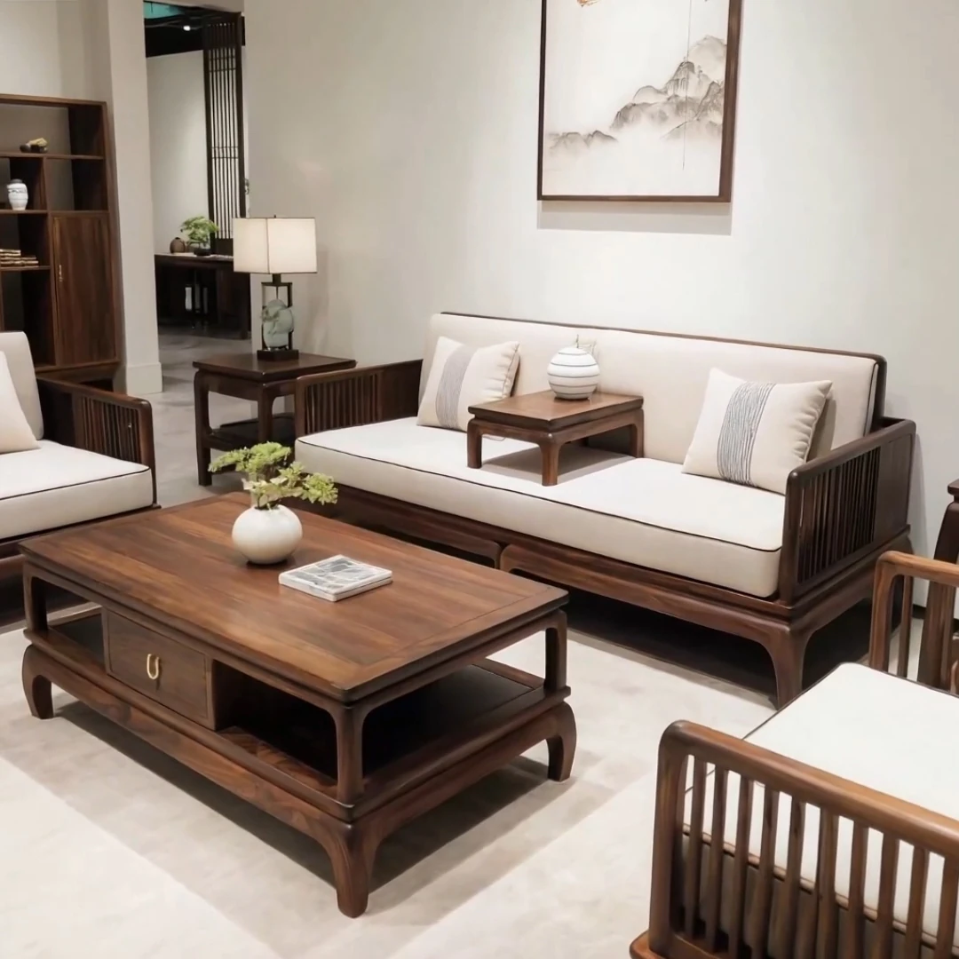 新中式デザインの黒胡桃木ソファセット - 宋氏美学を取り入れた本格的な無垢材使用、現代的でシンプルなスタイルが魅力の別荘リビングにぴったりなソファ!