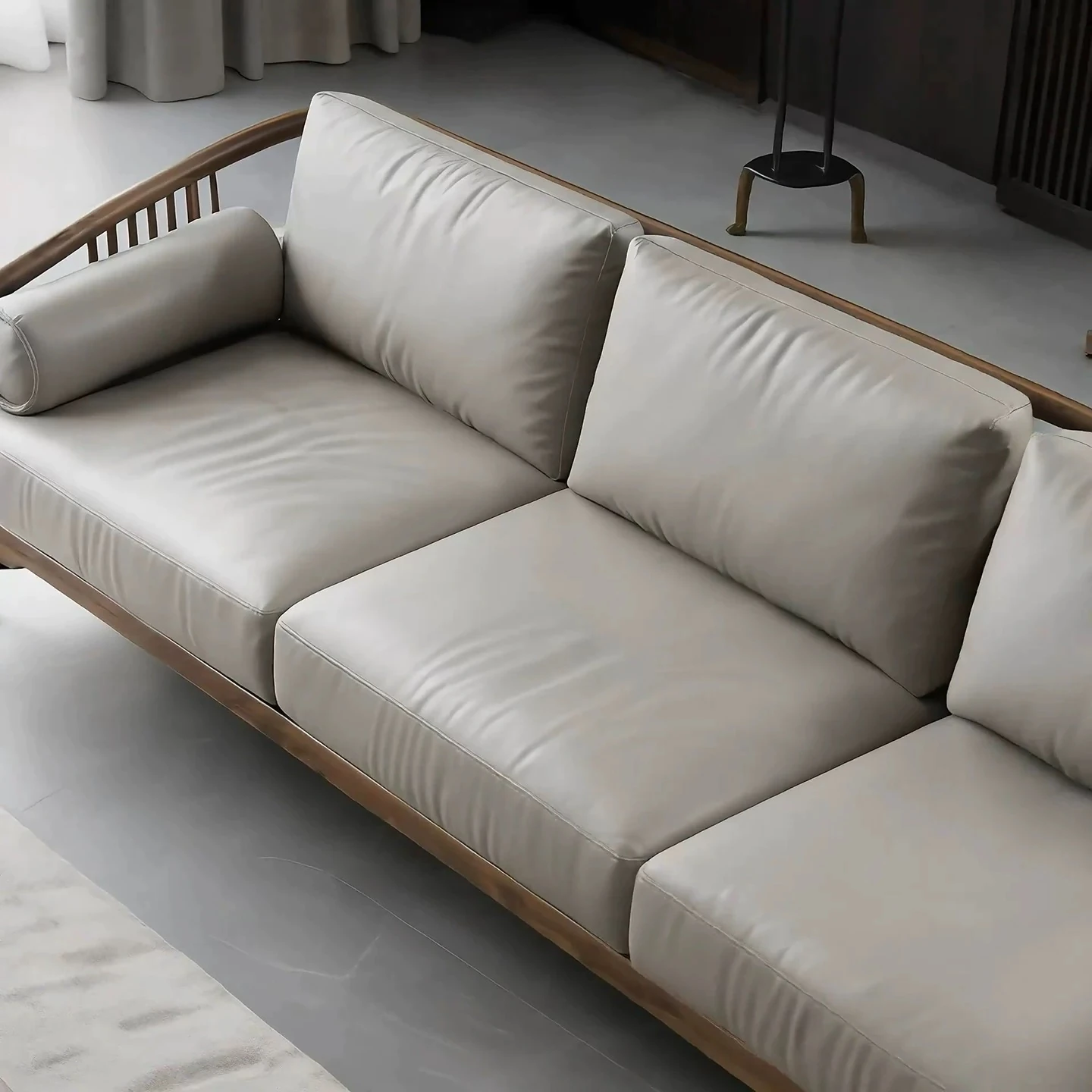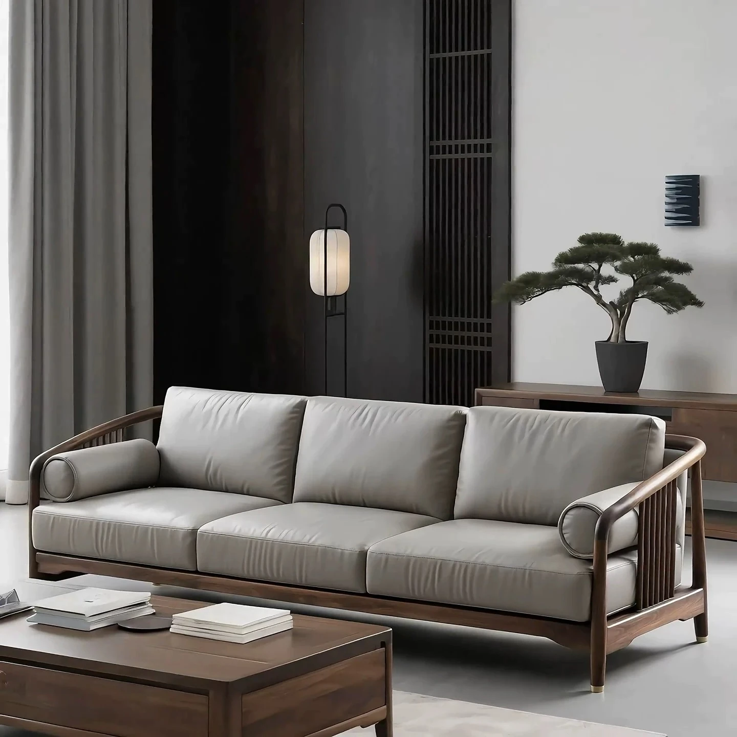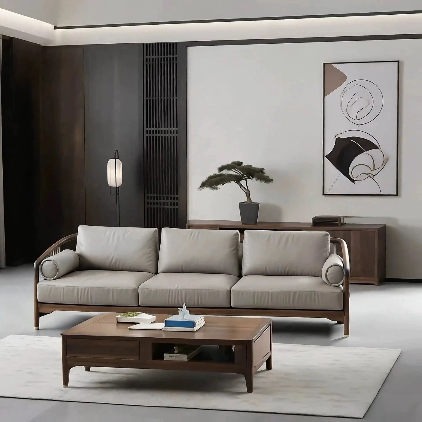 新中式デザインの北米産ブラックウォールナット無垢材と本革を使用したリビングルーム用ソファセット。モダンでシンプルな3人掛けソファで、別荘にもぴったりの上質な空間を演出します。