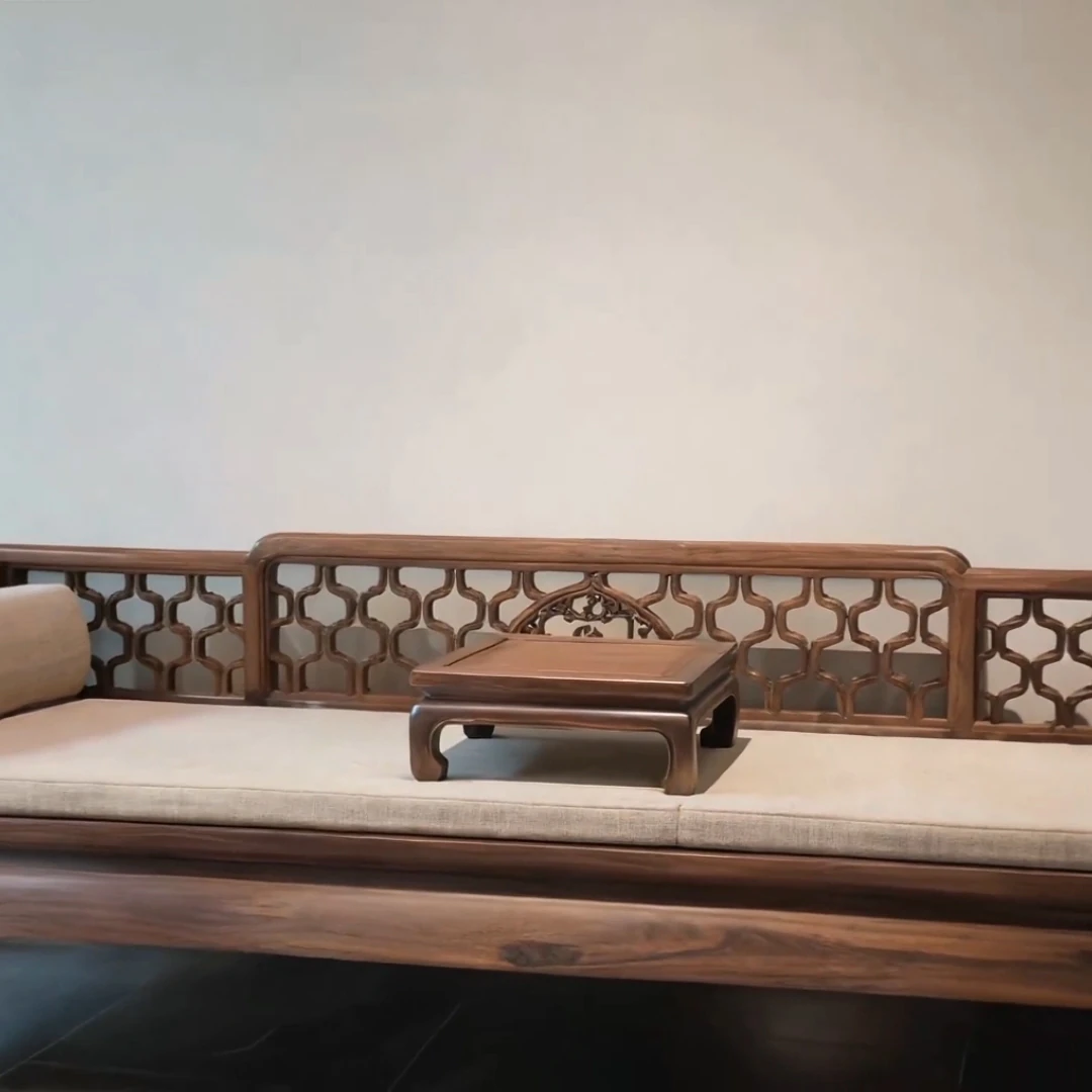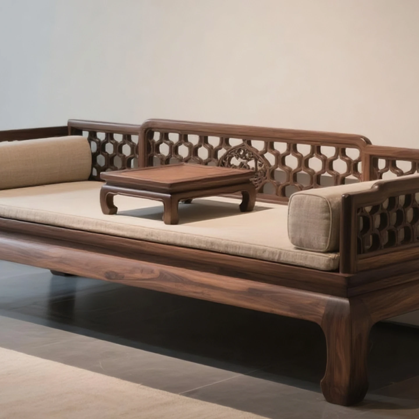 新中式デザインの北米産ブラックウォールナット製ロハンベッド - 精巧な彫刻が施された実木製、リビングルームや茶室にぴったりな禅の雰囲気を楽しめるソファです。心安らぐ空間を演出します。