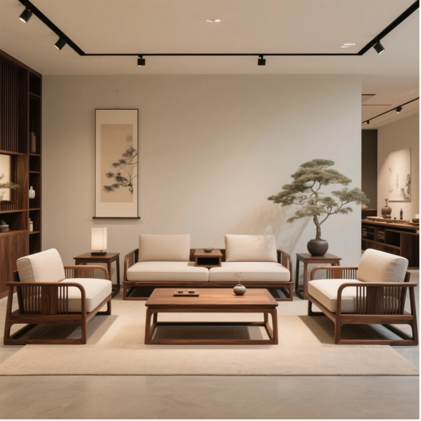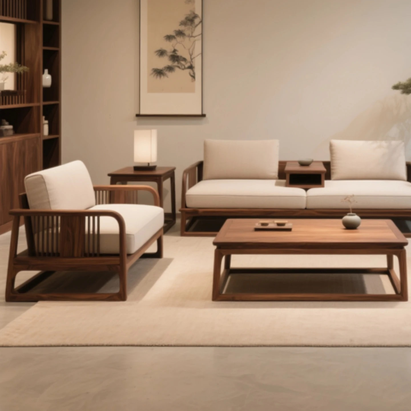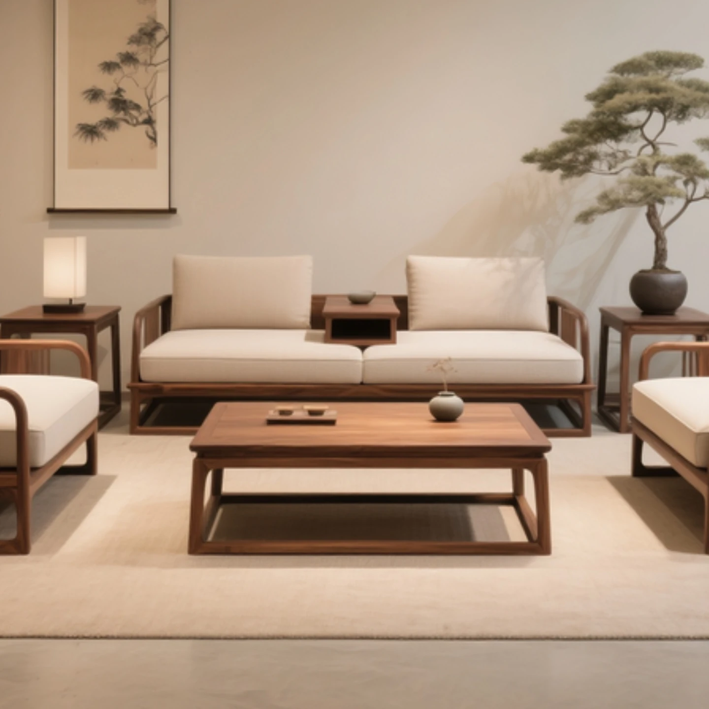 新中式スタイルの北米産ブラックウォールナット木製ソファセット - 宋氏美学を取り入れたシンプルな布張り3人掛けソファ。洗練されたデザインで、あなたのリビングルームに上質な雰囲気をプラスします!