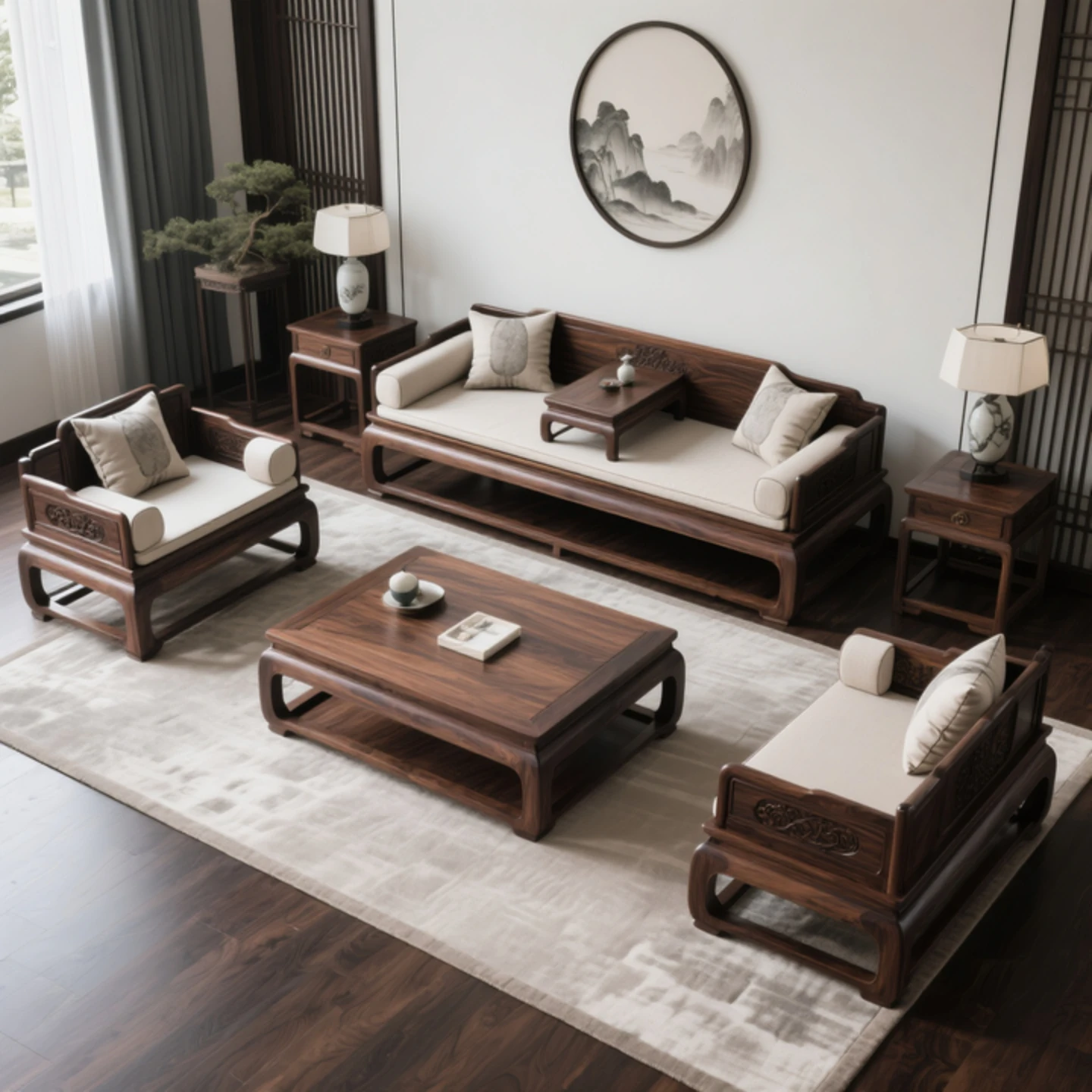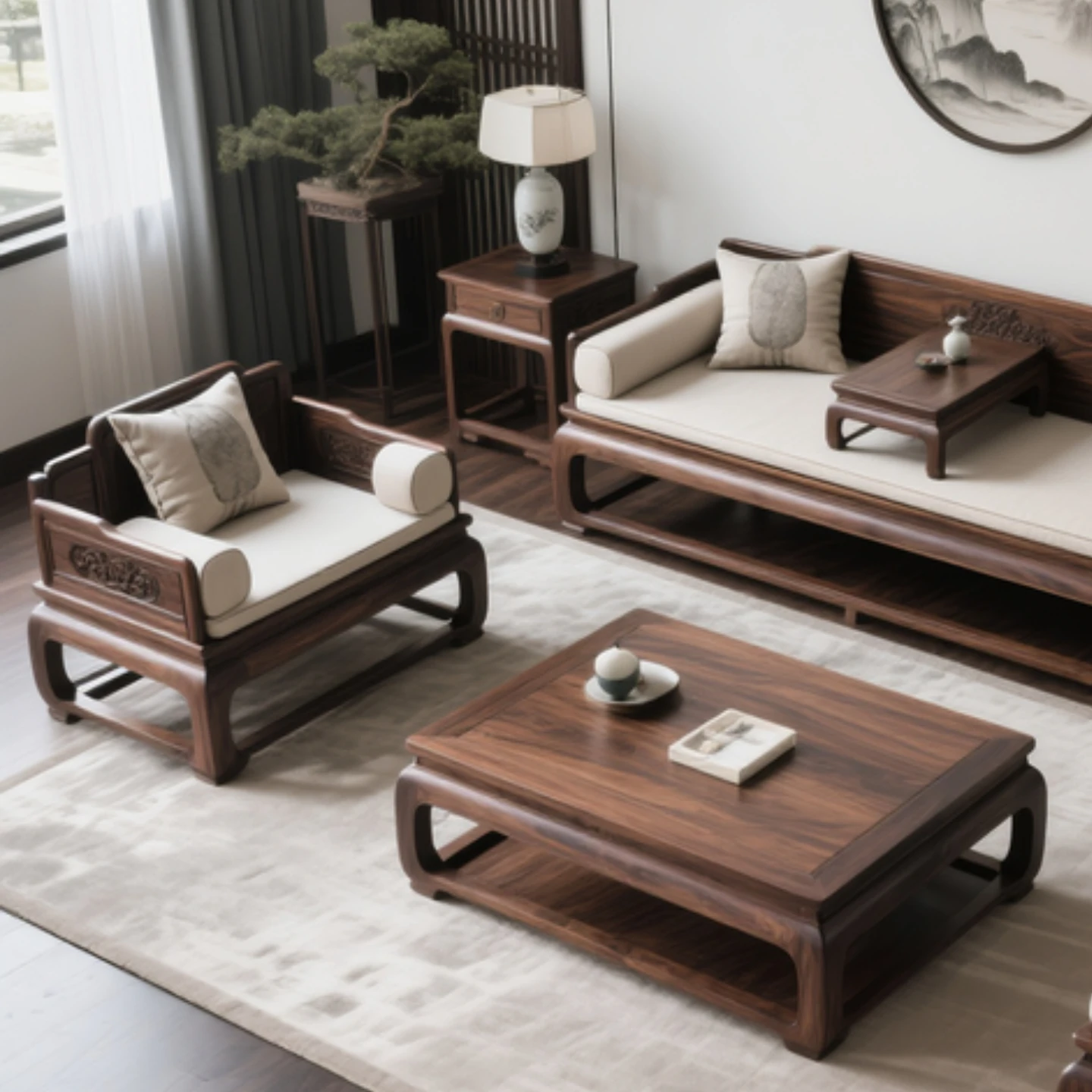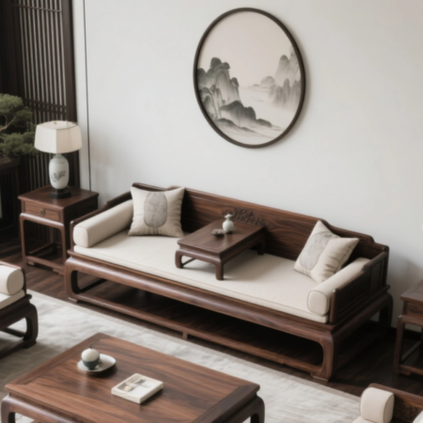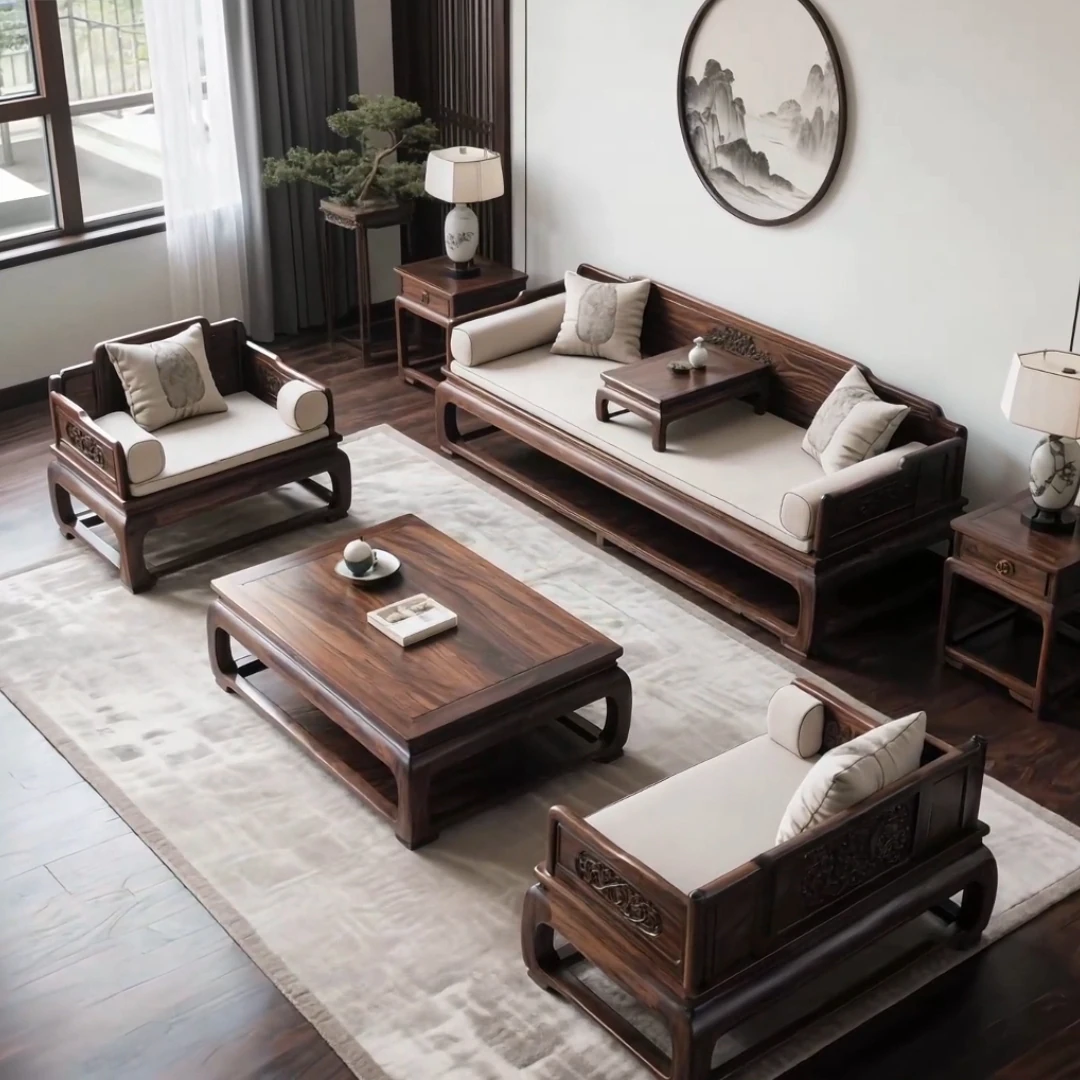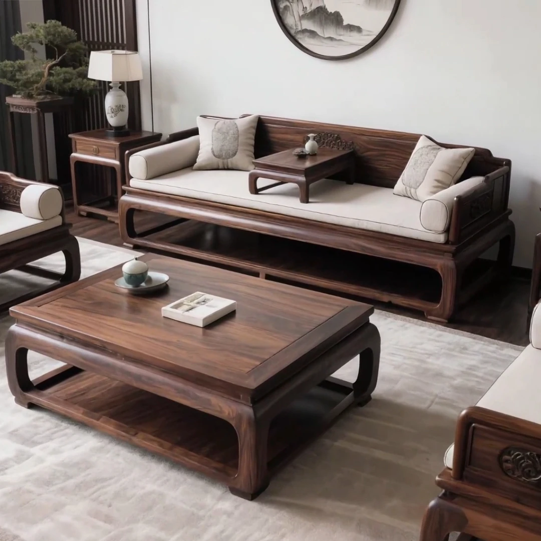 新中式デザインの北米産ブラックウォルナット無垢材ソファセット、ホワイトアッシュのロハンベッド付き。リビングや茶室に最適な禅の心を感じるソファベッド。心地よい空間を演出します!