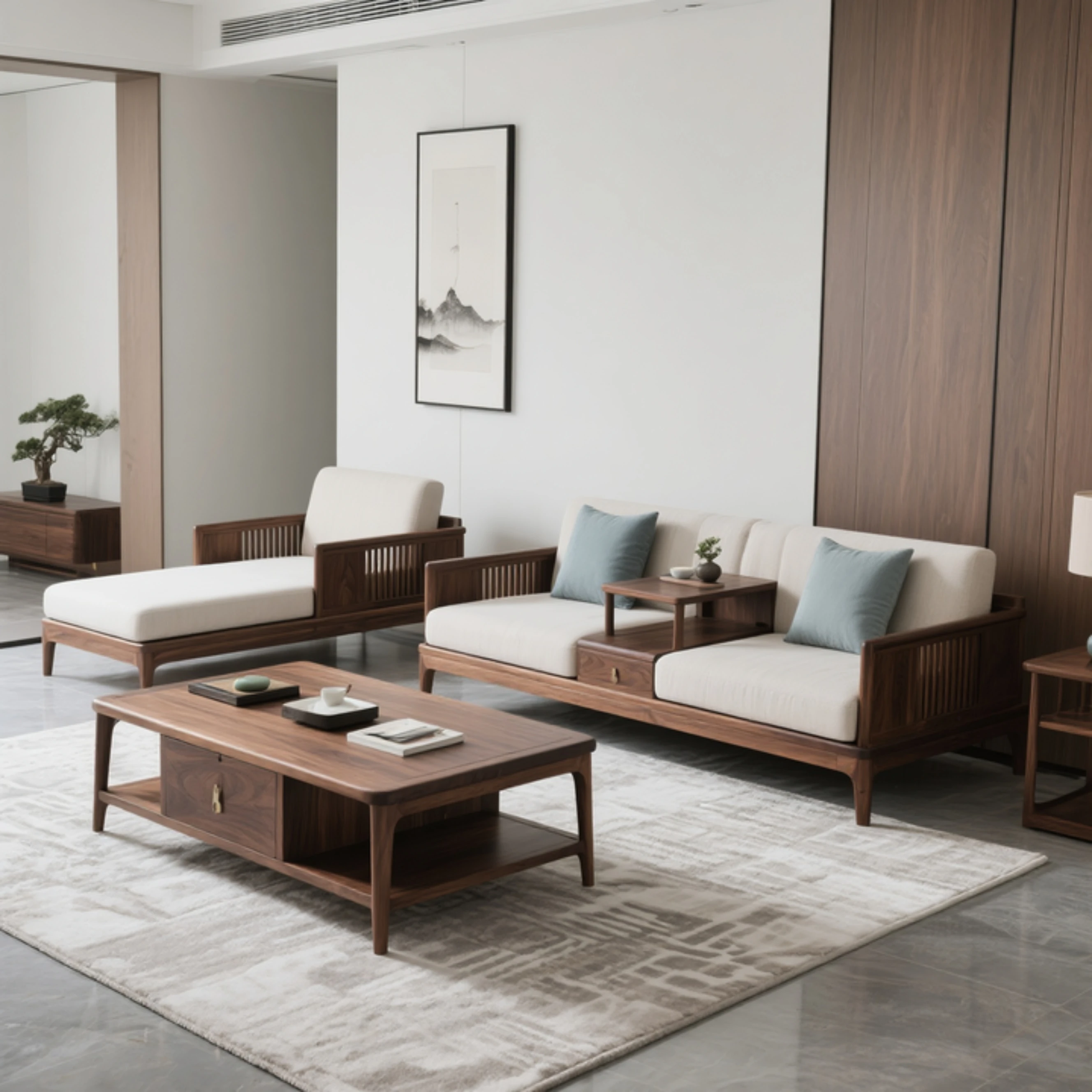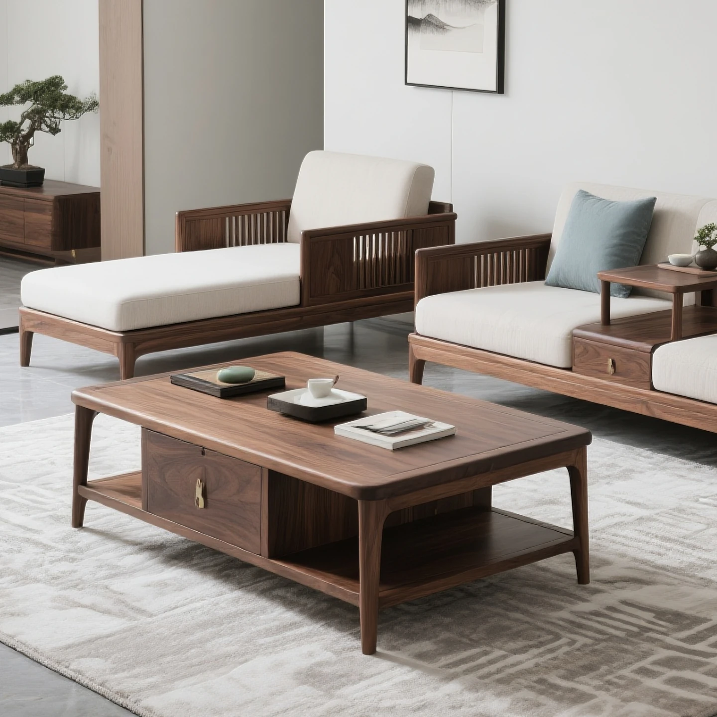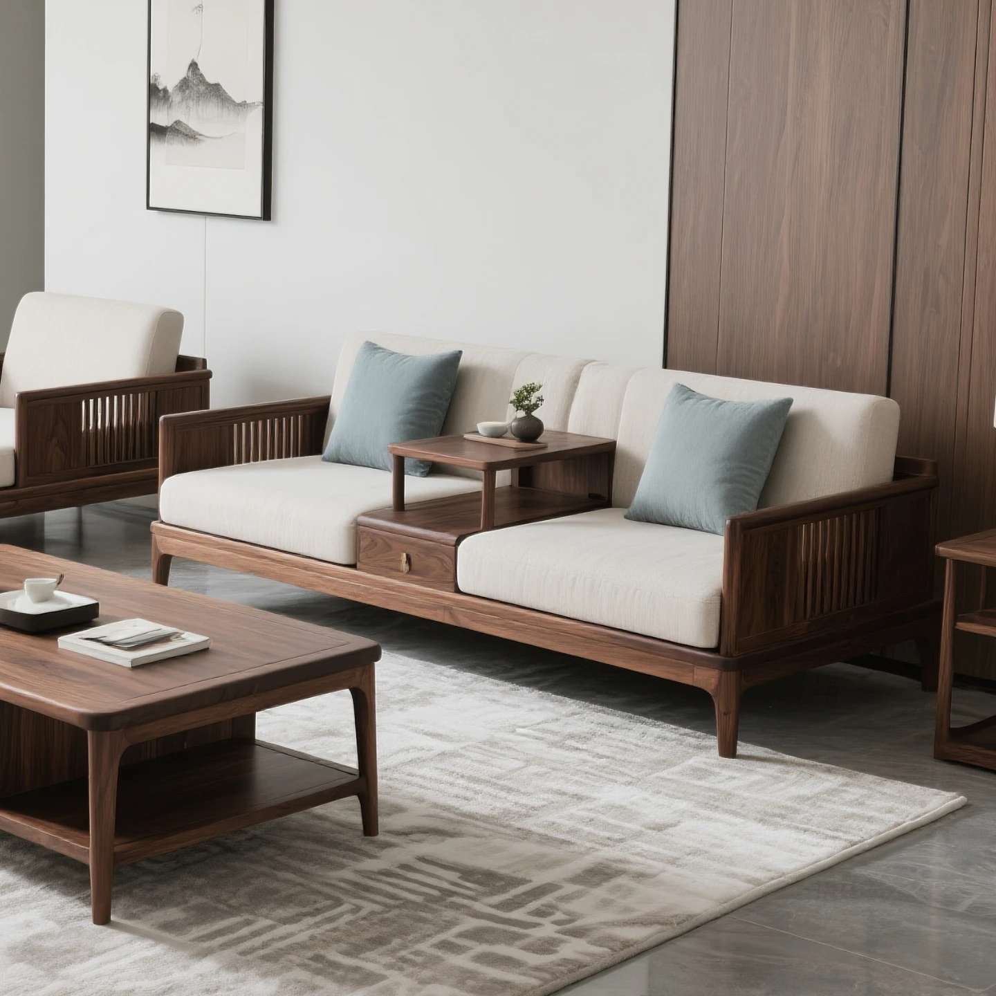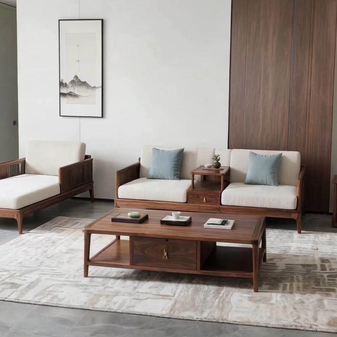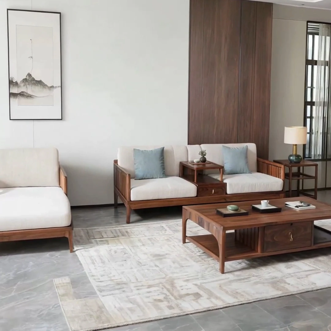 新中式スタイルの北米ブラックウォールナット無垢材ソファセット - 宋の美学を感じる、布製の三人掛けソファとローハンベッドの組み合わせで、洗練されたリビング空間を演出します。