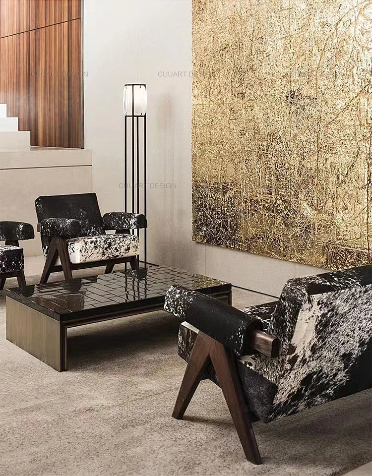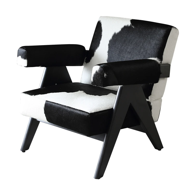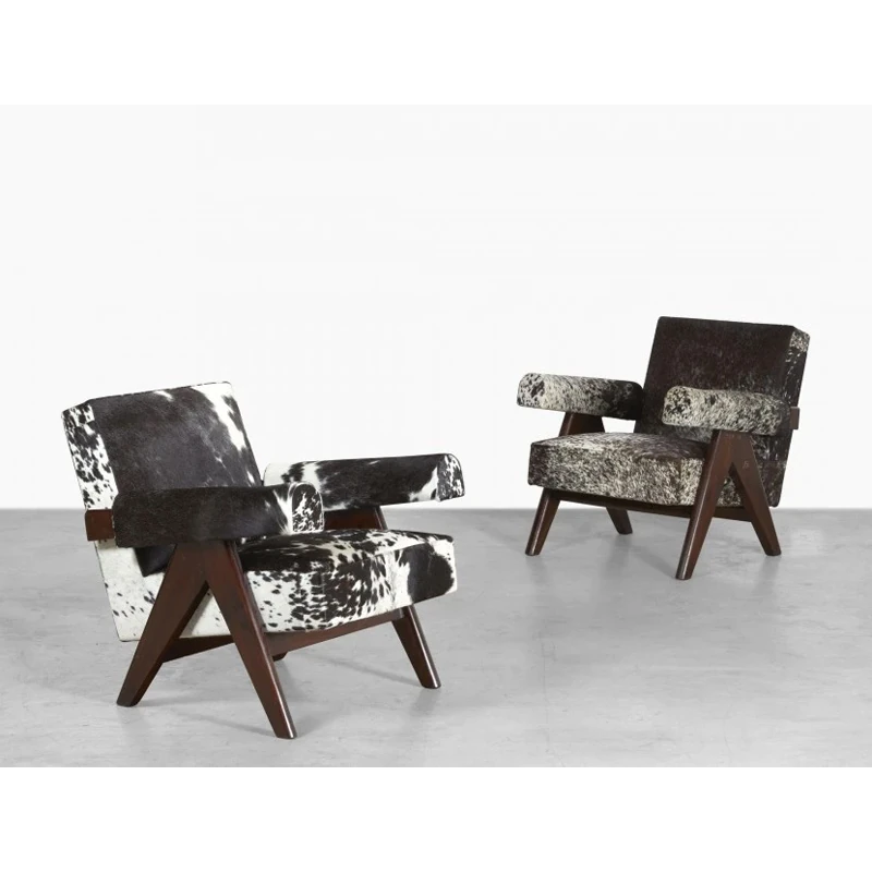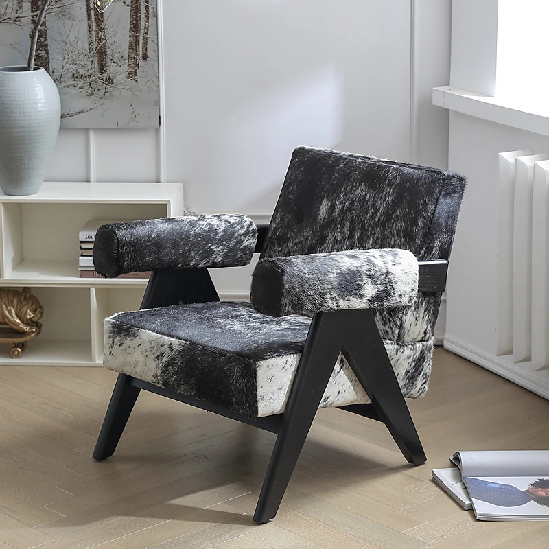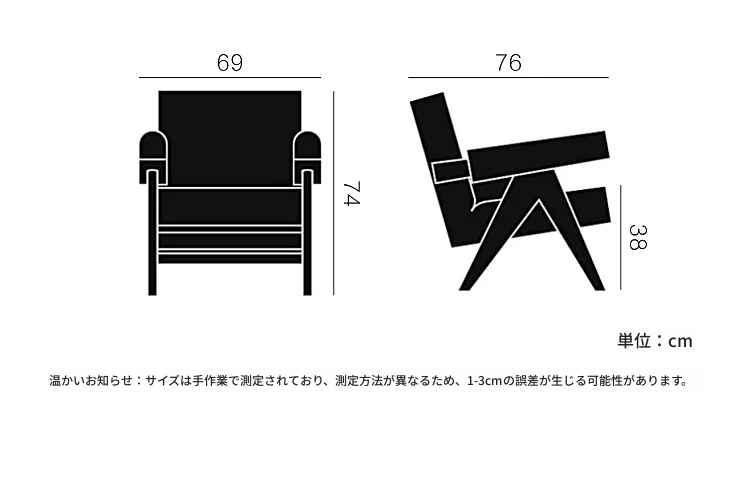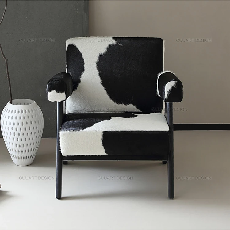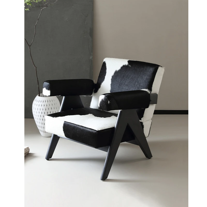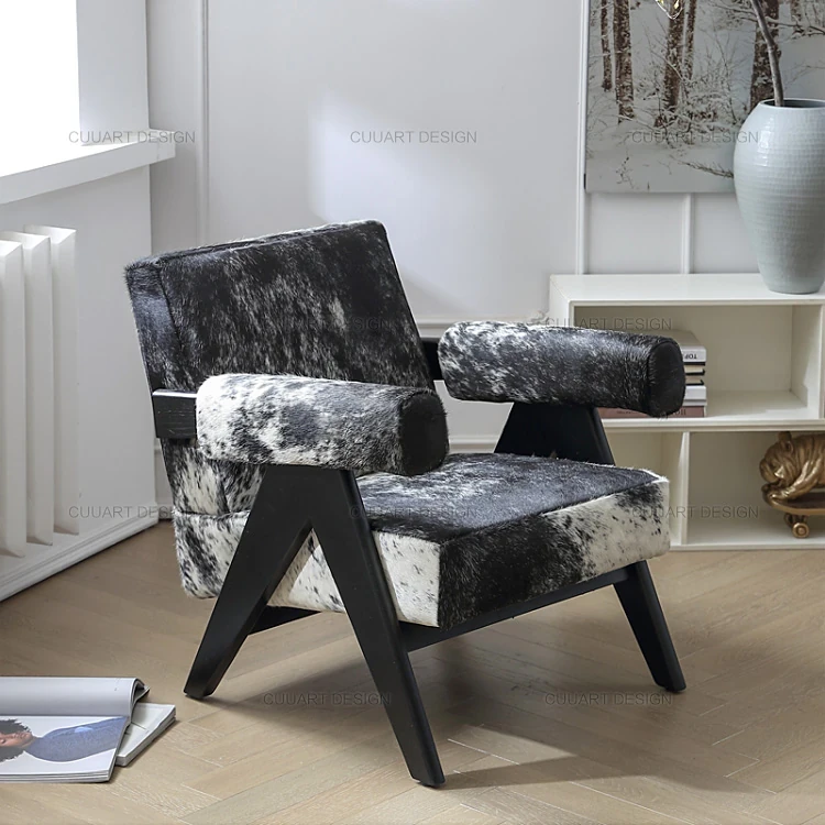 北欧デザインの一人掛けソファチェア - 本革使用、牛革の高級感!チャンディガールスタイルのアームレスト付き、天然木製のリラックスチェアをリビングに!快適さとスタイルを兼ね備えた一品。