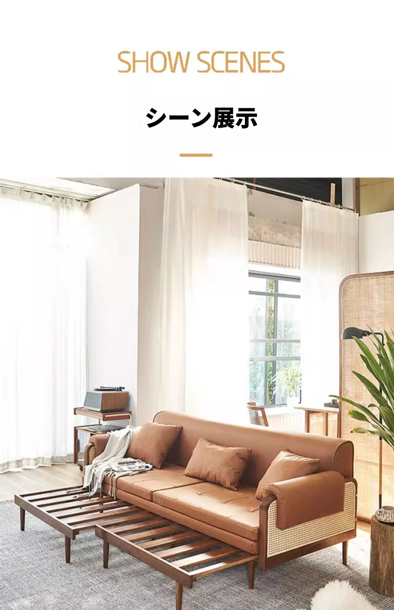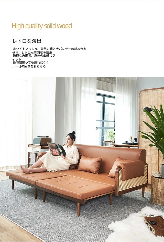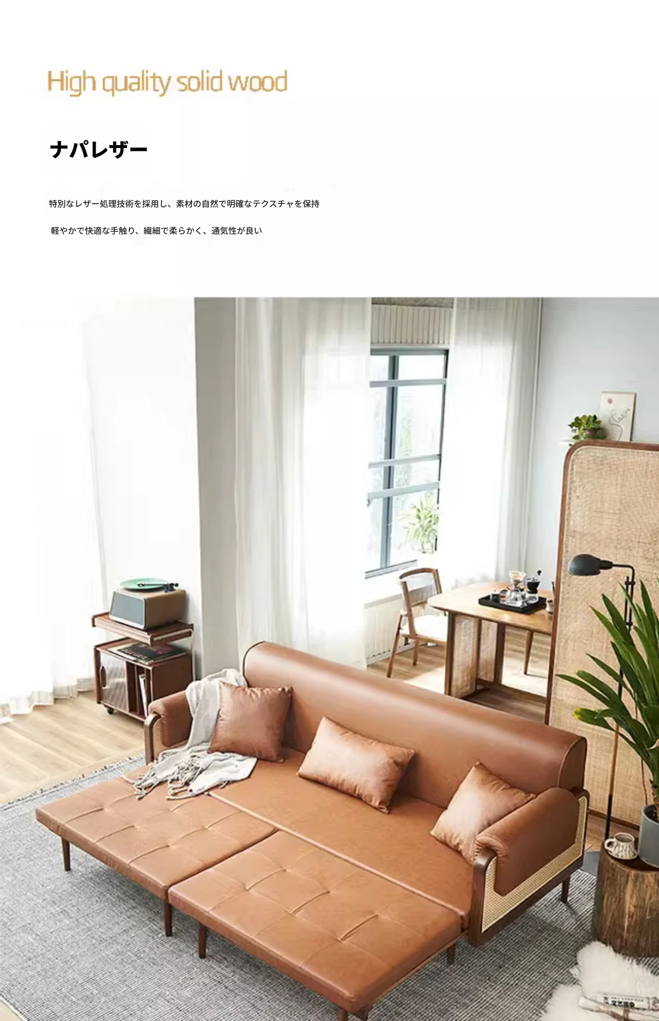 北欧スタイルの天然木ソファベッド - 折りたたみ可能!小さなリビングに最適な3人用多機能、シンプルで伸縮性のあるローハンベッド。限られたスペースでも快適さを実現!