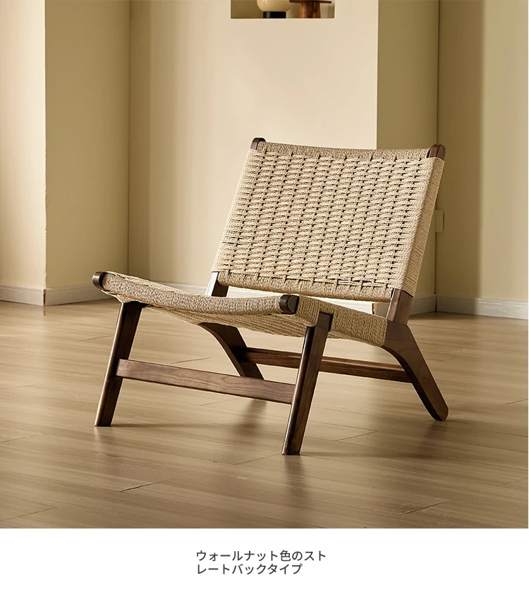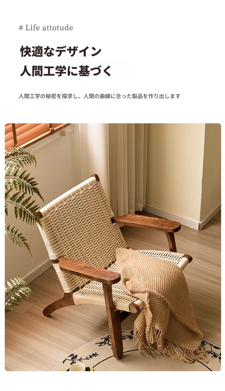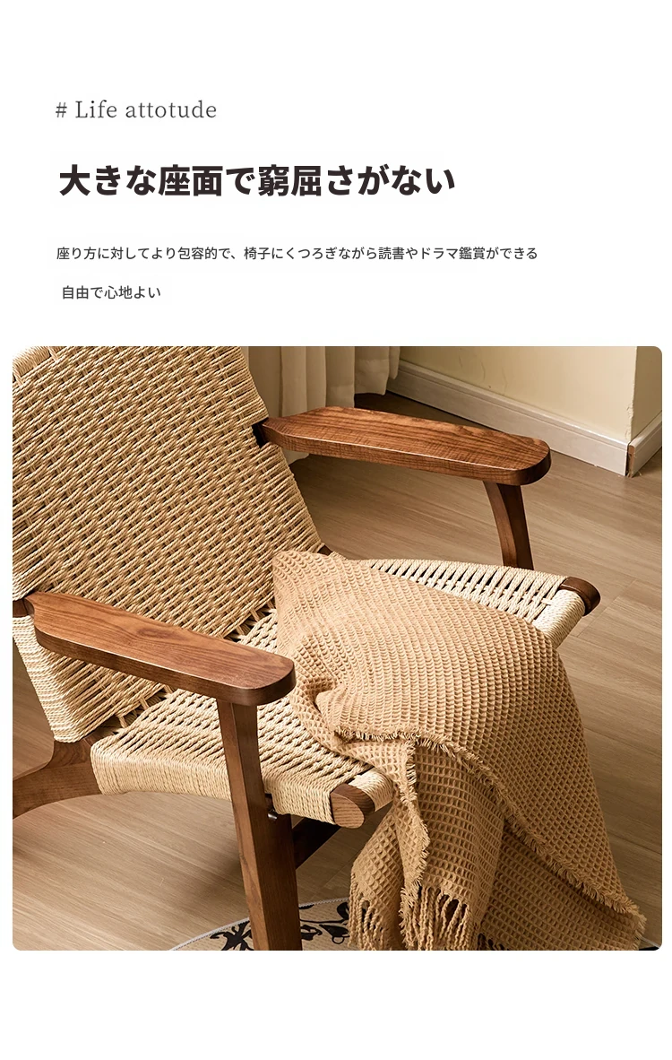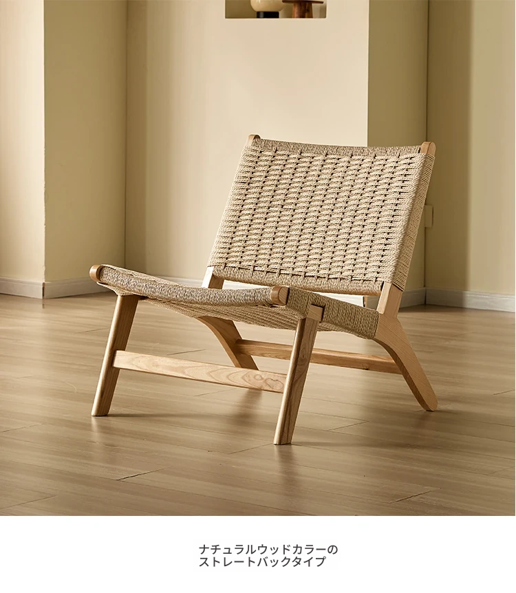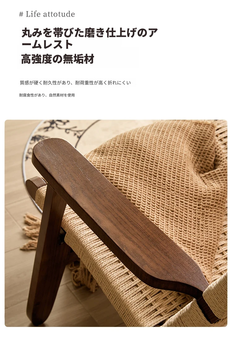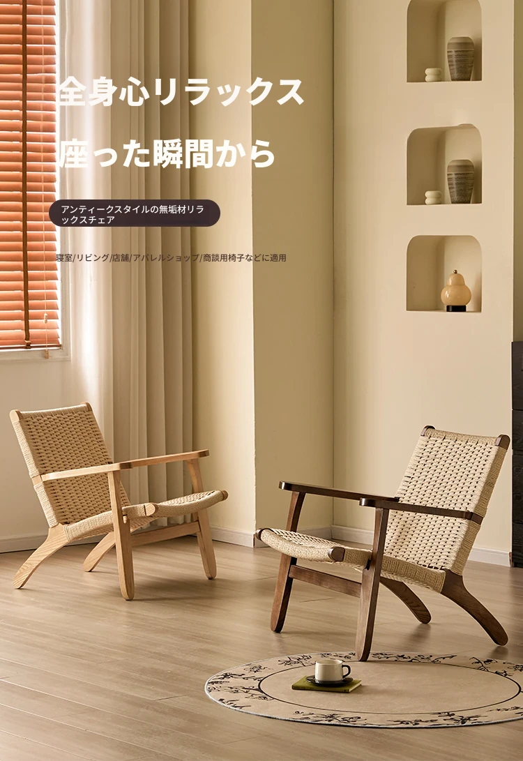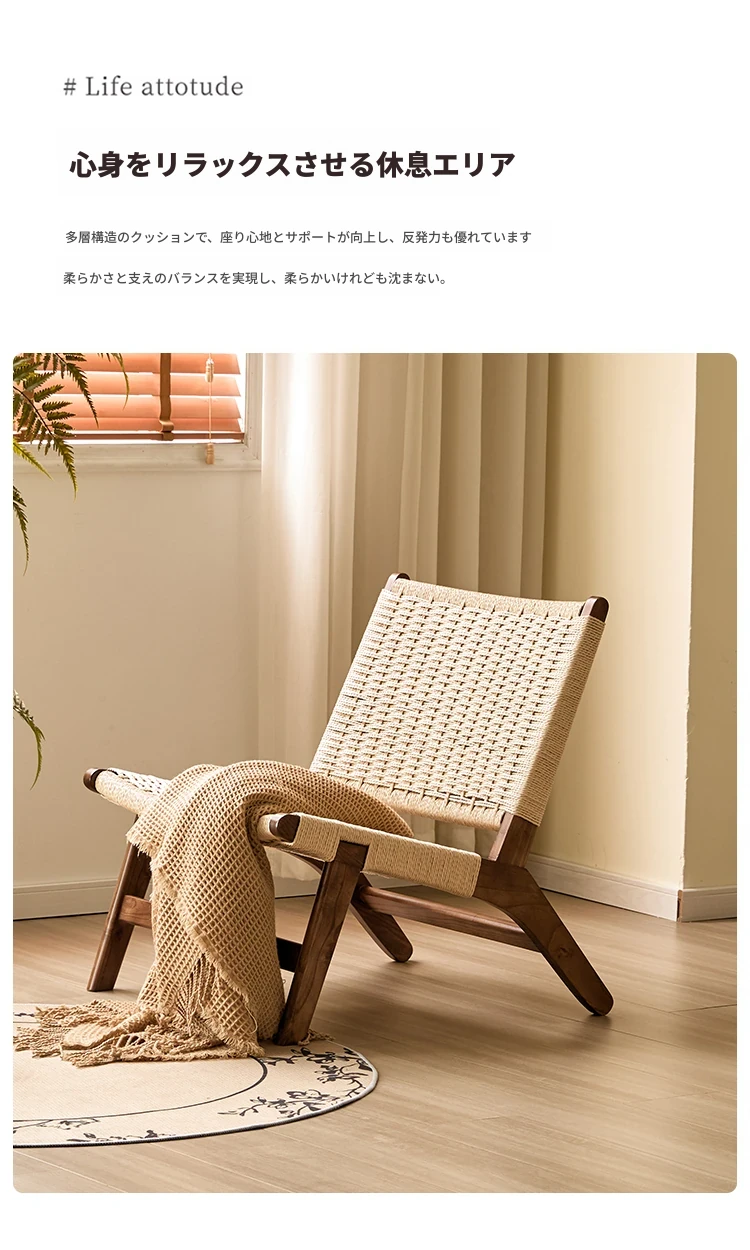 北欧スタイルのロープ編みサドルチェア - ヴィンテージ感溢れる無垢材の一人掛けリラックスチェア。侘び寂びの美学を感じる、レトロな民宿にぴったりな楽々背もたれソファ!
