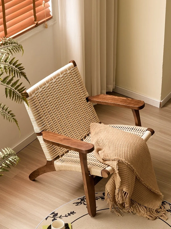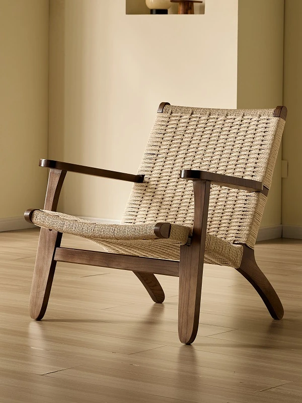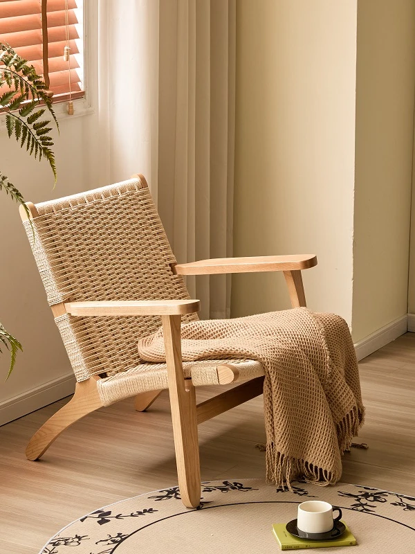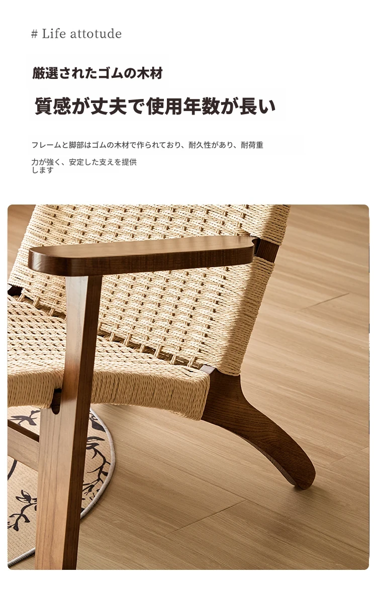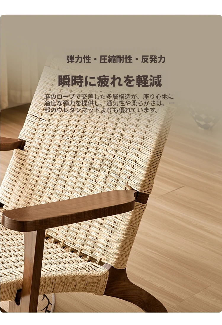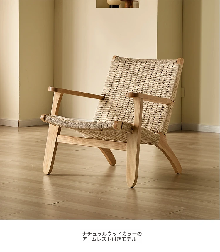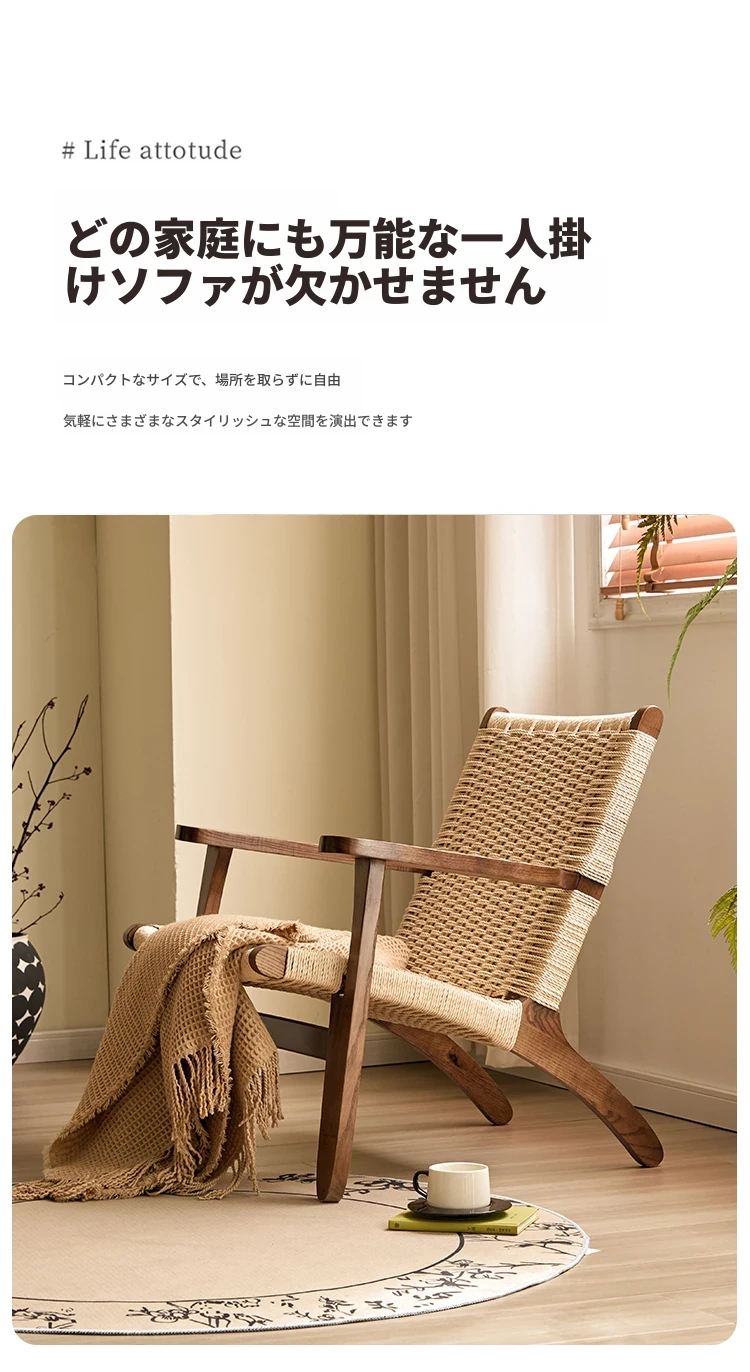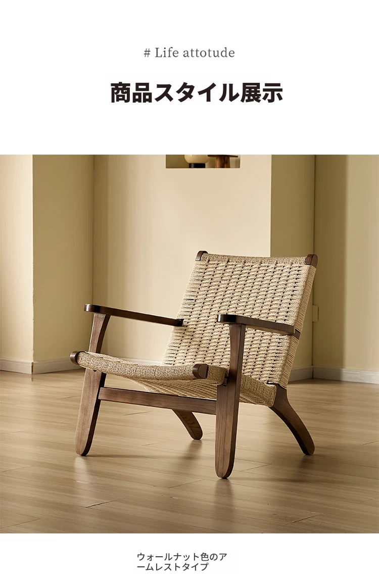 北欧スタイルのロープ編みサドルチェア - ヴィンテージ感溢れる無垢材の一人掛けリラックスチェア。侘び寂びの美学を感じる、レトロな民宿にぴったりな楽々背もたれソファ!
