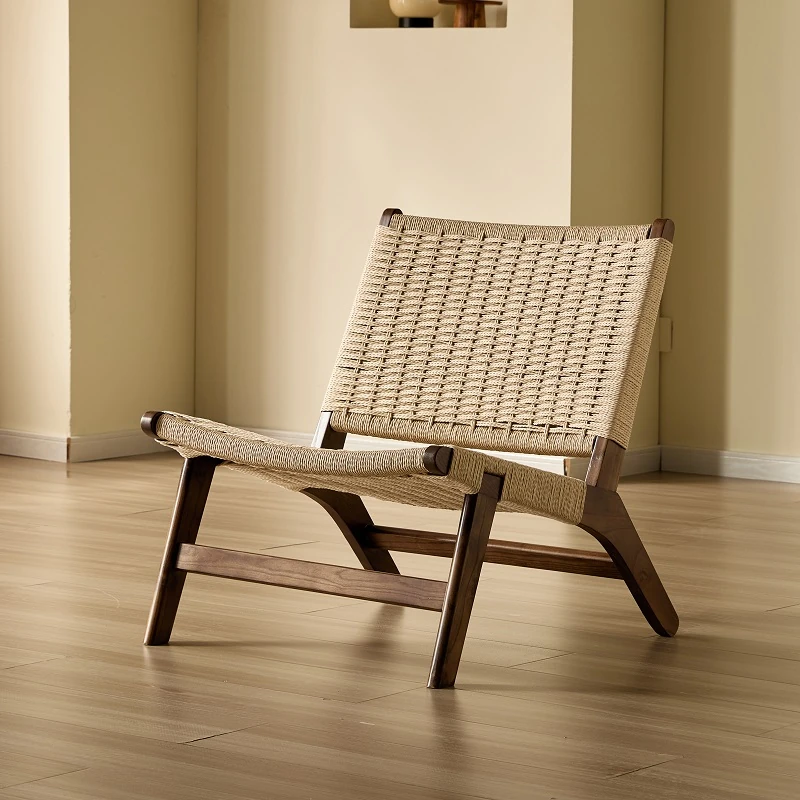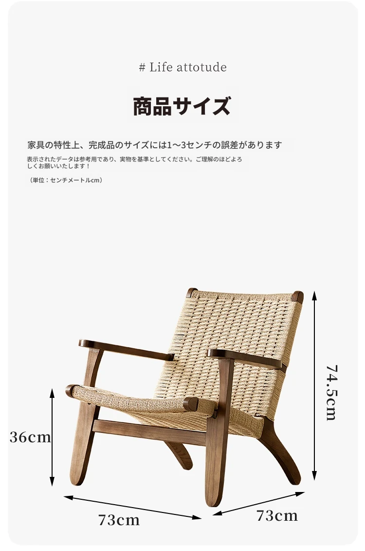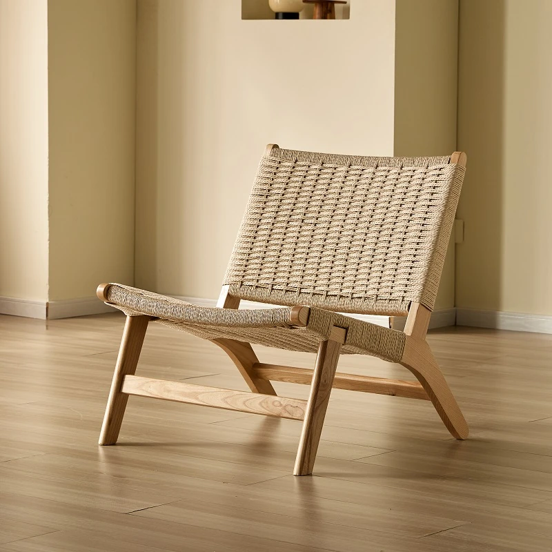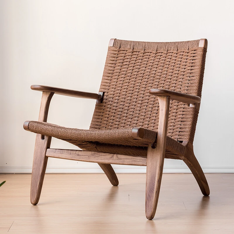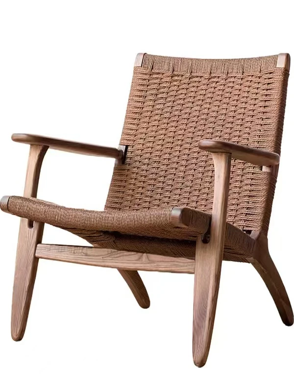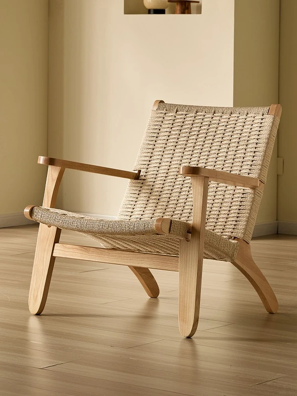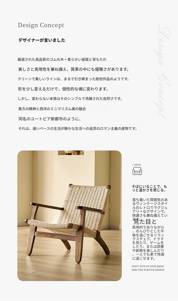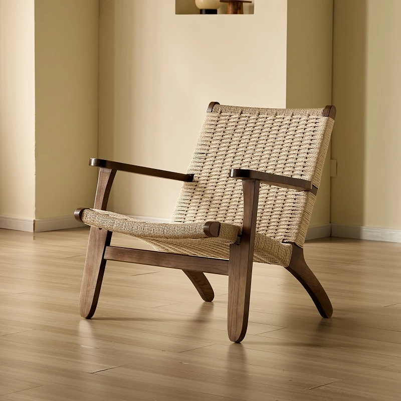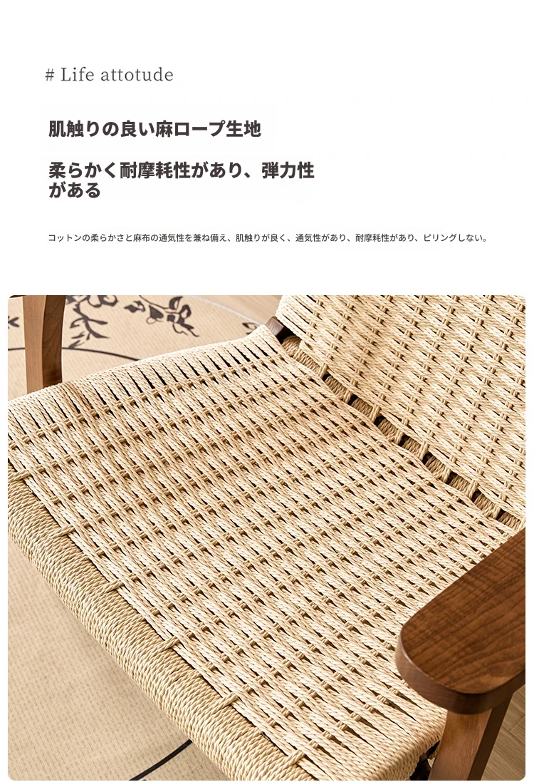北欧スタイルのロープ編みサドルチェア - ヴィンテージ感溢れる無垢材の一人掛けリラックスチェア。侘び寂びの美学を感じる、レトロな民宿にぴったりな楽々背もたれソファ!