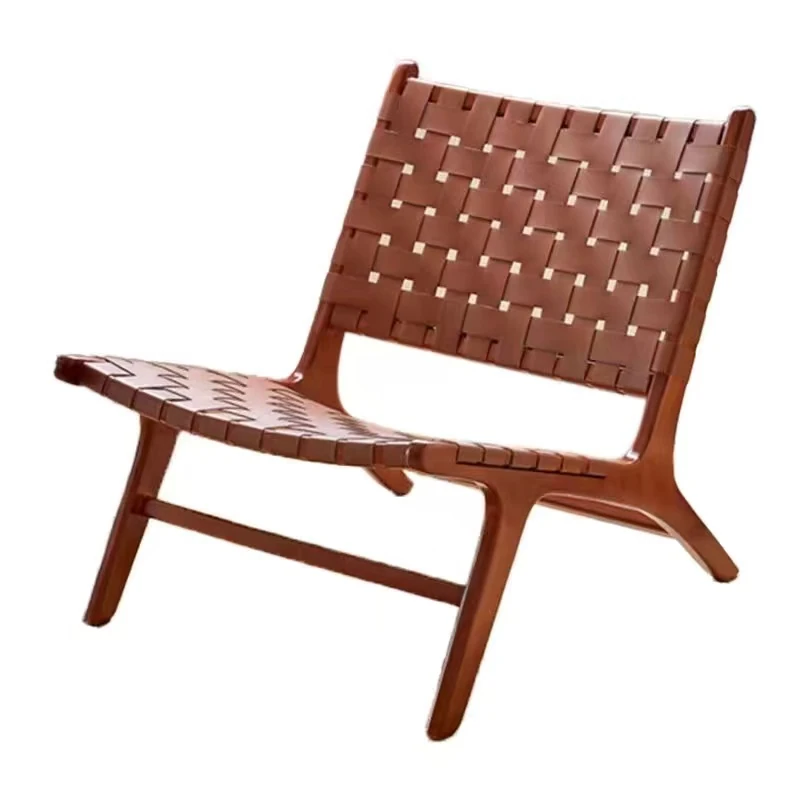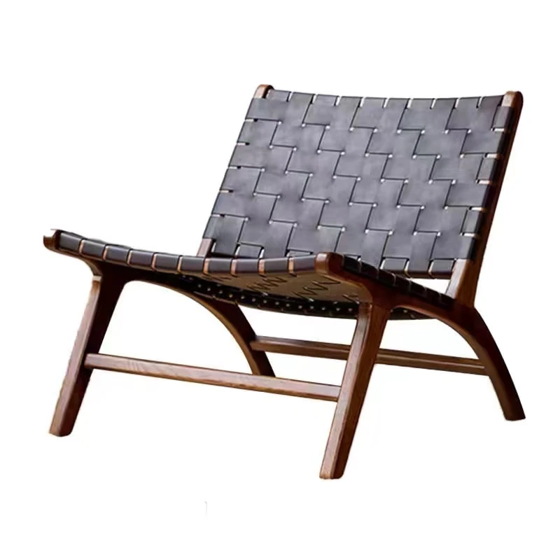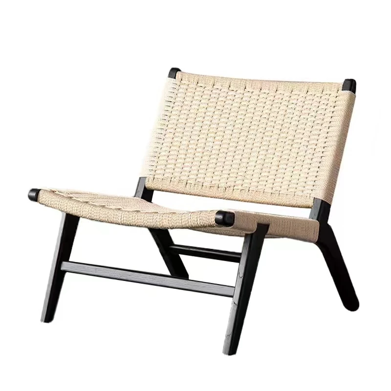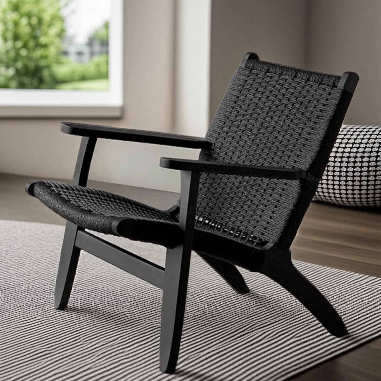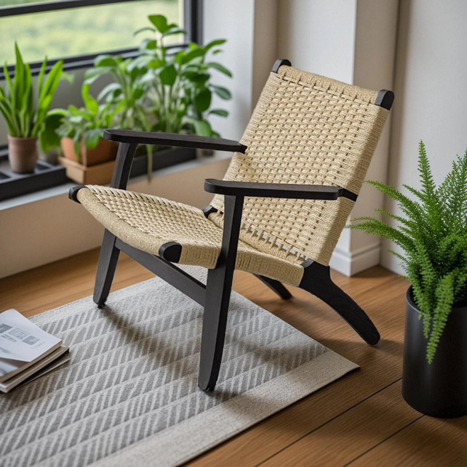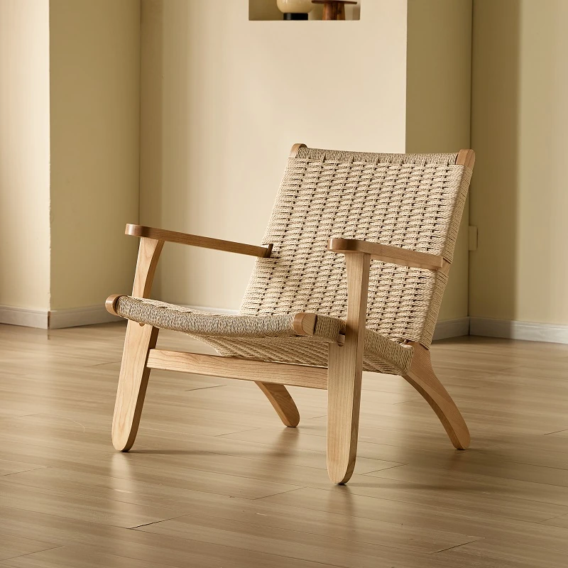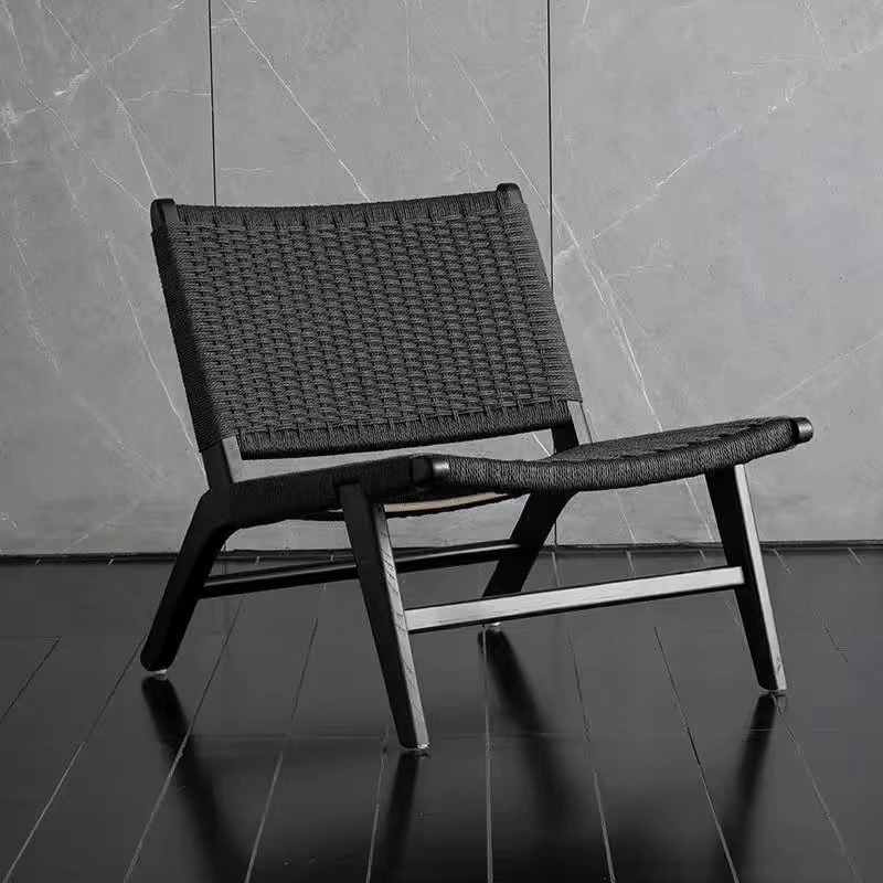 北欧スタイルのロープ編みサドルチェア - ヴィンテージ感溢れる無垢材の一人掛けリラックスチェア。侘び寂びの美学を感じる、レトロな民宿にぴったりな楽々背もたれソファ!
