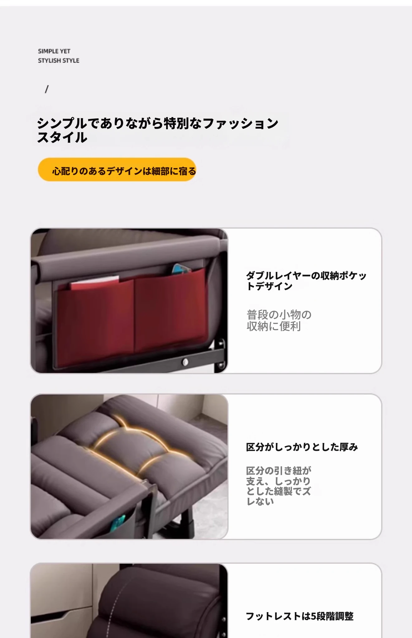 オレンジ【洗濯不要テクノロジー布】支持棒+背もたれ多段階調整 側面アームレストポケット