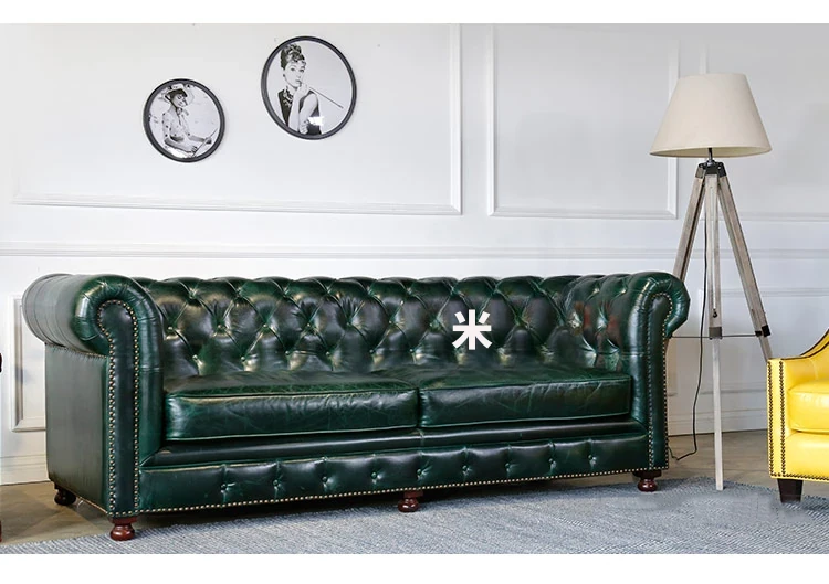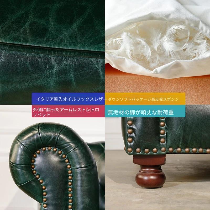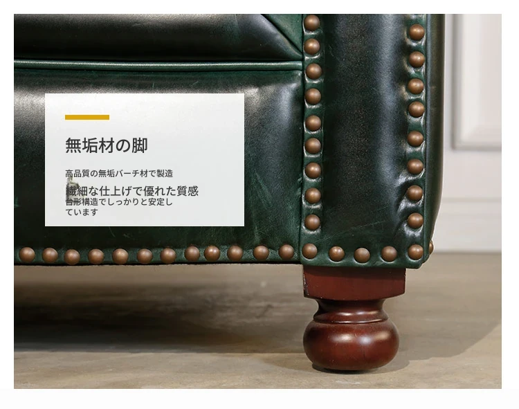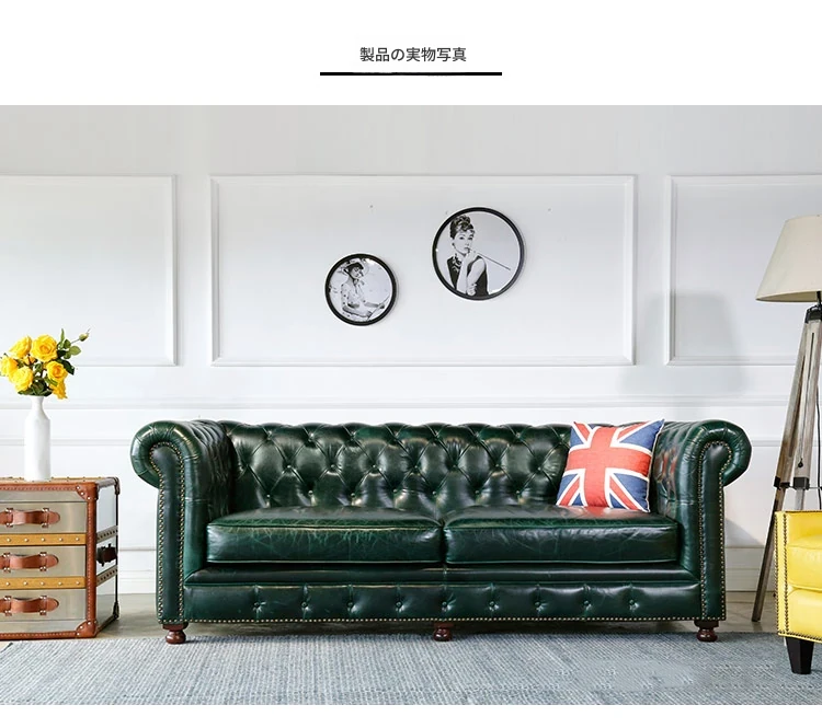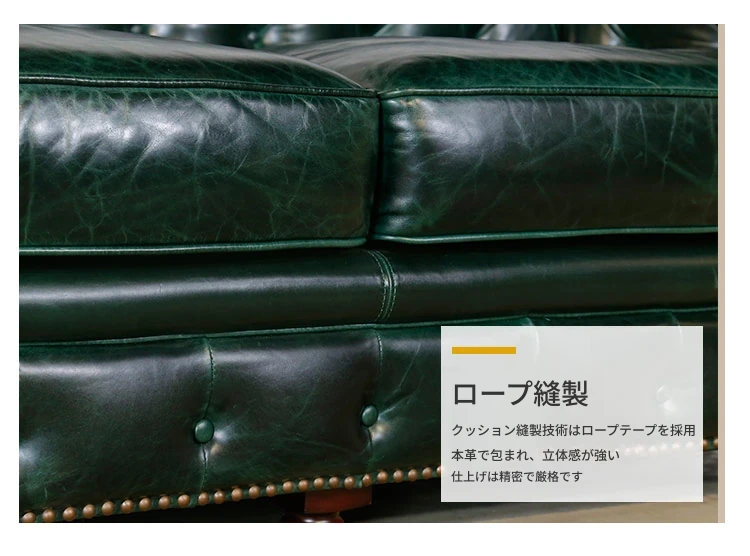 アメリカンレトロのレザーソファー|本革使用|上質なオイルワックス仕上げ|クラシックなシガーバー風デザイン|深みのあるダークグリーン|おしゃれで高級感溢れる空間を演出!