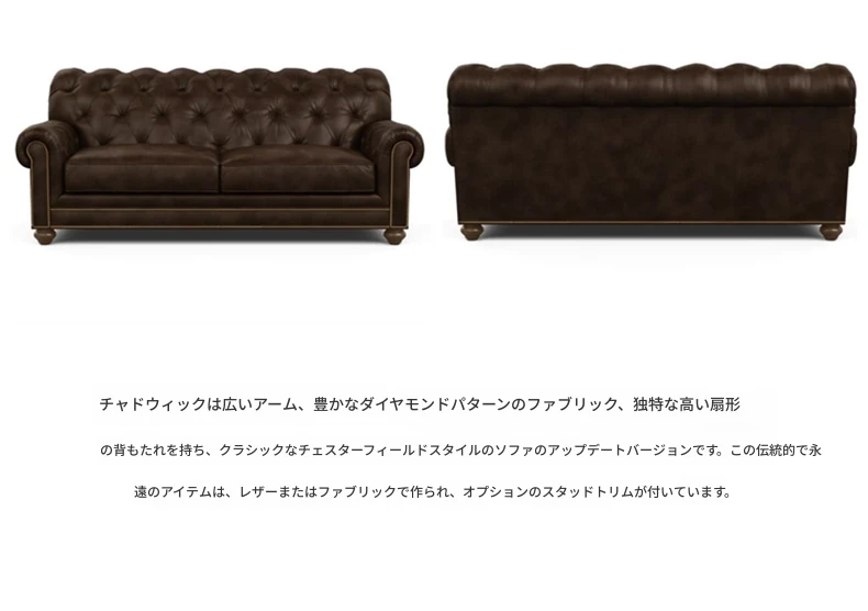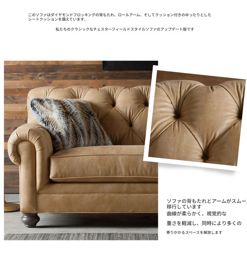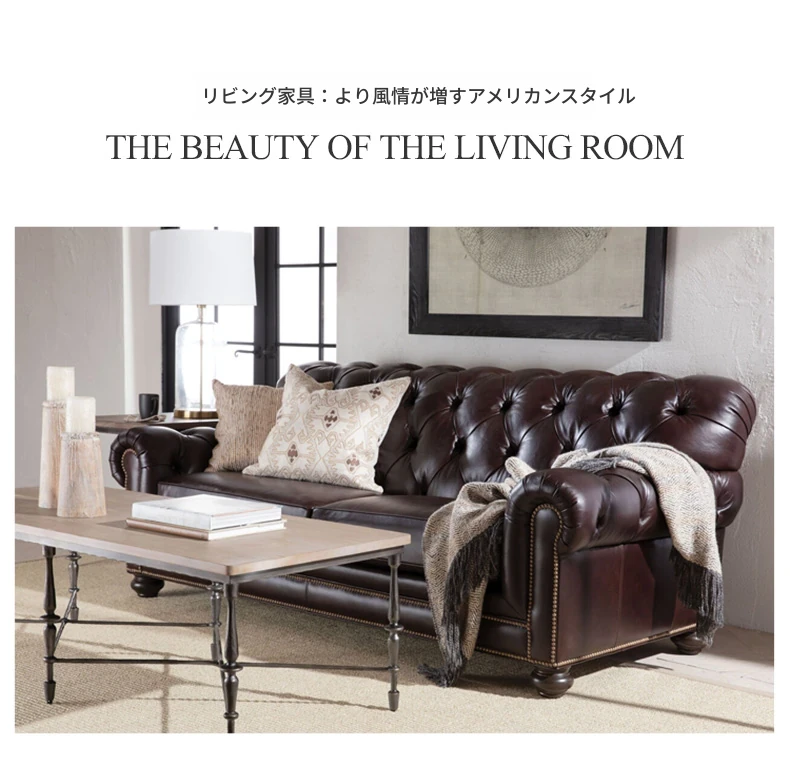 アメリカンビンテージのレザーソファ - フランス風のアンティーク家具、オイルワックス仕上げの牛革使用。リビングやシガーバー、接待室に最適なエレガントなアイテム。おしゃれで贅沢な空間を演出します!