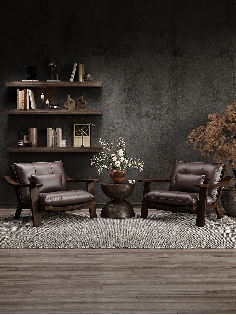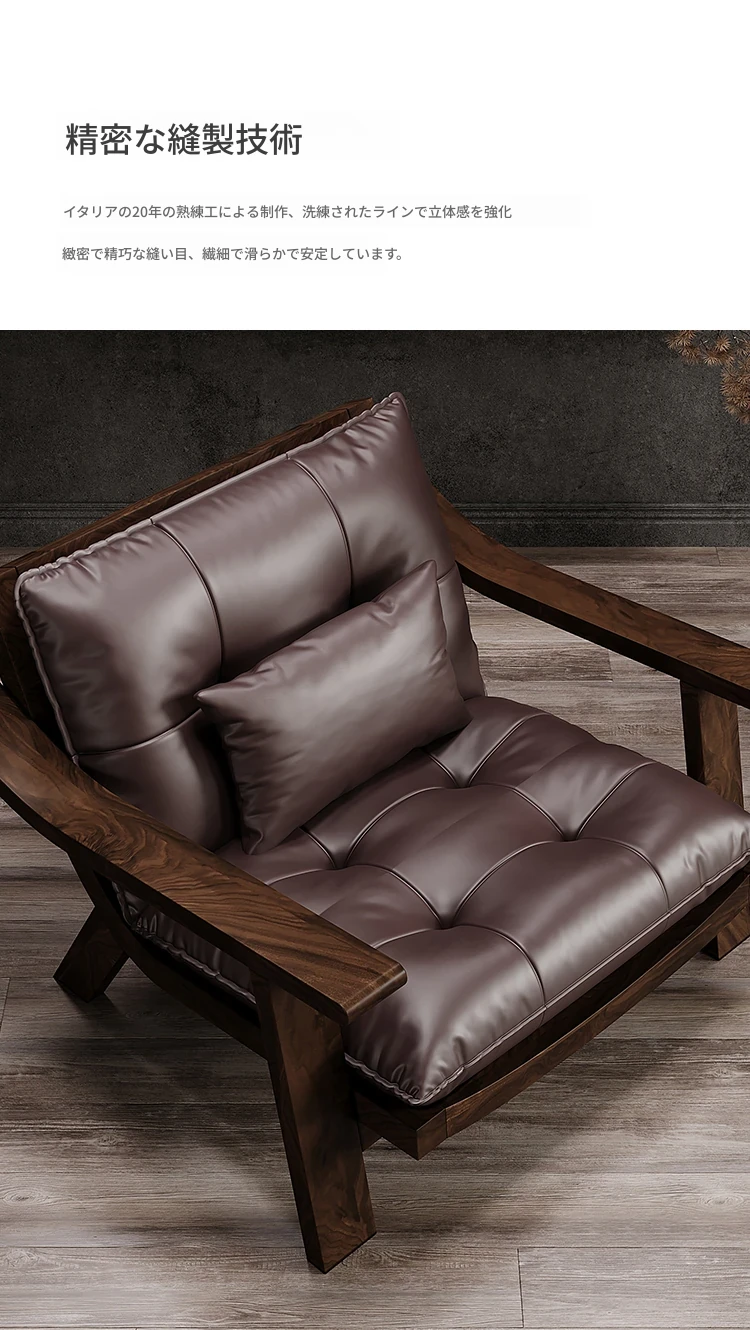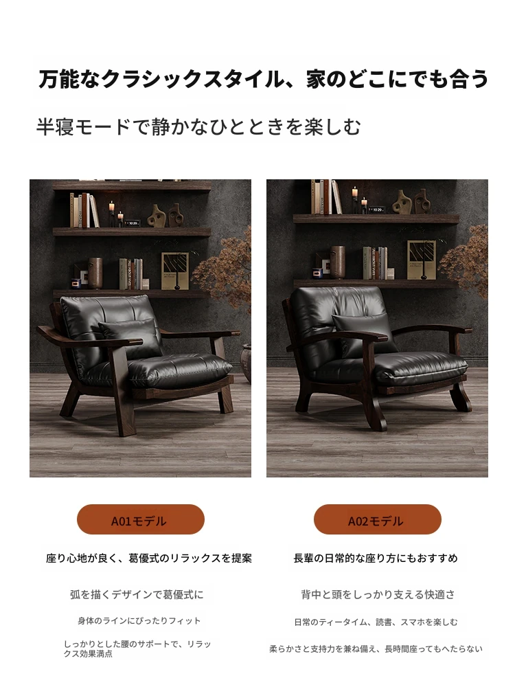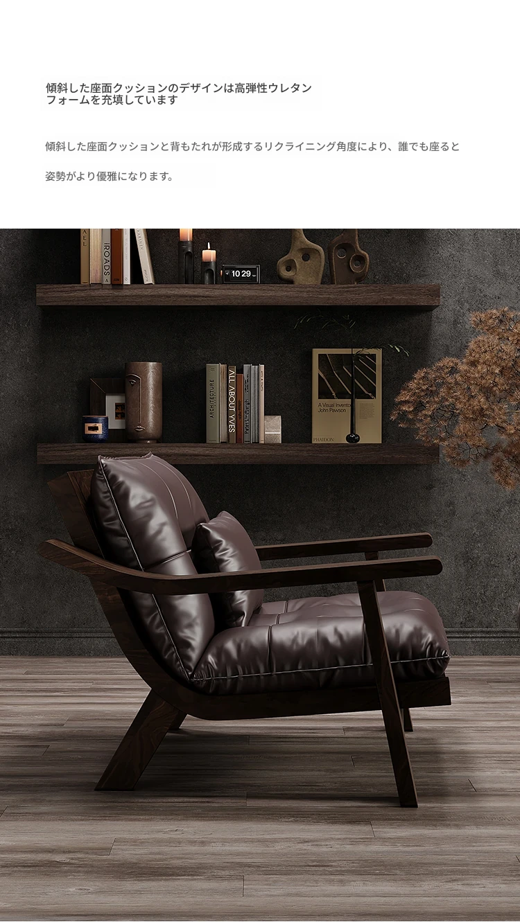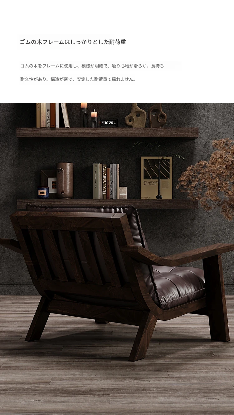 ヴィンテージ風の無垢材リラックスチェア - 本革製のデザイナー一人掛けソファ、ティーチェアとしても最適!背もたれとアームレスト付きで、くつろぎの時間を演出します。どんなインテリアにもマッチするおしゃれなアイテム!